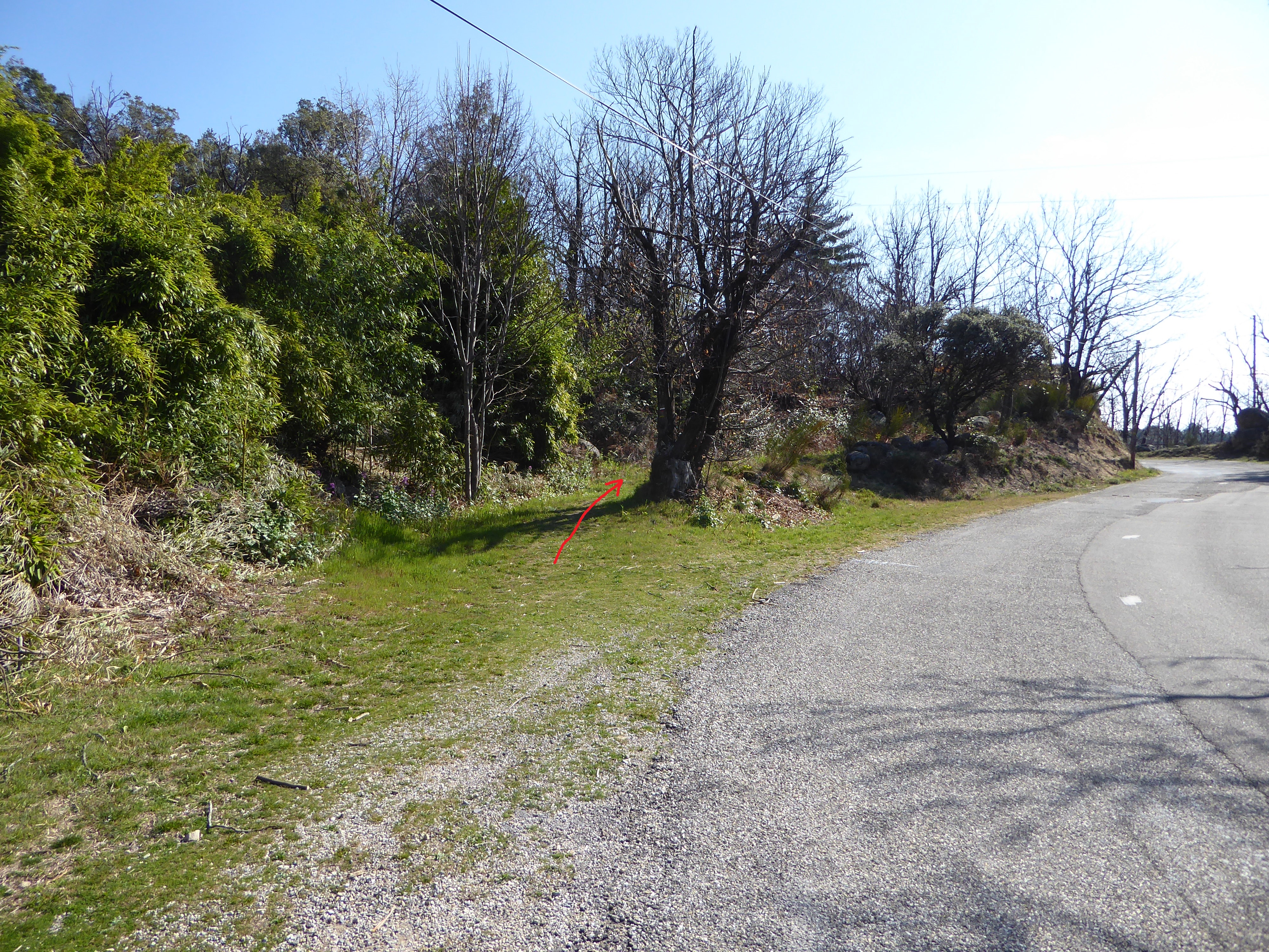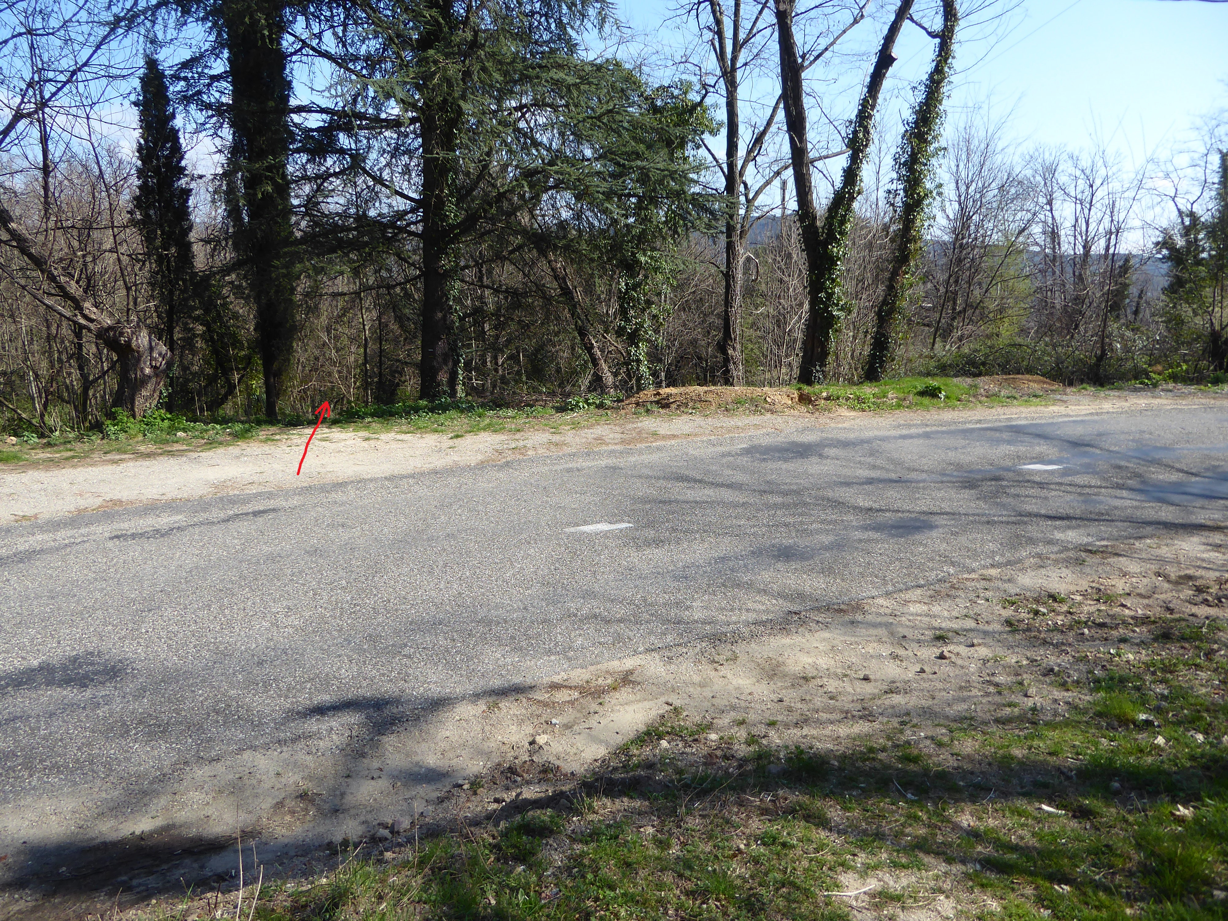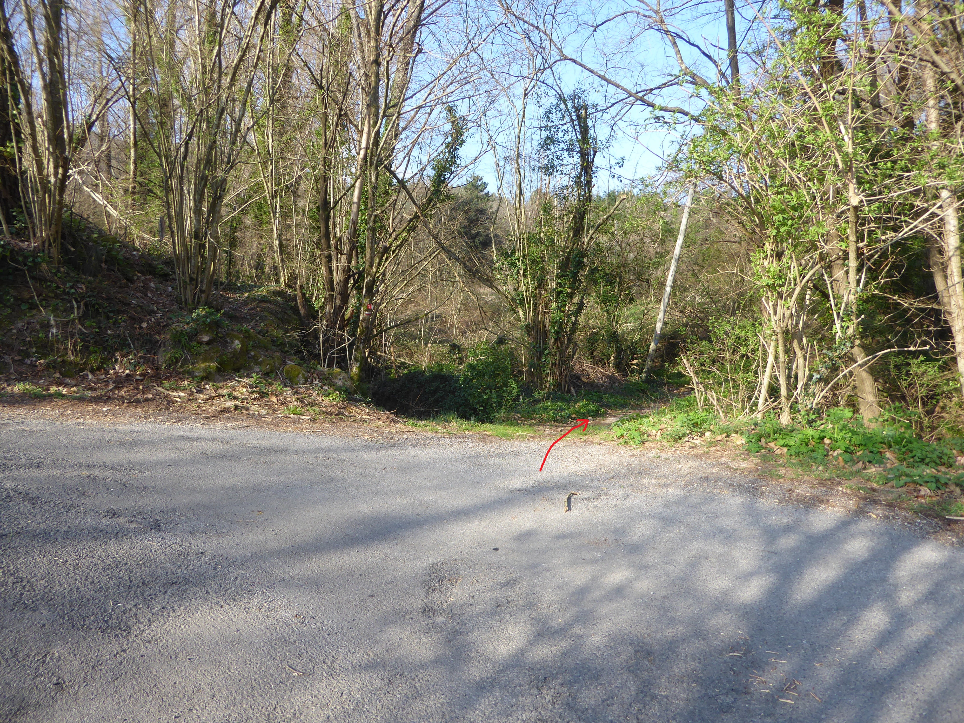 A ce croisement (200 mètres après avoir rejoint la route), suivre le chemin partant légèrement sur la gauche et longeant la route direction Saint-Jean-du-Gard, balisé en rouge et blanc, et jaune