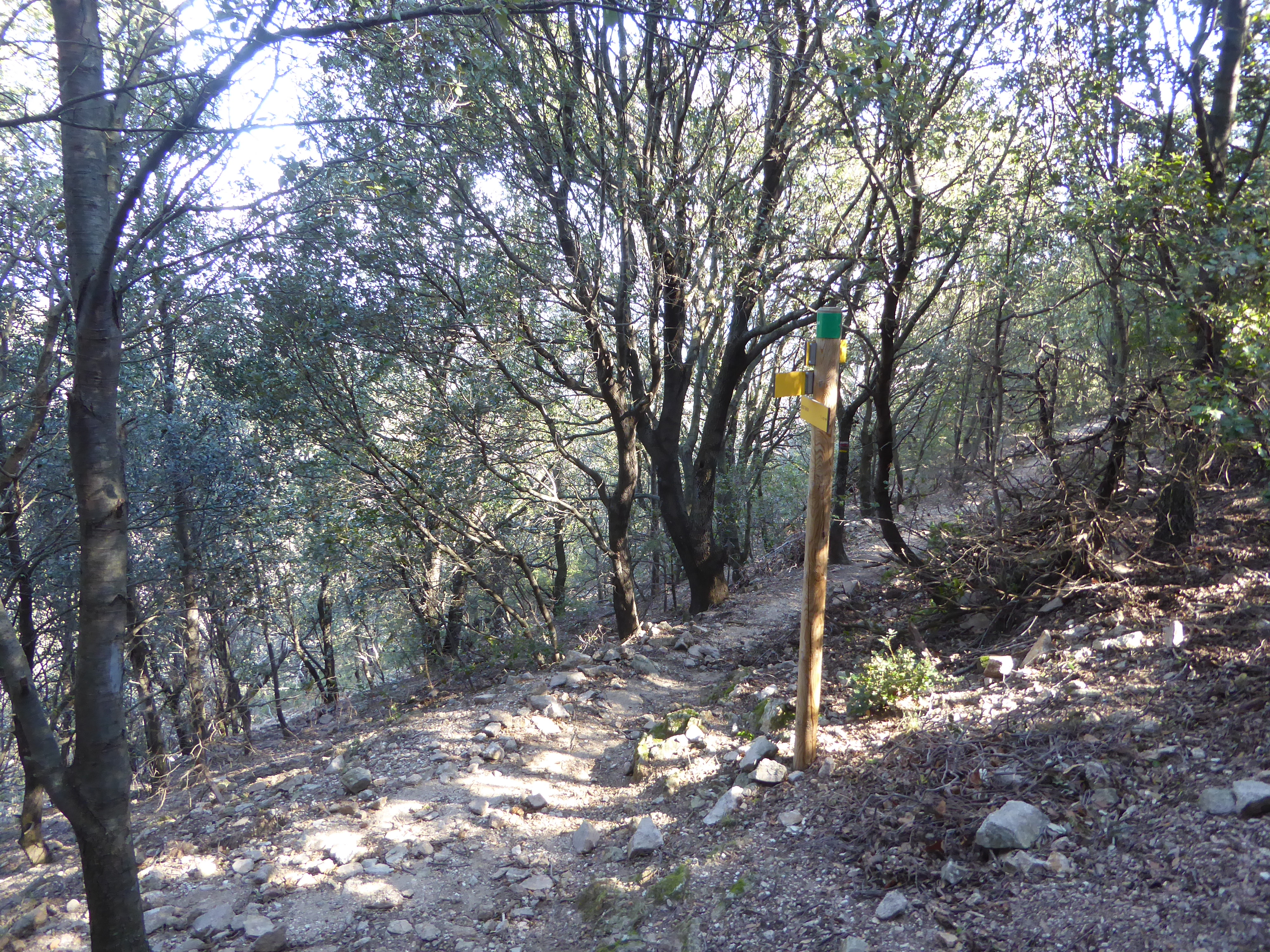 Rochers des Corbeaux (773 m) : suivre le chemin descendant tout droit direction Saint-Jean-du-Gard, balisé en jaune