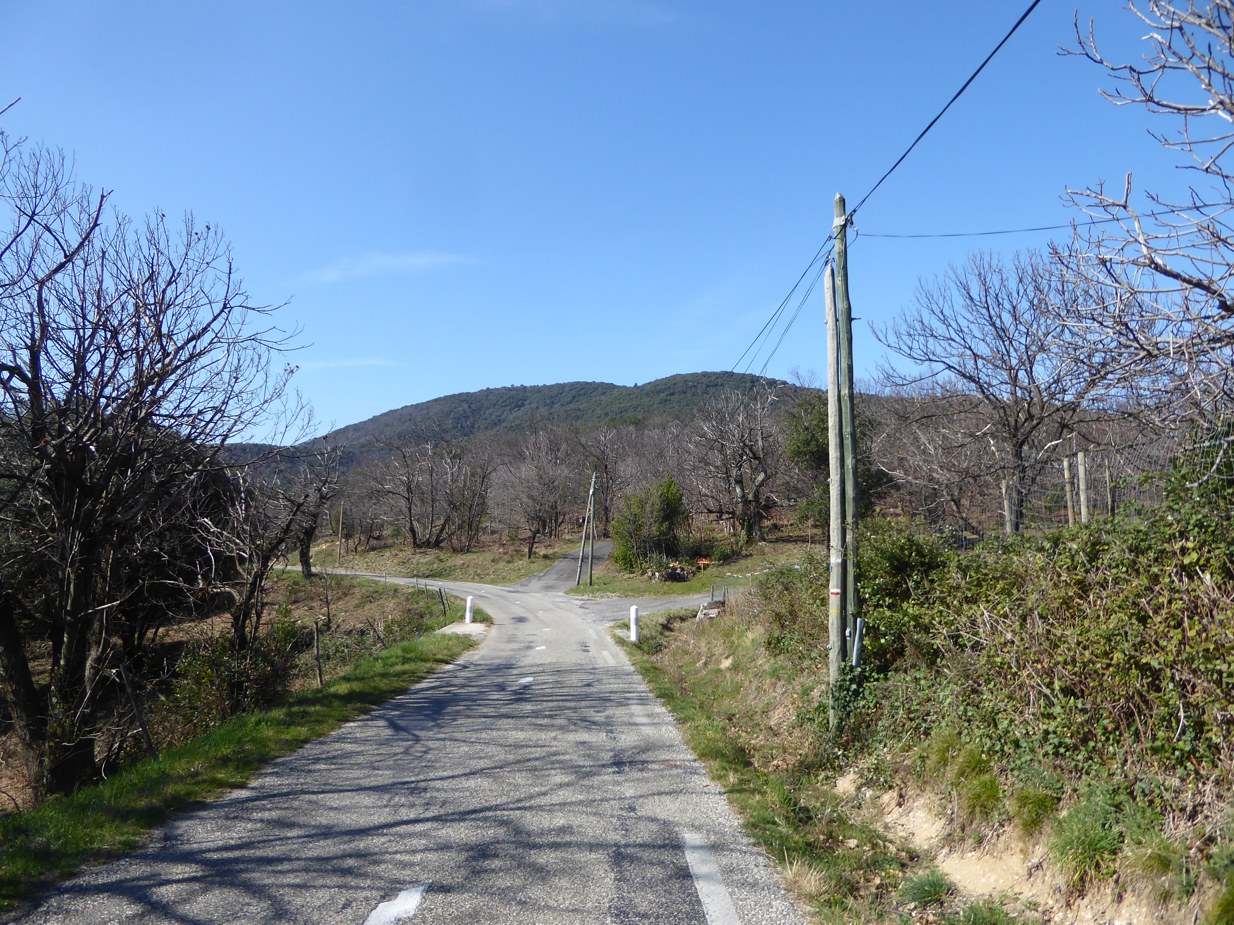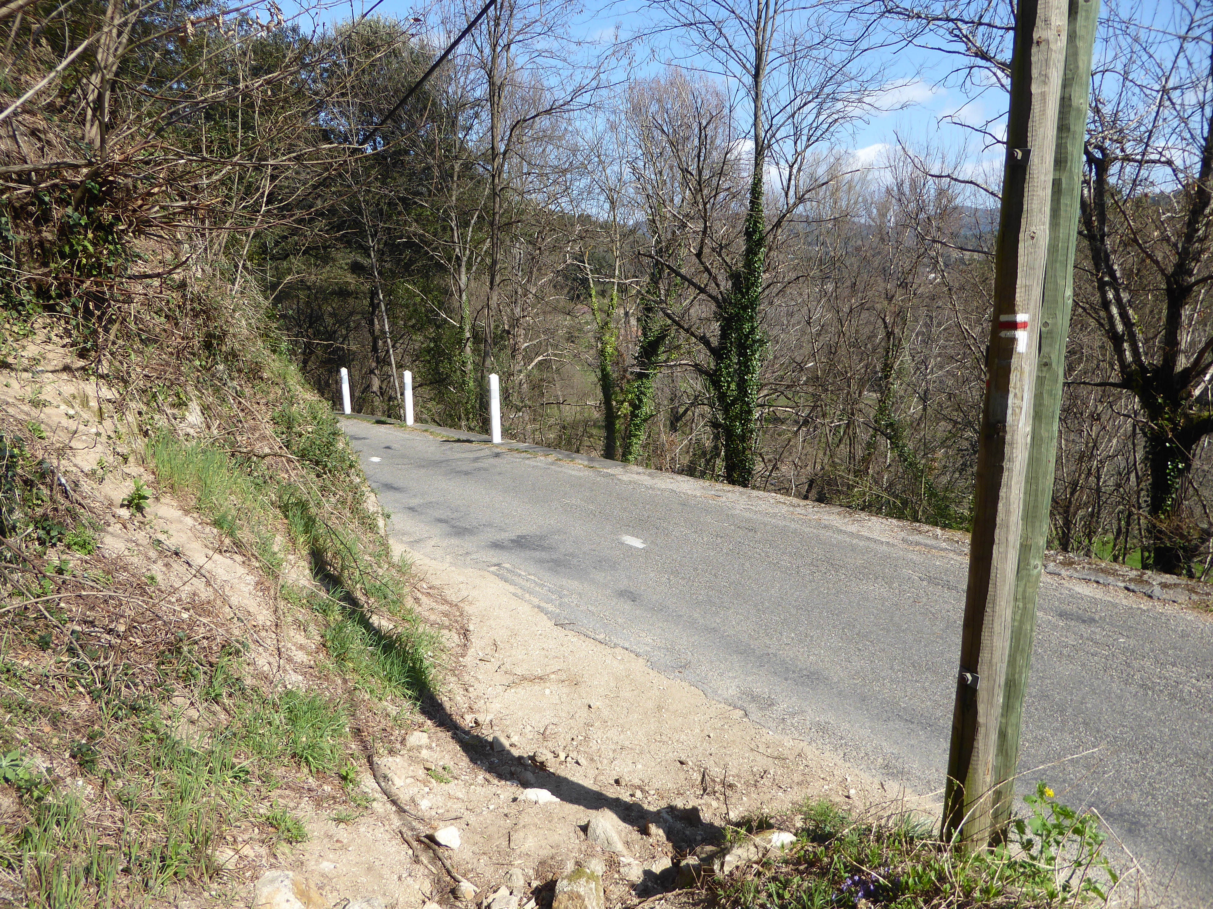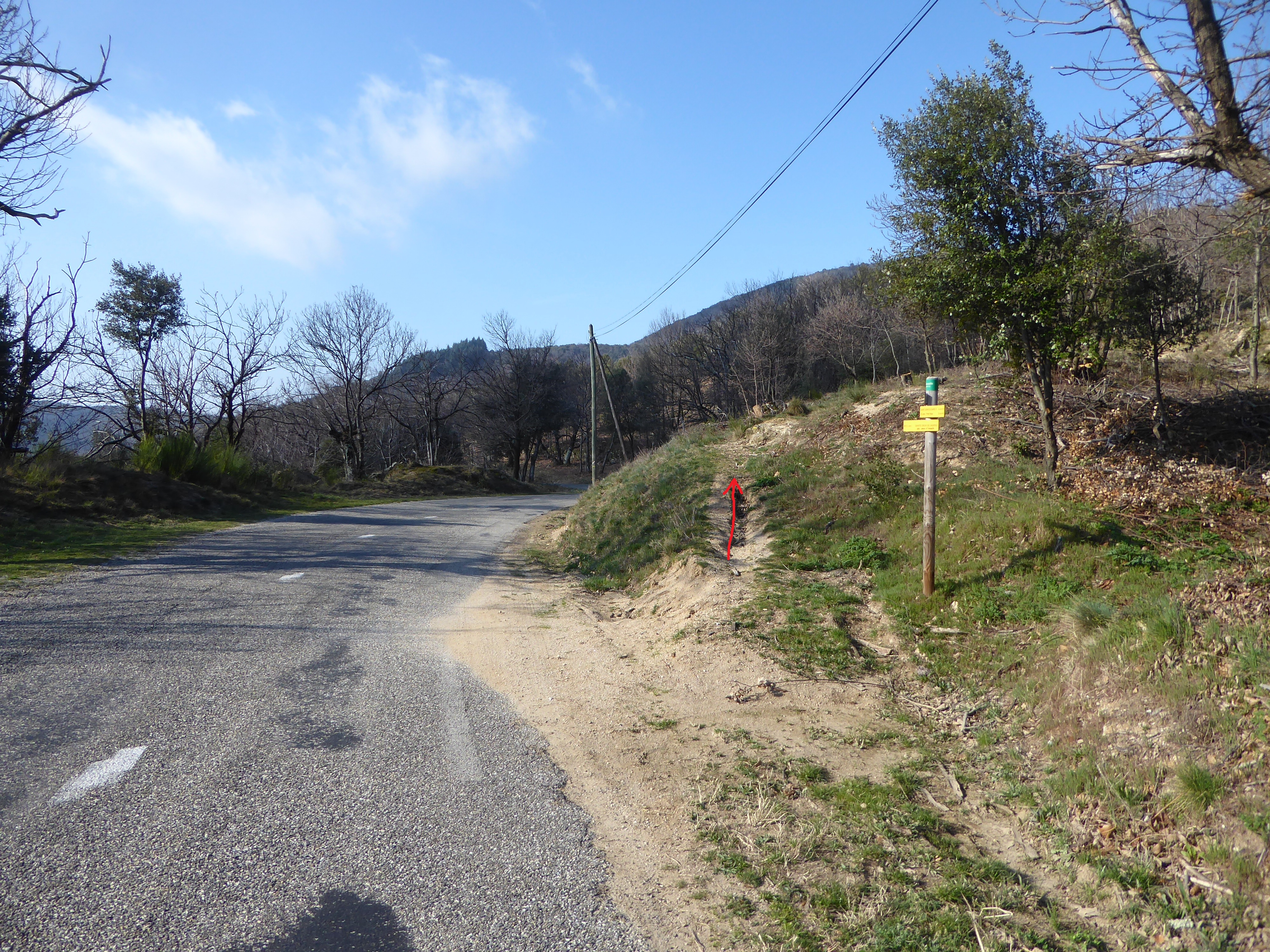 A cet ultime croisement avec la route (400 mètres après le précédent), suivre la route partant tout droit direction Saint-Jean-du-Gard, balisé en rouge et blanc, et jaune