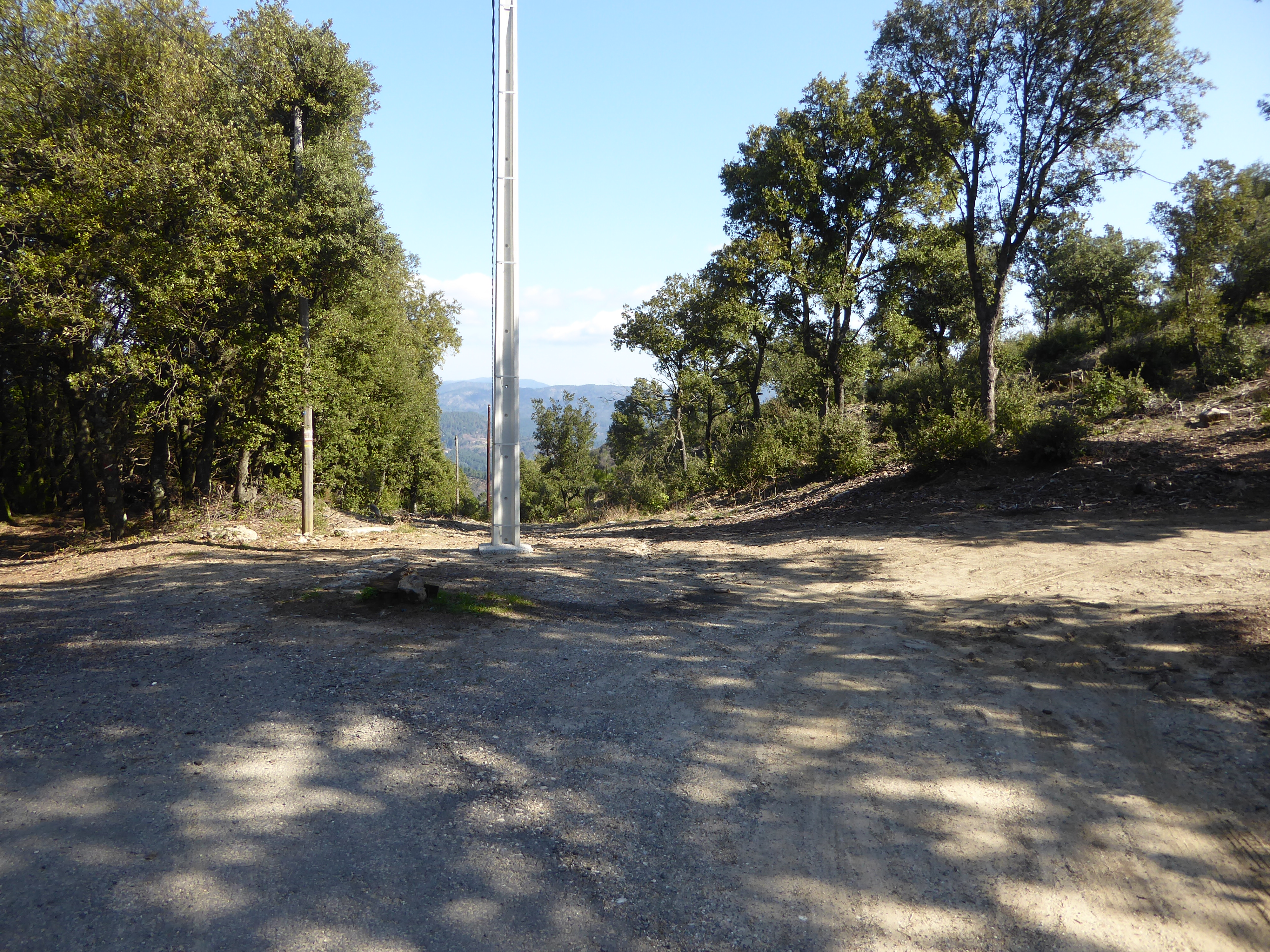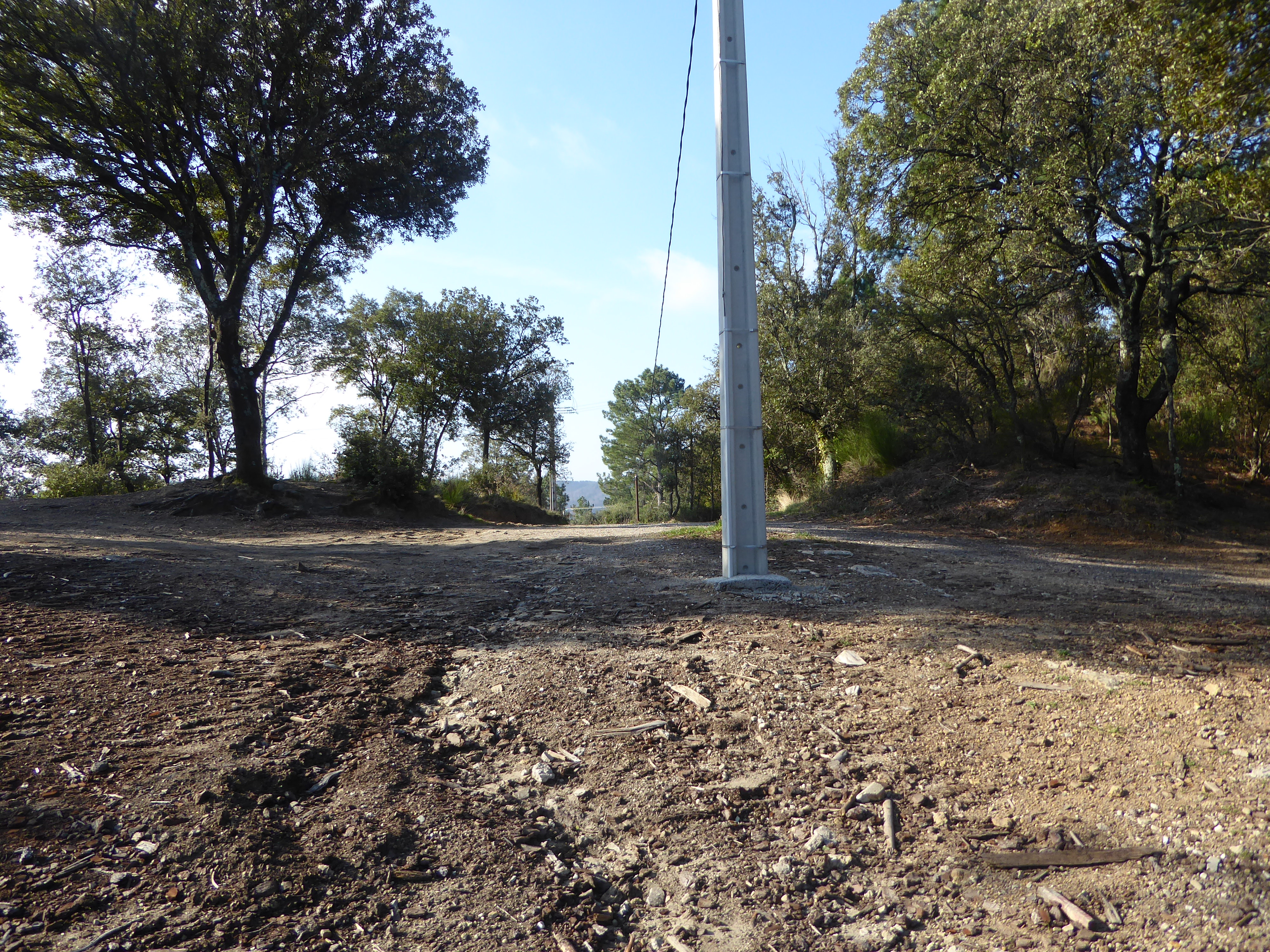 A ce croisement marqué par ce poteau en béton (517 m), suivre le chemin descendant tout droit direction Saint-Jean-du-Gard, balisé en rouge et blanc, et jaune