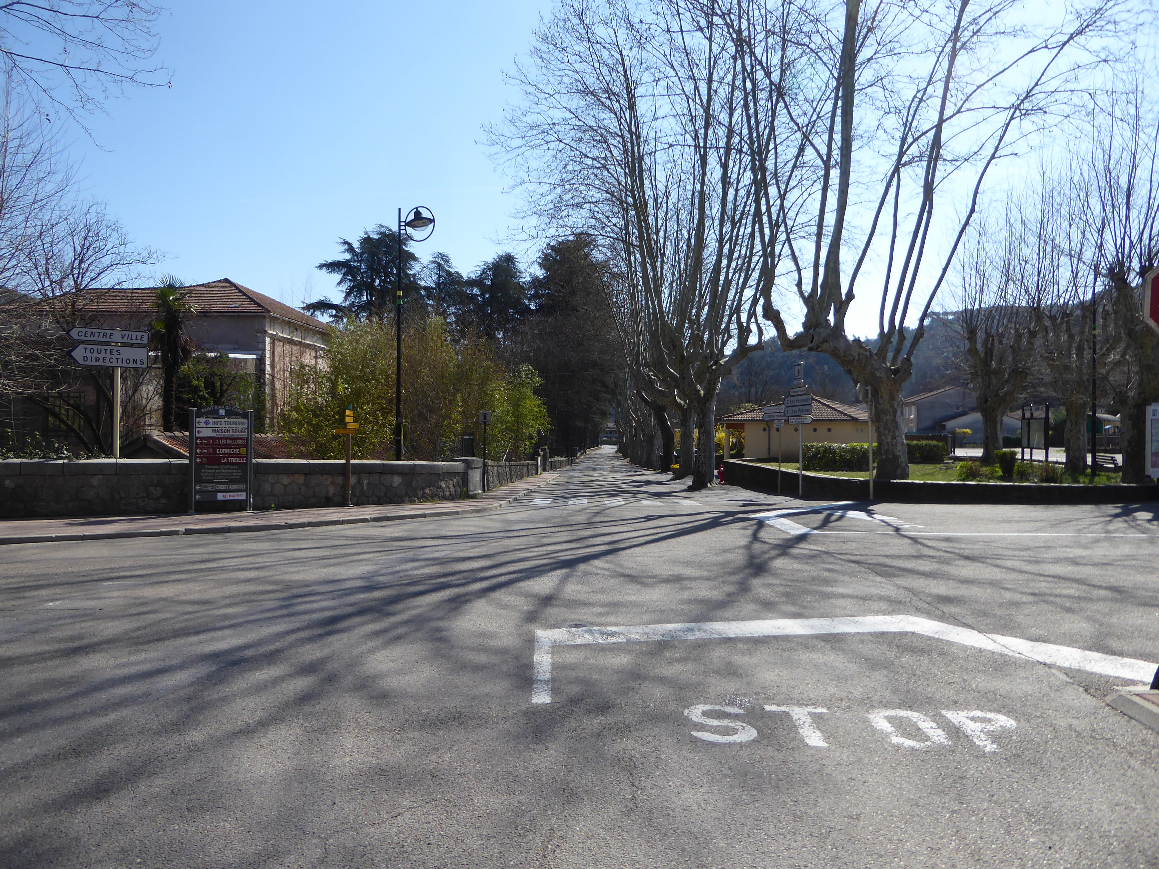 Départ Saint-Jean-du-Gard - Gare (188 m) : suivre la route partant tout droit direction Mont Brion, balisé en rouge et blanc, et jaune