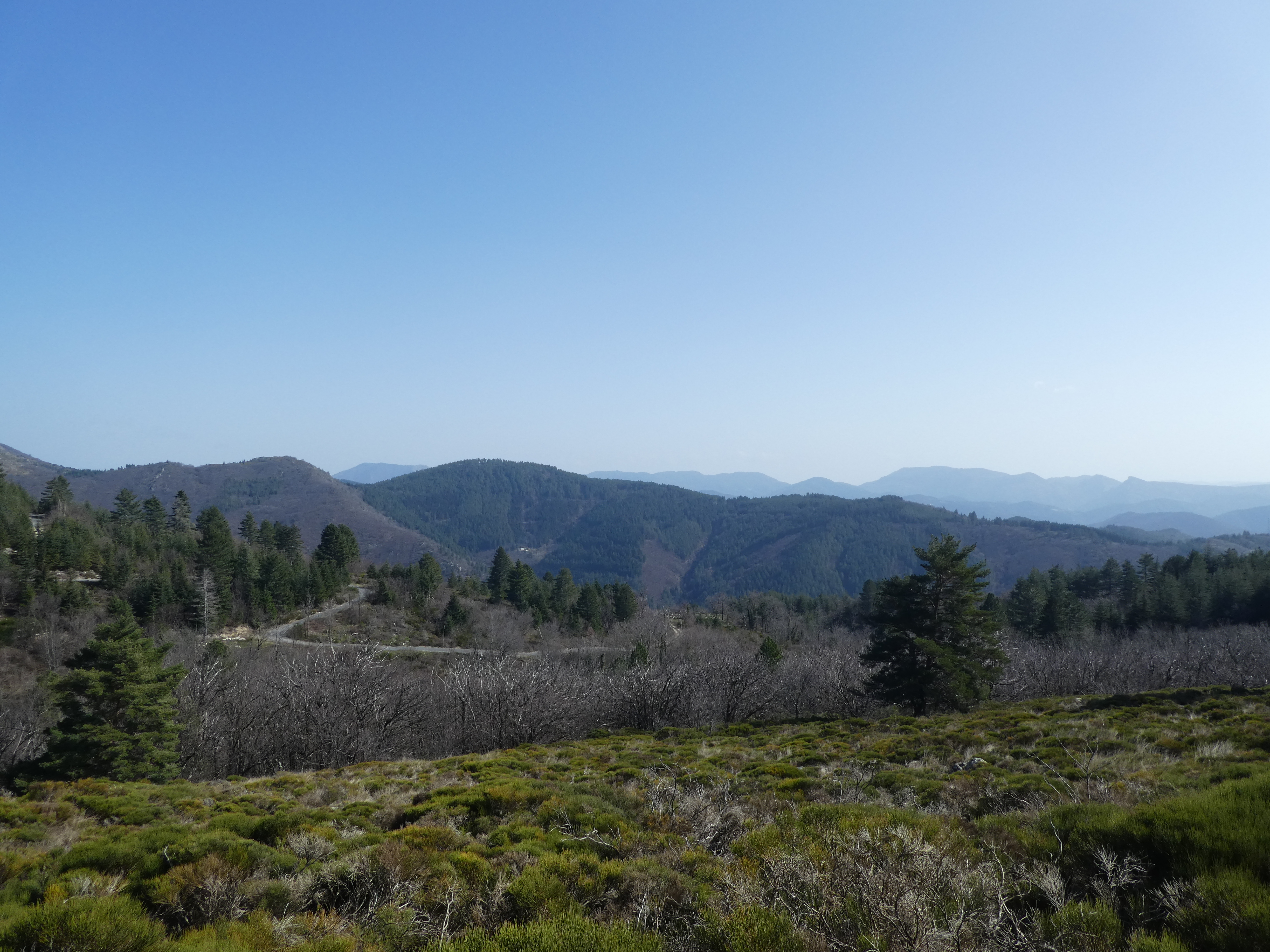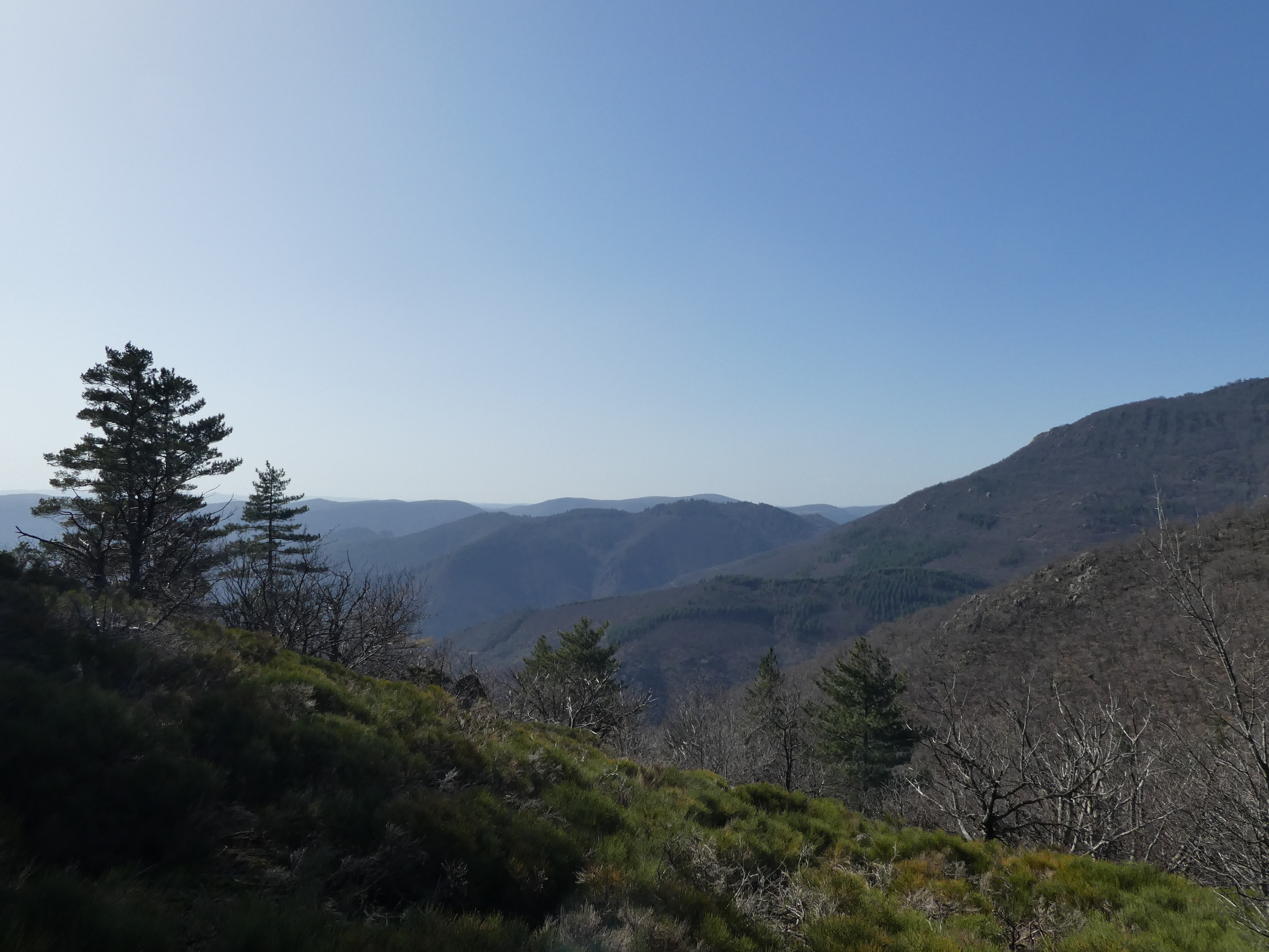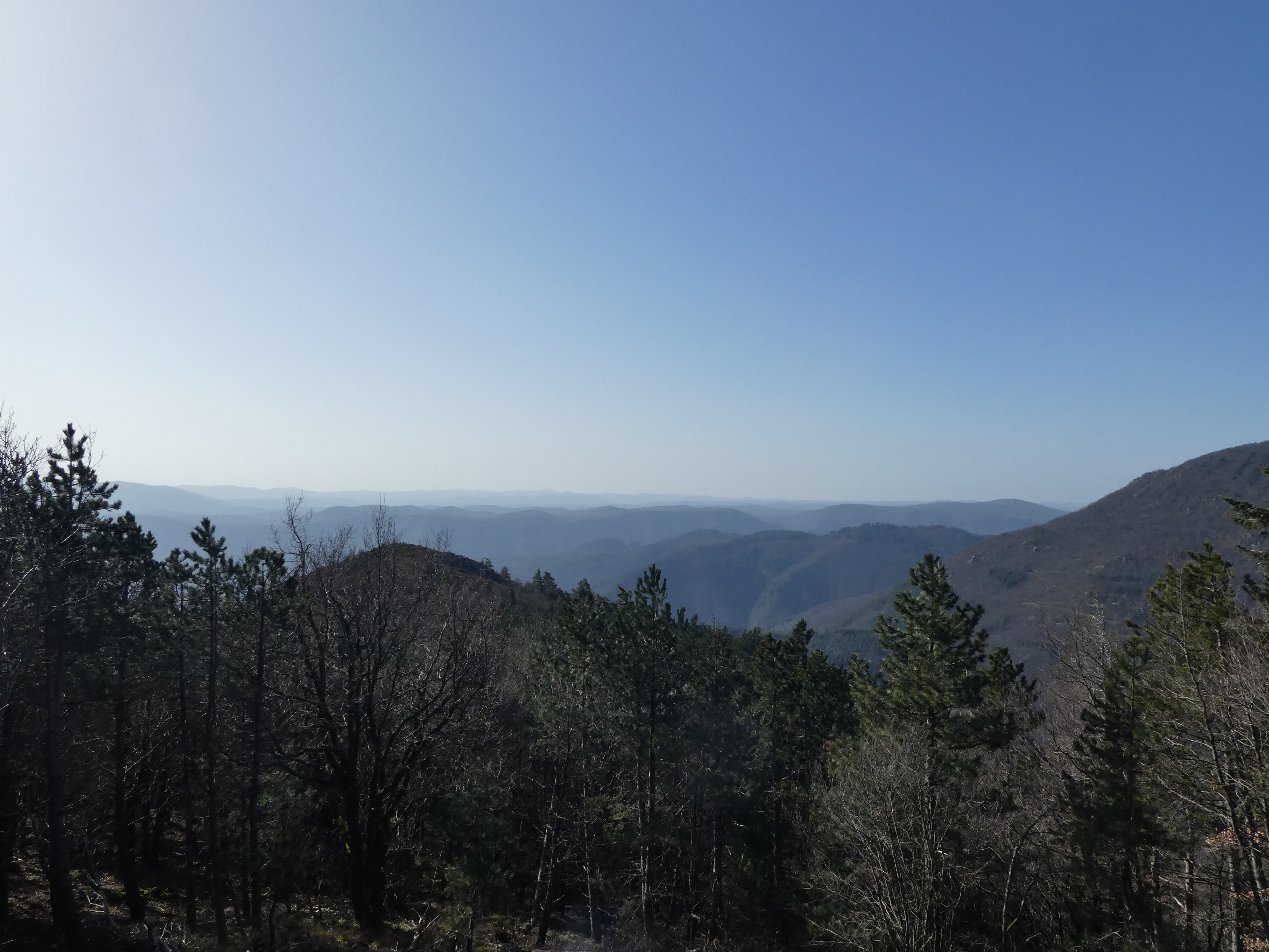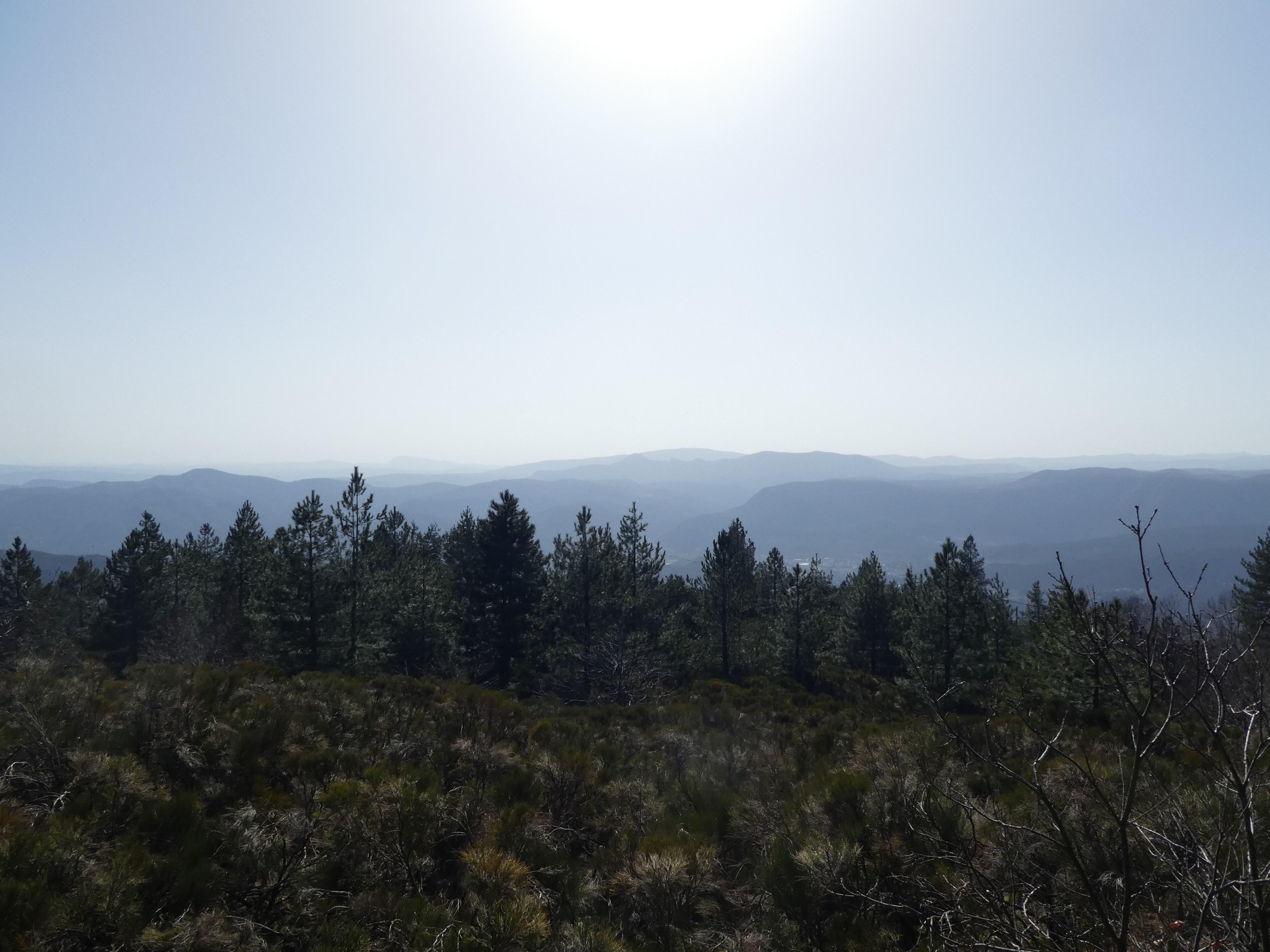 Arrivée au sommet du Rocher de Bonnetier (1167 m) : malgré la présence de végétation, belle vue sur les sommets de la Montagne de la Séranne, le Mont Saint-Baudille, le Causse de Blandas et les sommets occidentaux de la Vallée du Souls