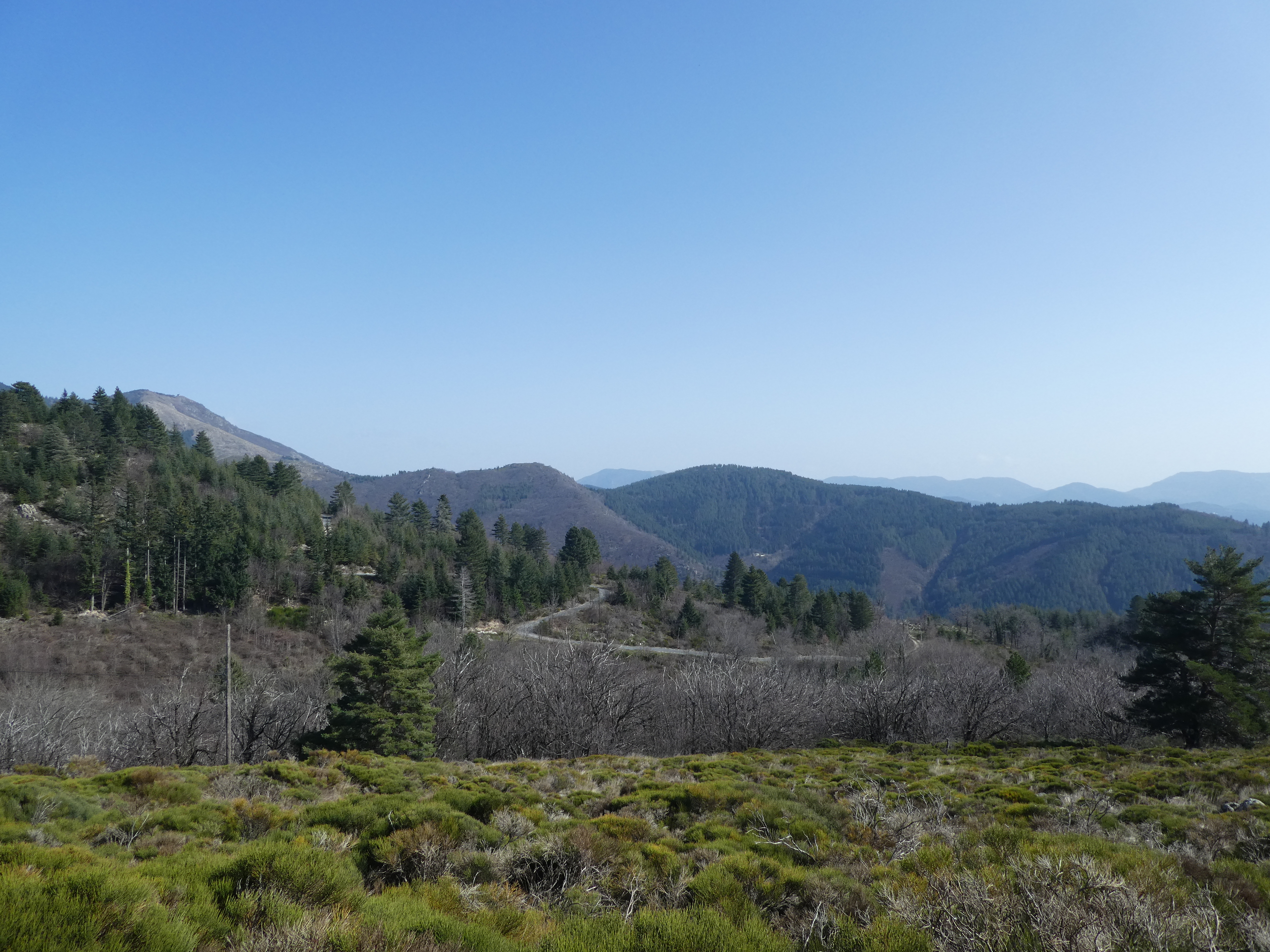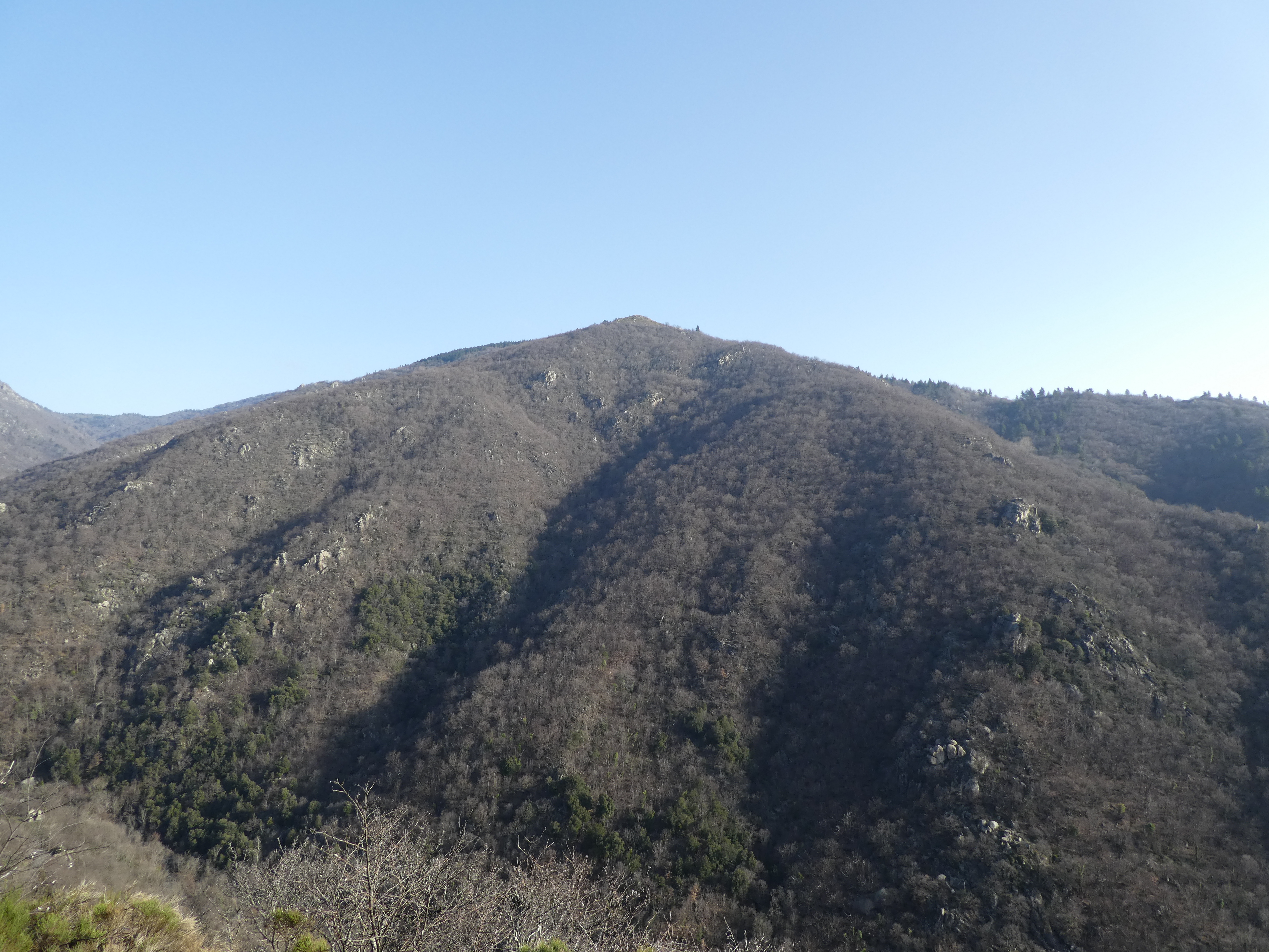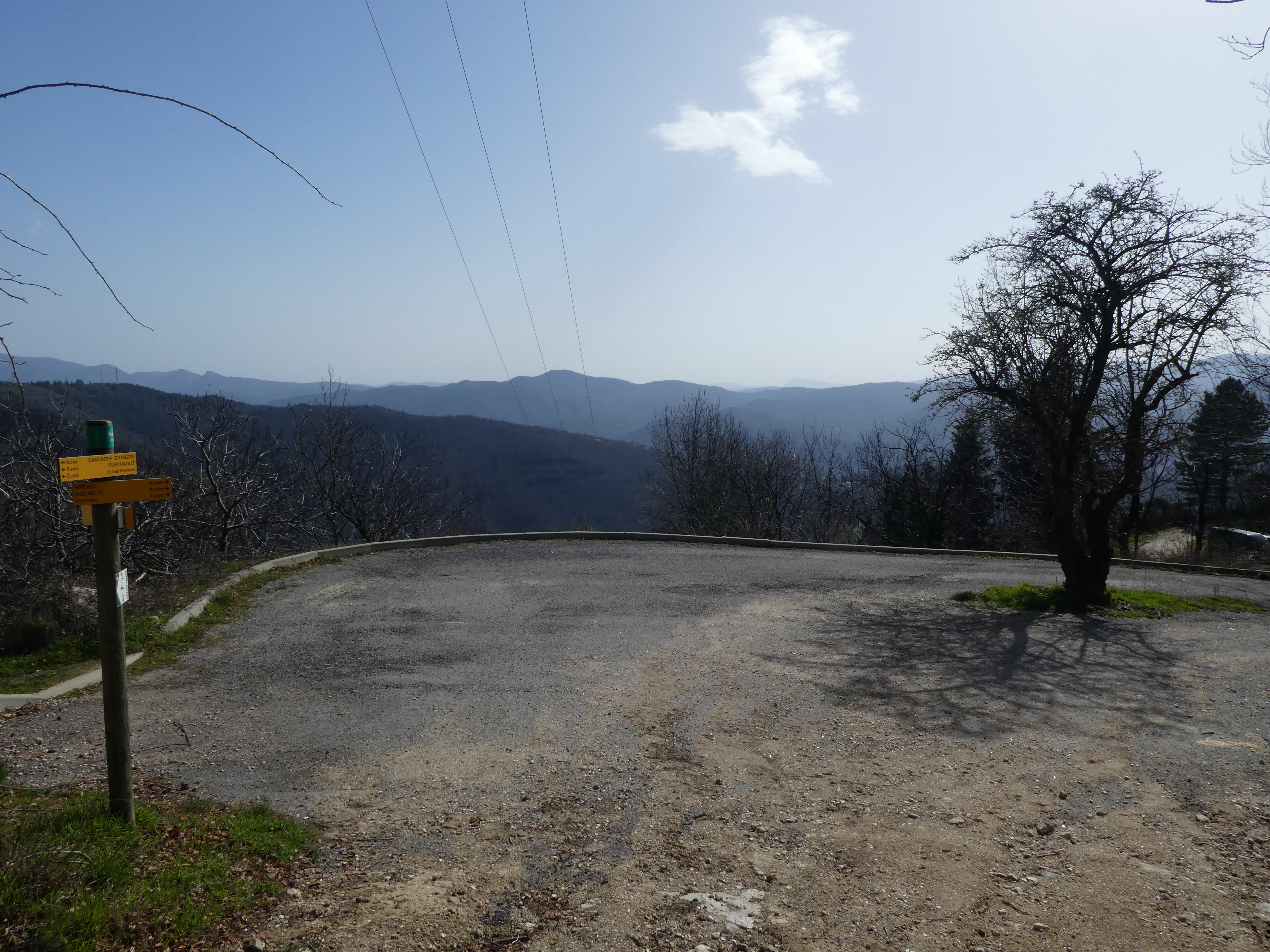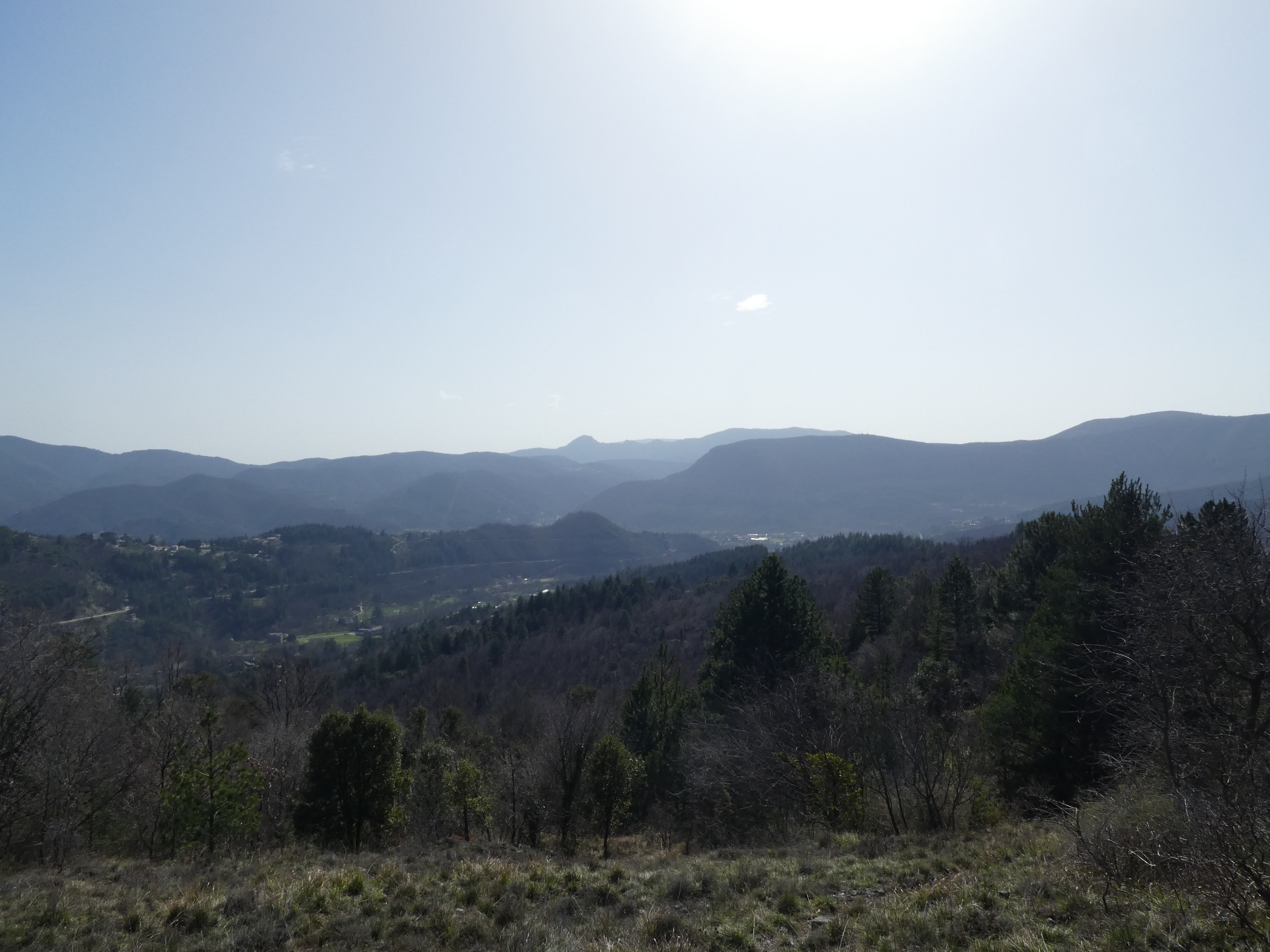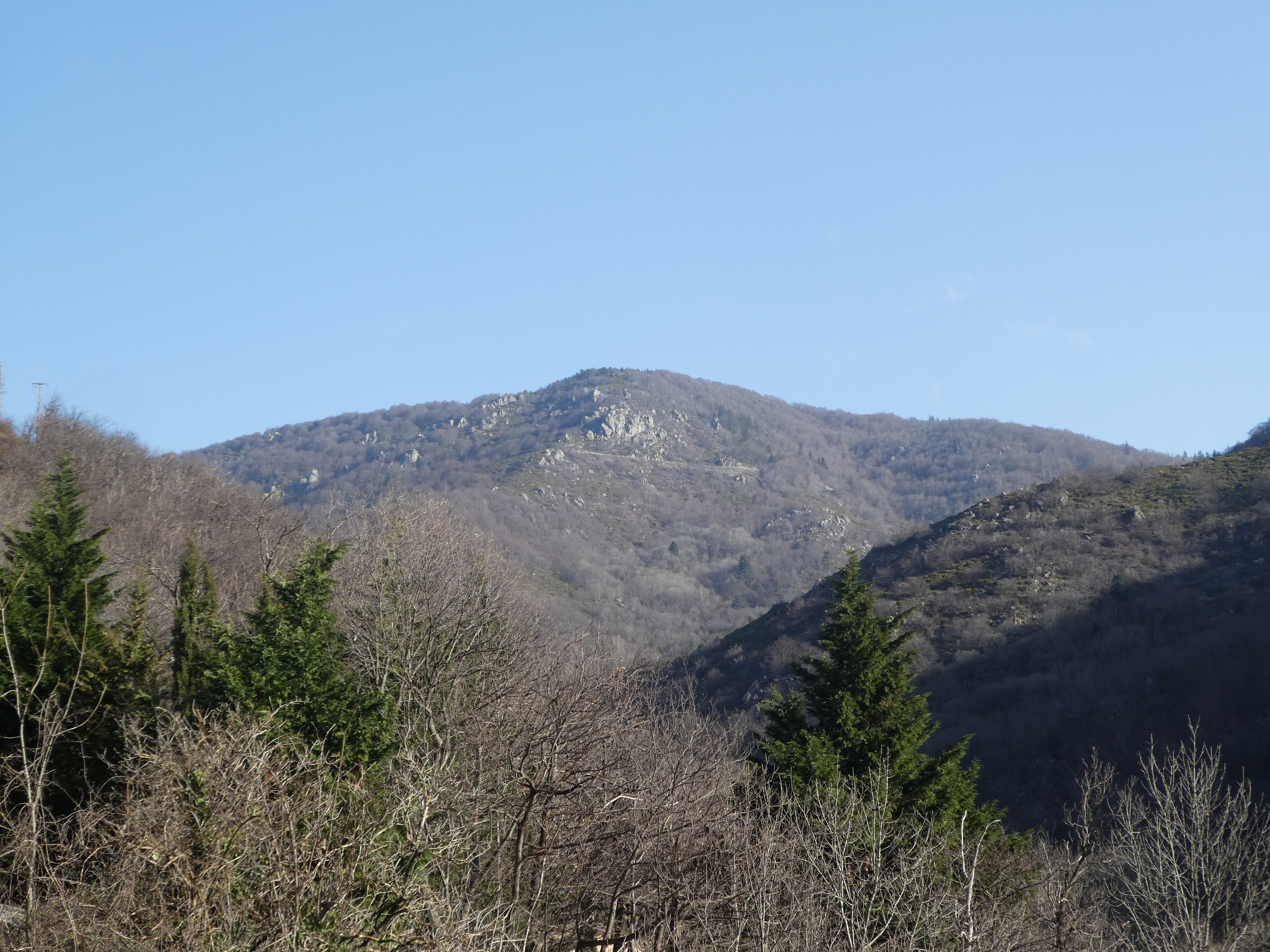 Arrivée au sommet du Rocher de Bonnetier (1167 m) : malgré la présence de végétation, belle vue sur les sommets de la Montagne de la Séranne, le Mont Saint-Baudille, le Causse de Blandas et les sommets occidentaux de la Vallée du Souls