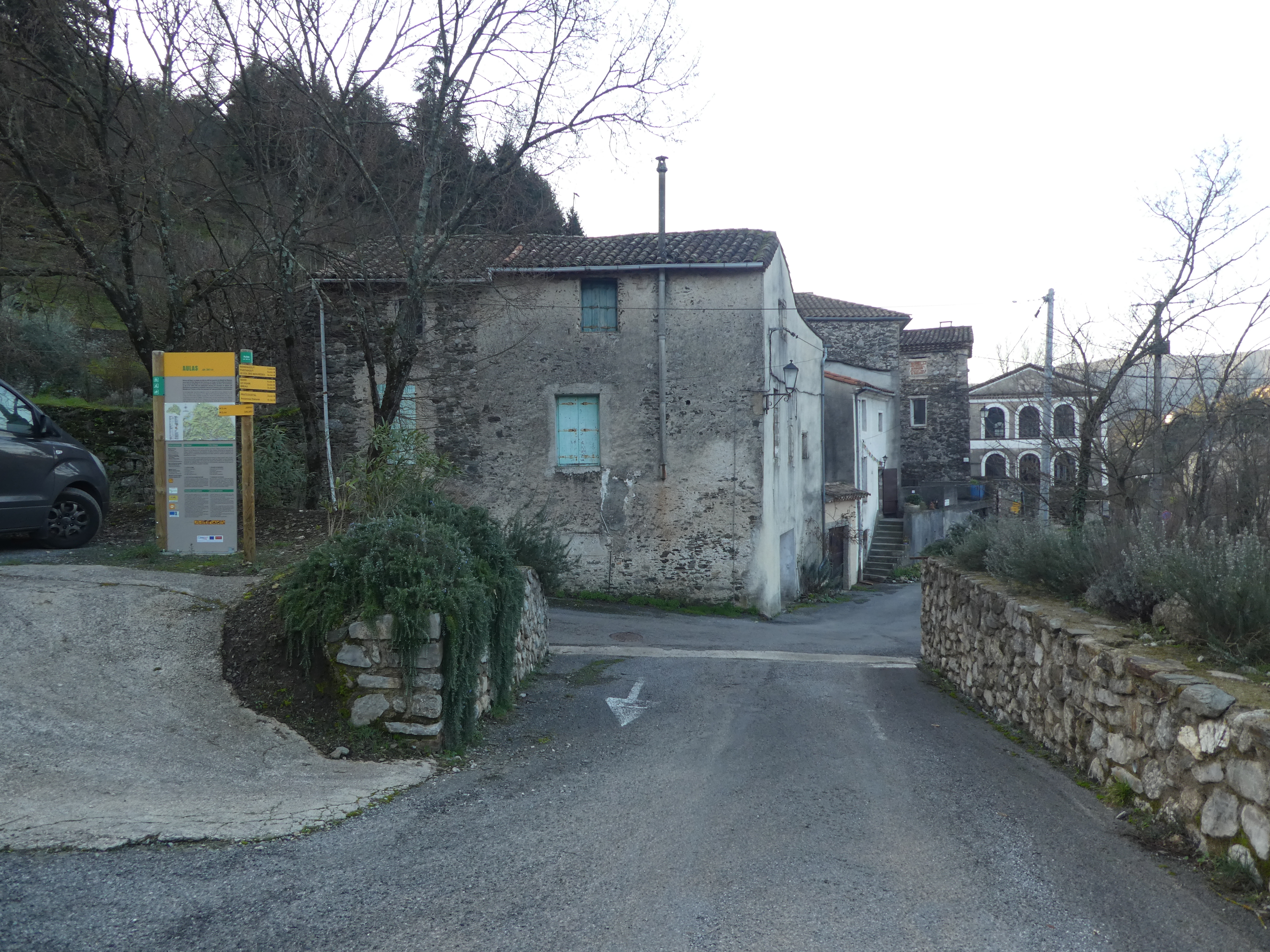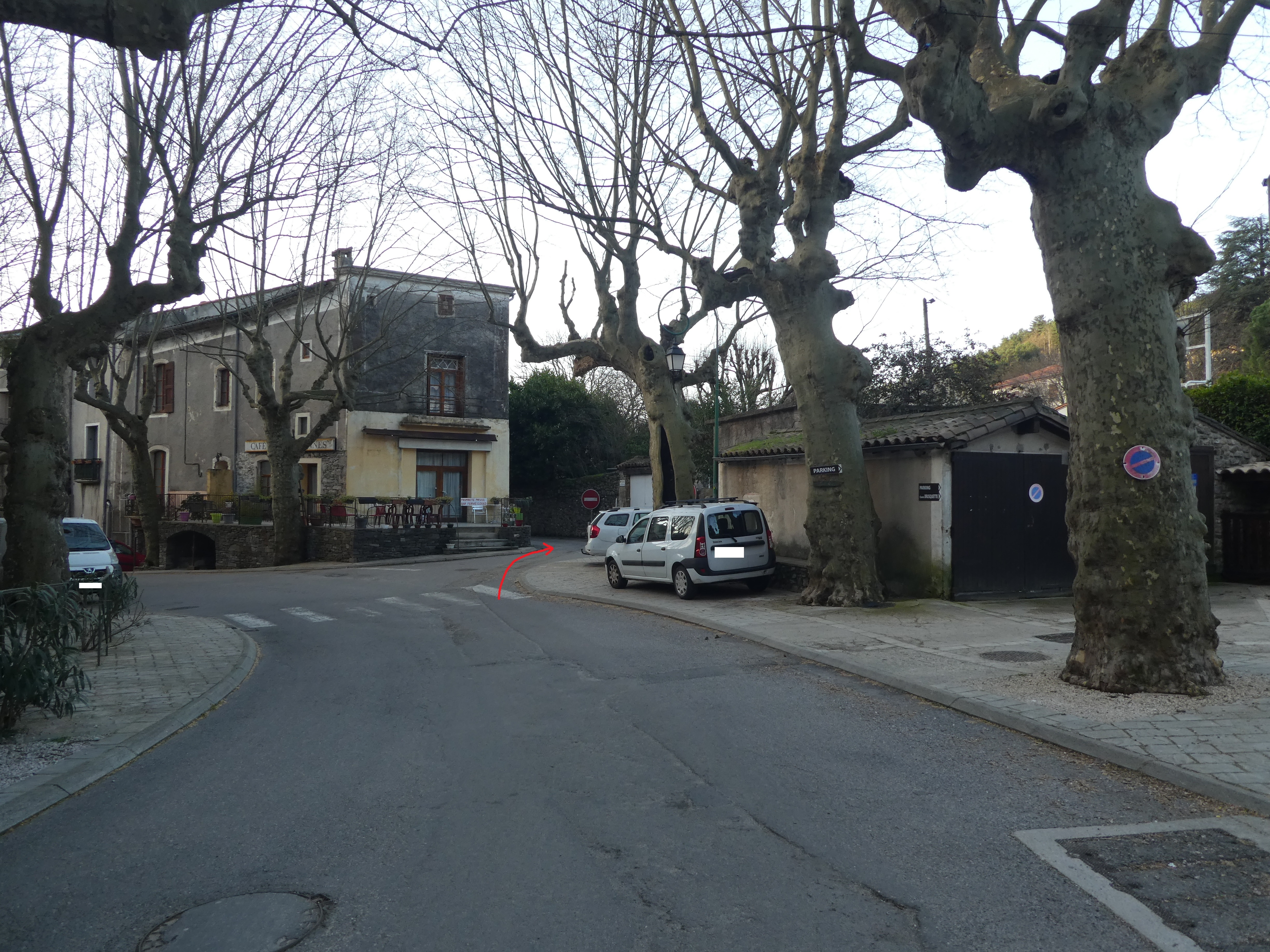 Aulas - Temple (337 m) : suivre la rue montant raidement sur la droite 25 mètres plus loin direction Bréau, balisé en jaune (attention, la rue partant tout droit est aussi balisée en jaune ...)