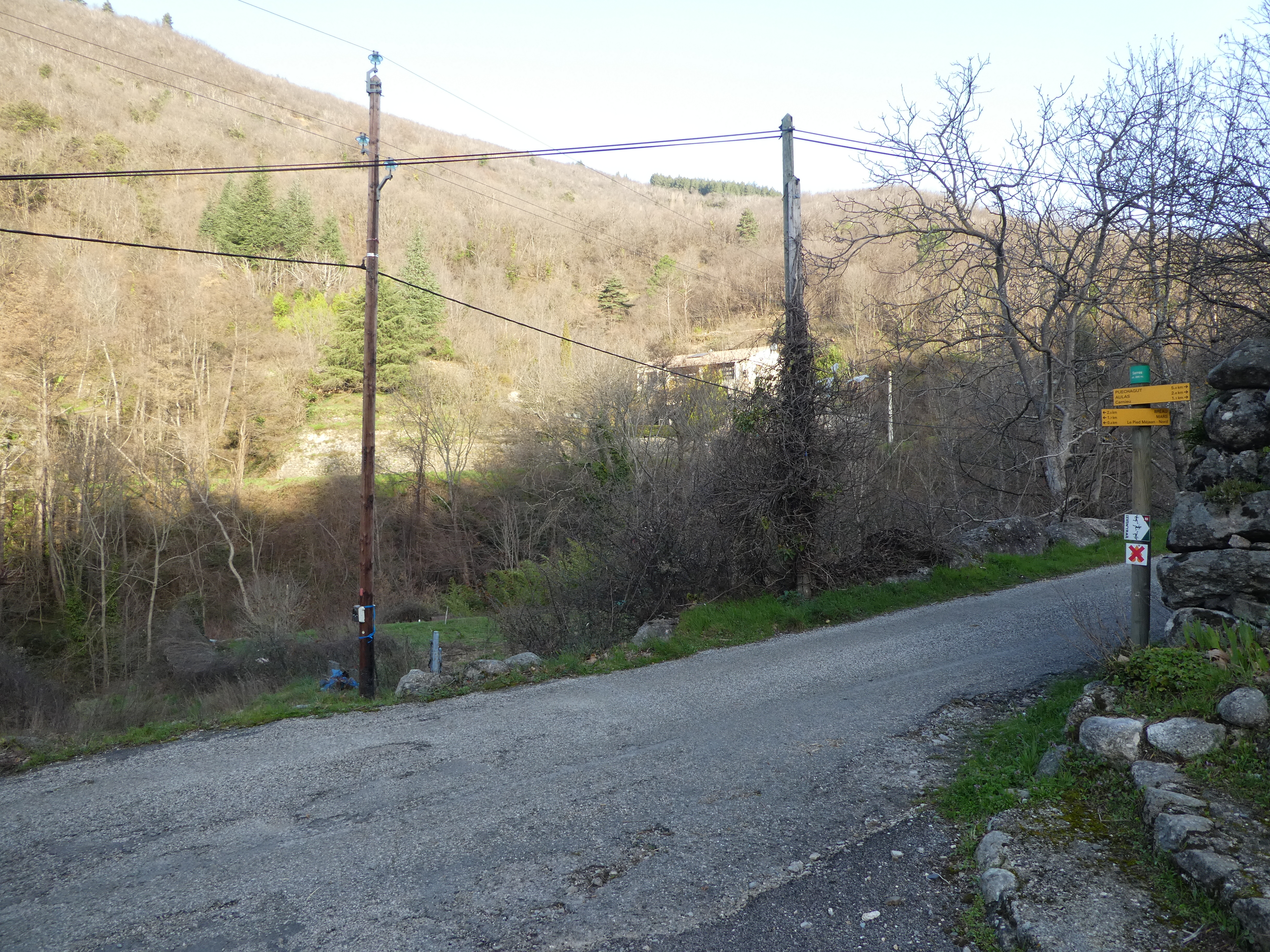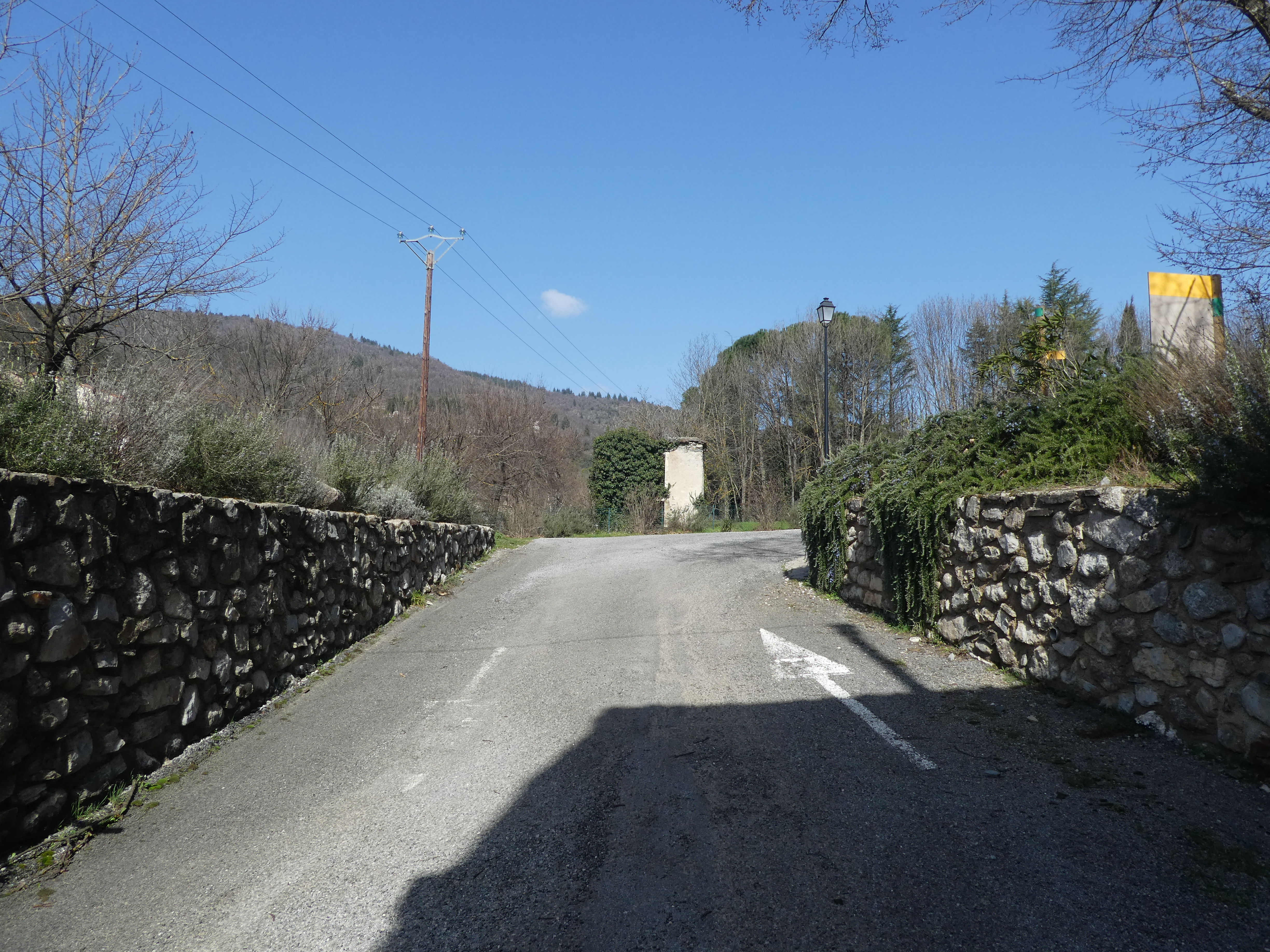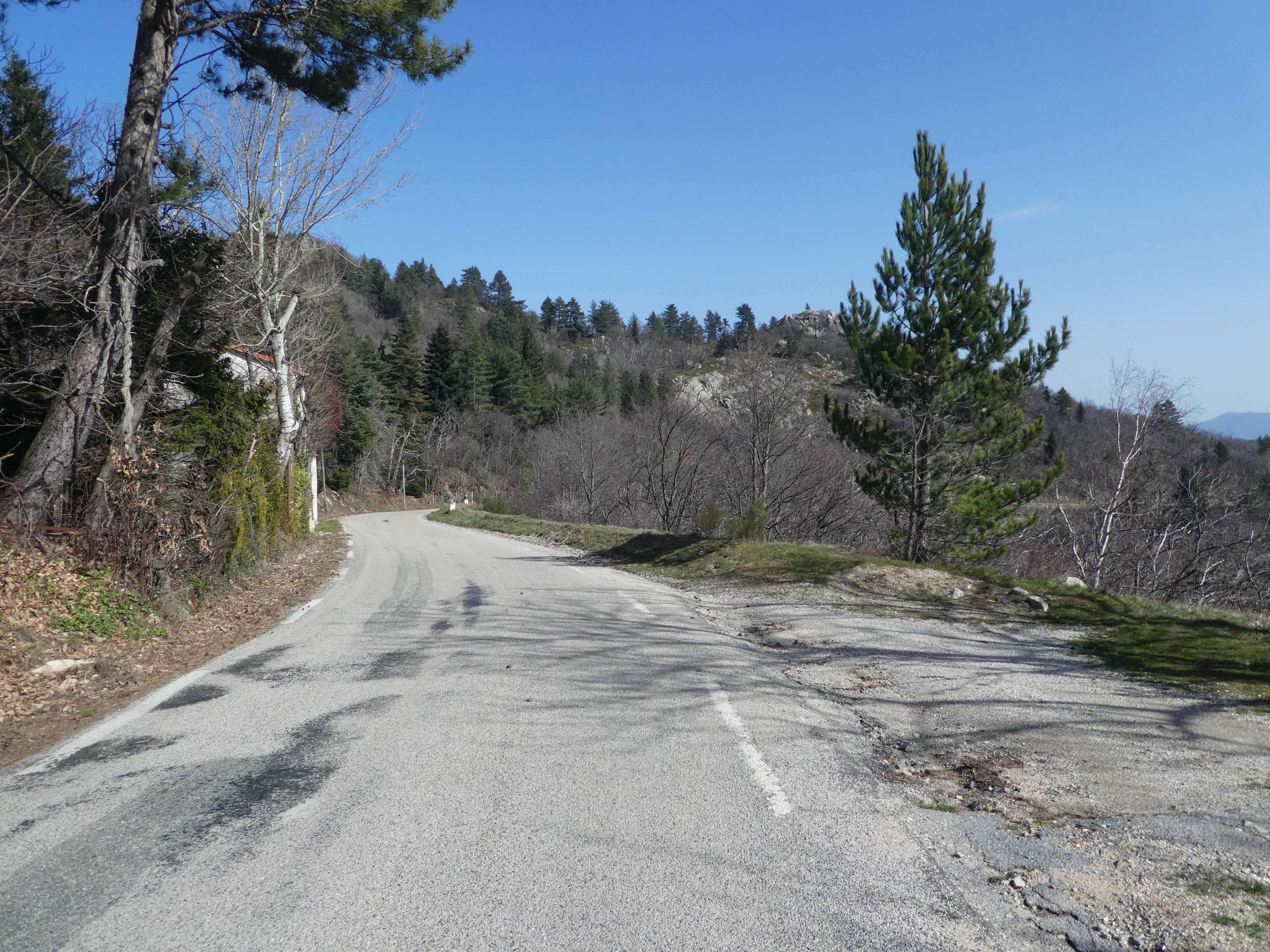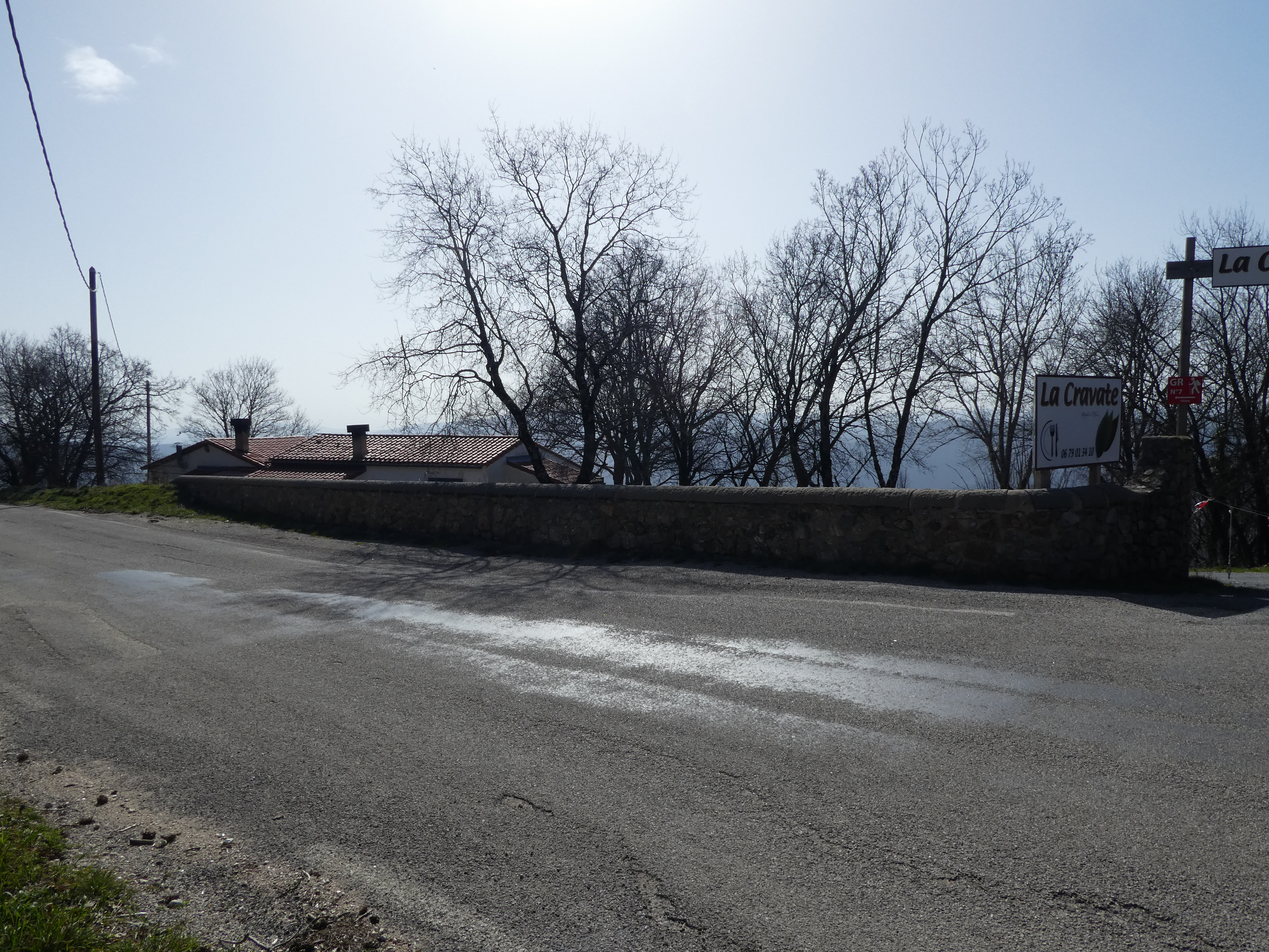 A cette intersection (200 mètres après la précédente) (394 m), suivre la route montant sur la droite en lacets direction Mars, balisé en jaune