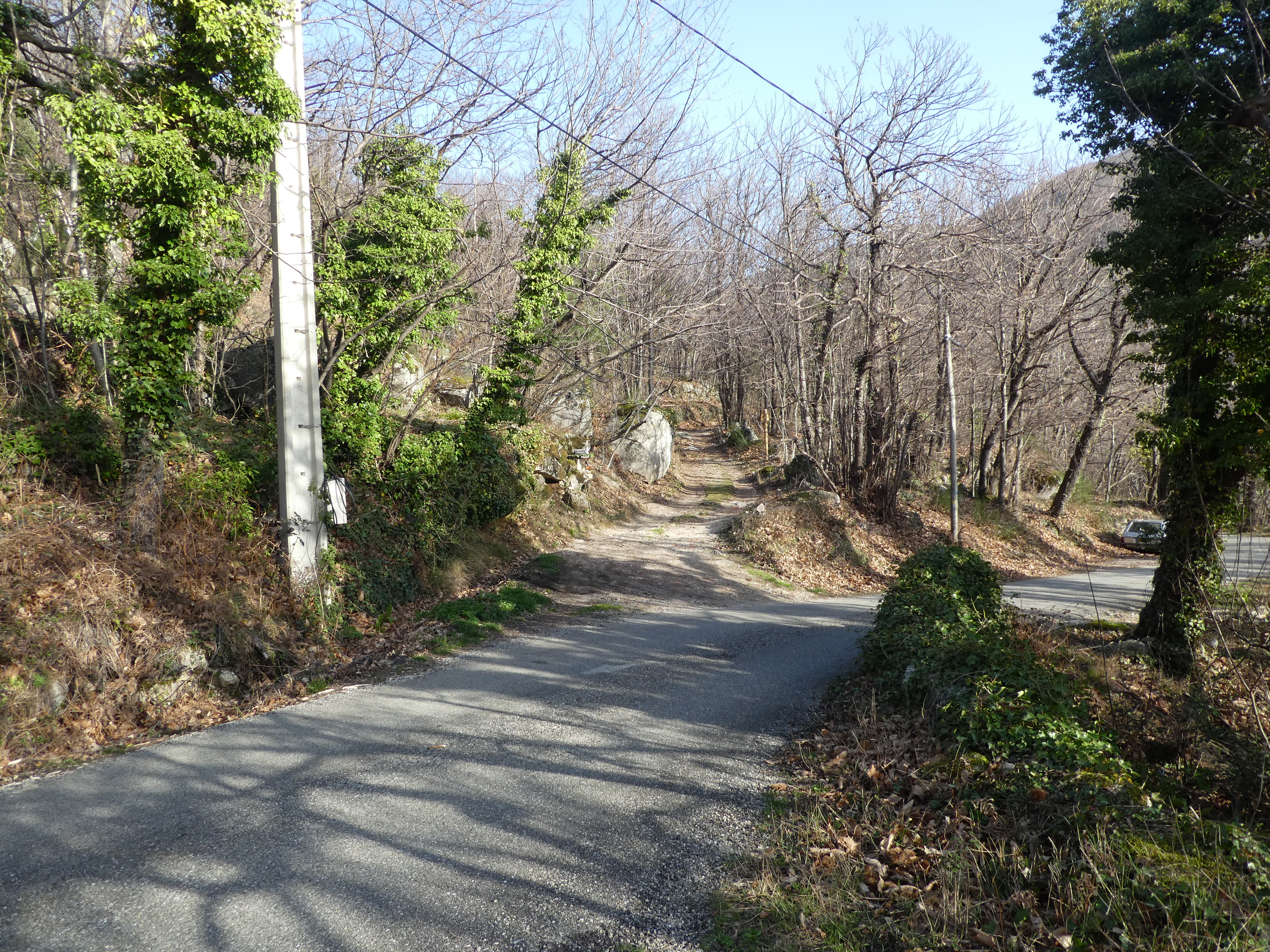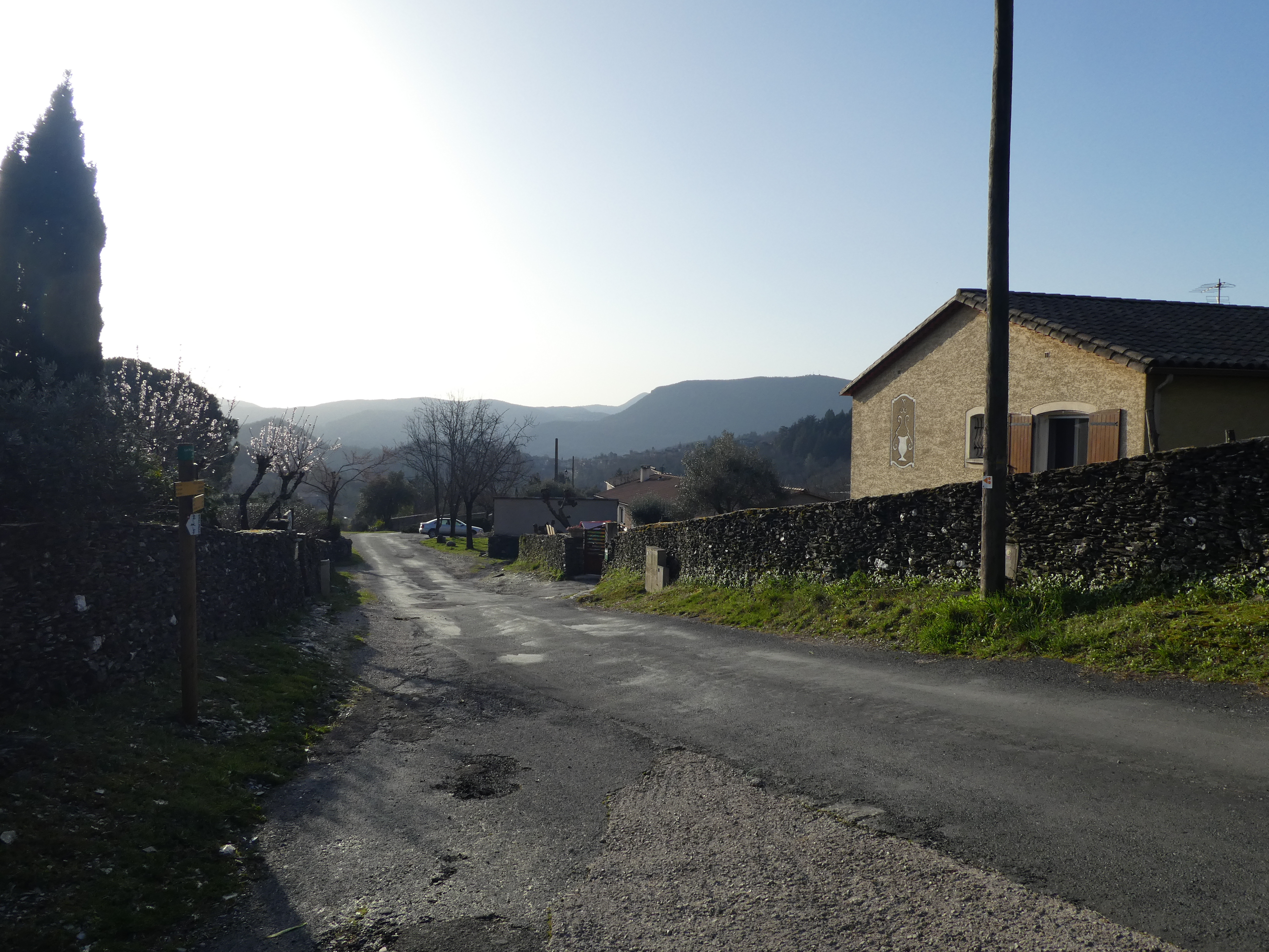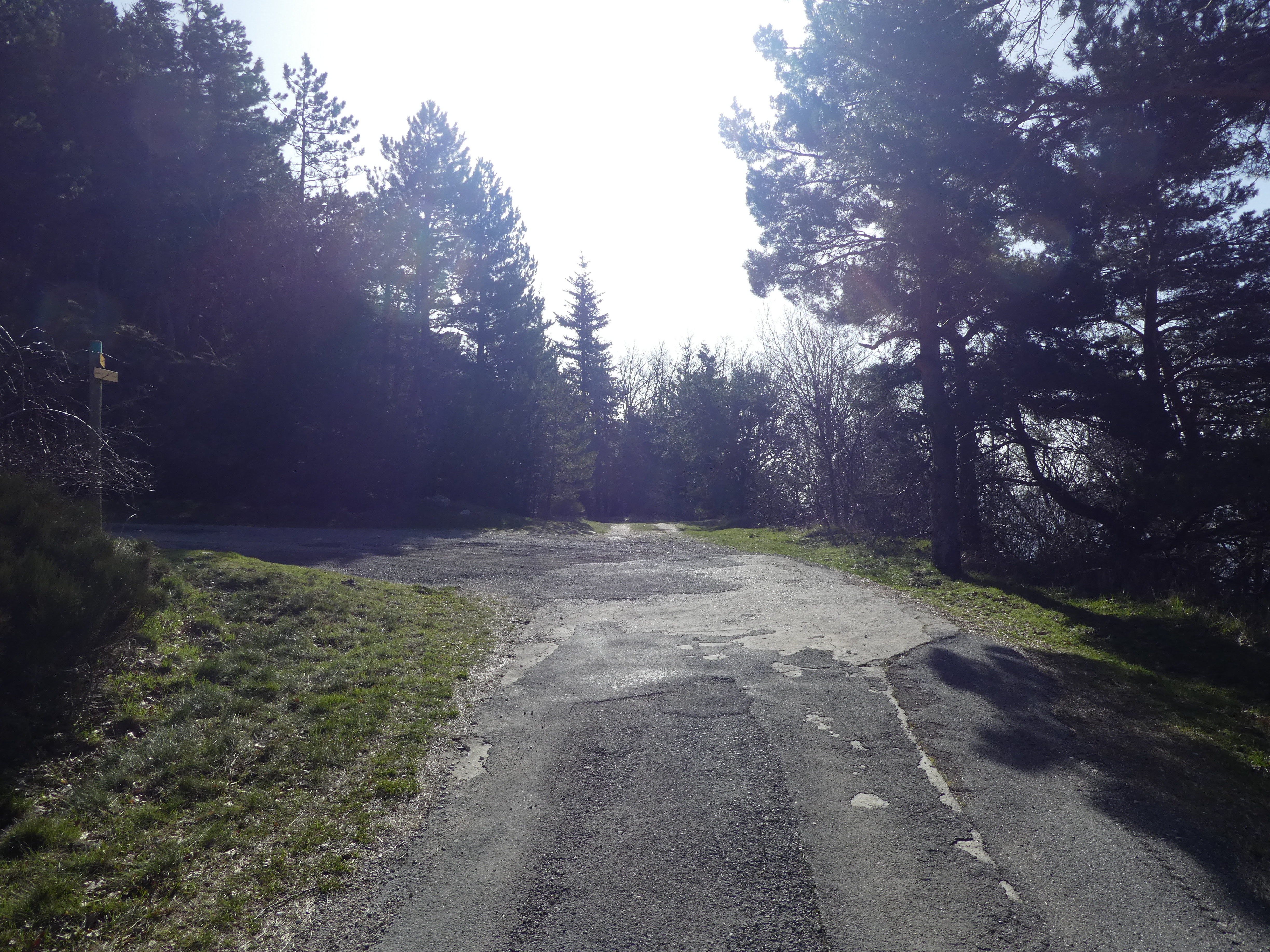 A cette intersection (200 mètres après la précédente) (394 m), suivre la route montant sur la droite en lacets direction Mars, balisé en jaune
