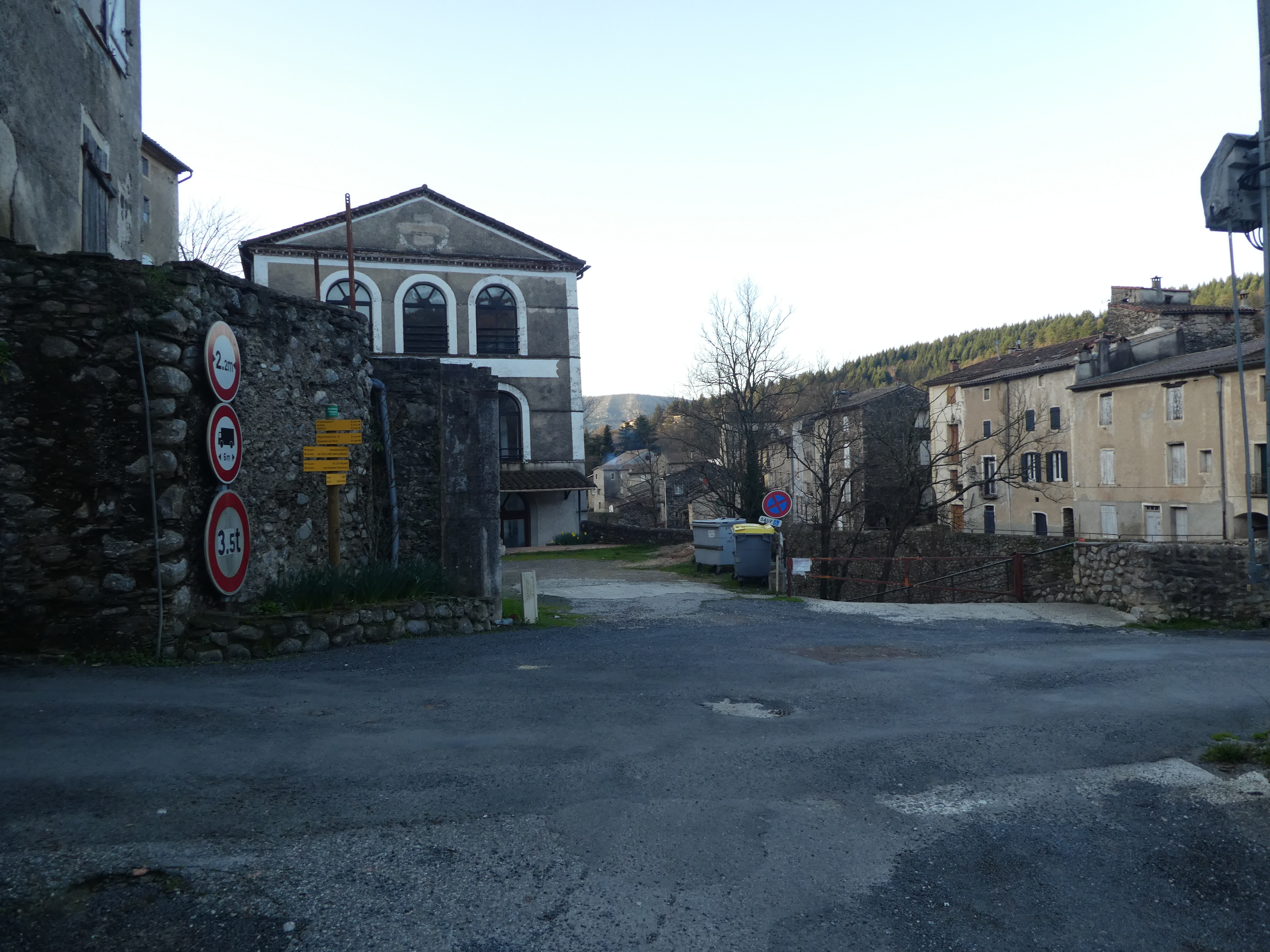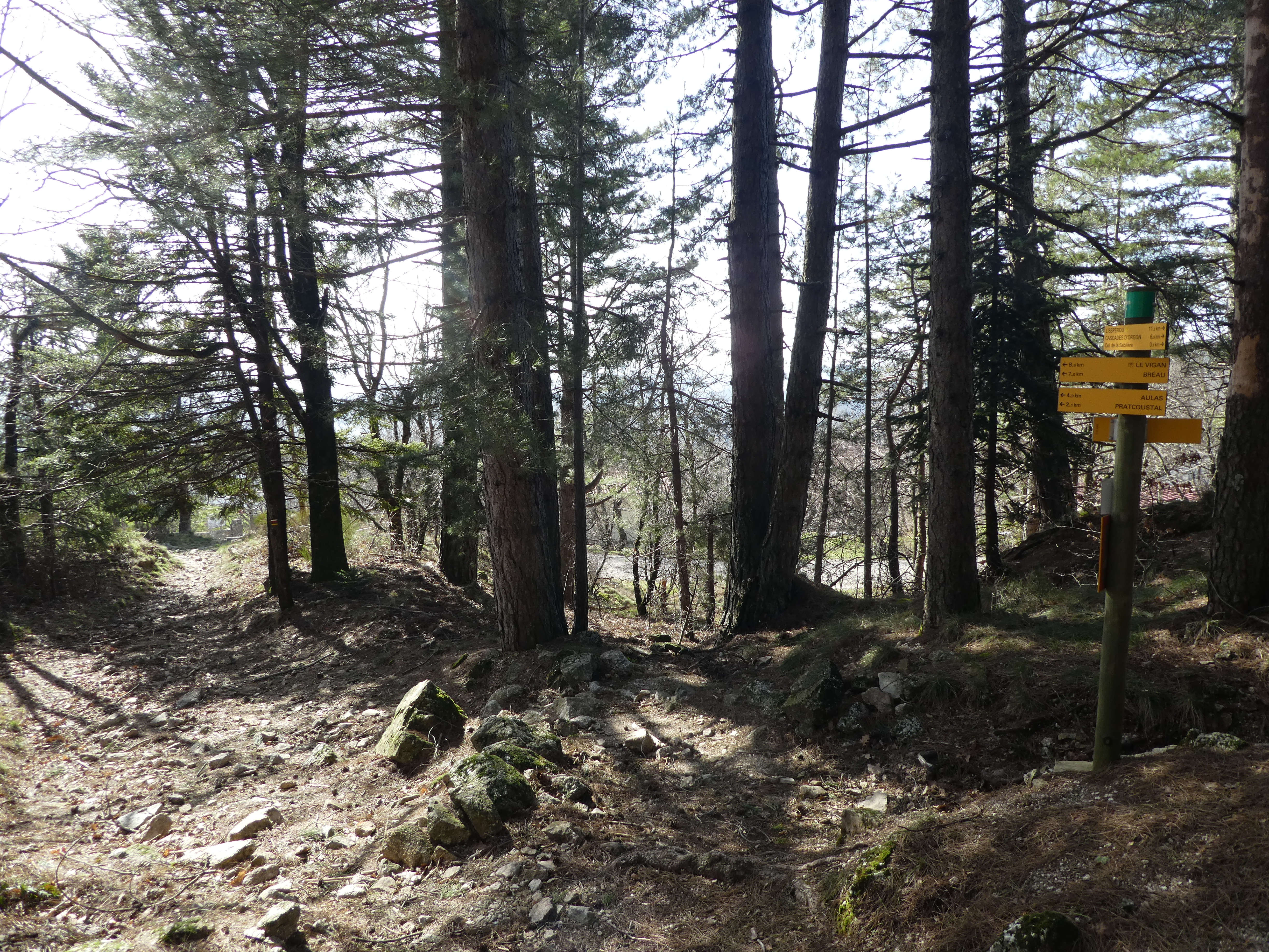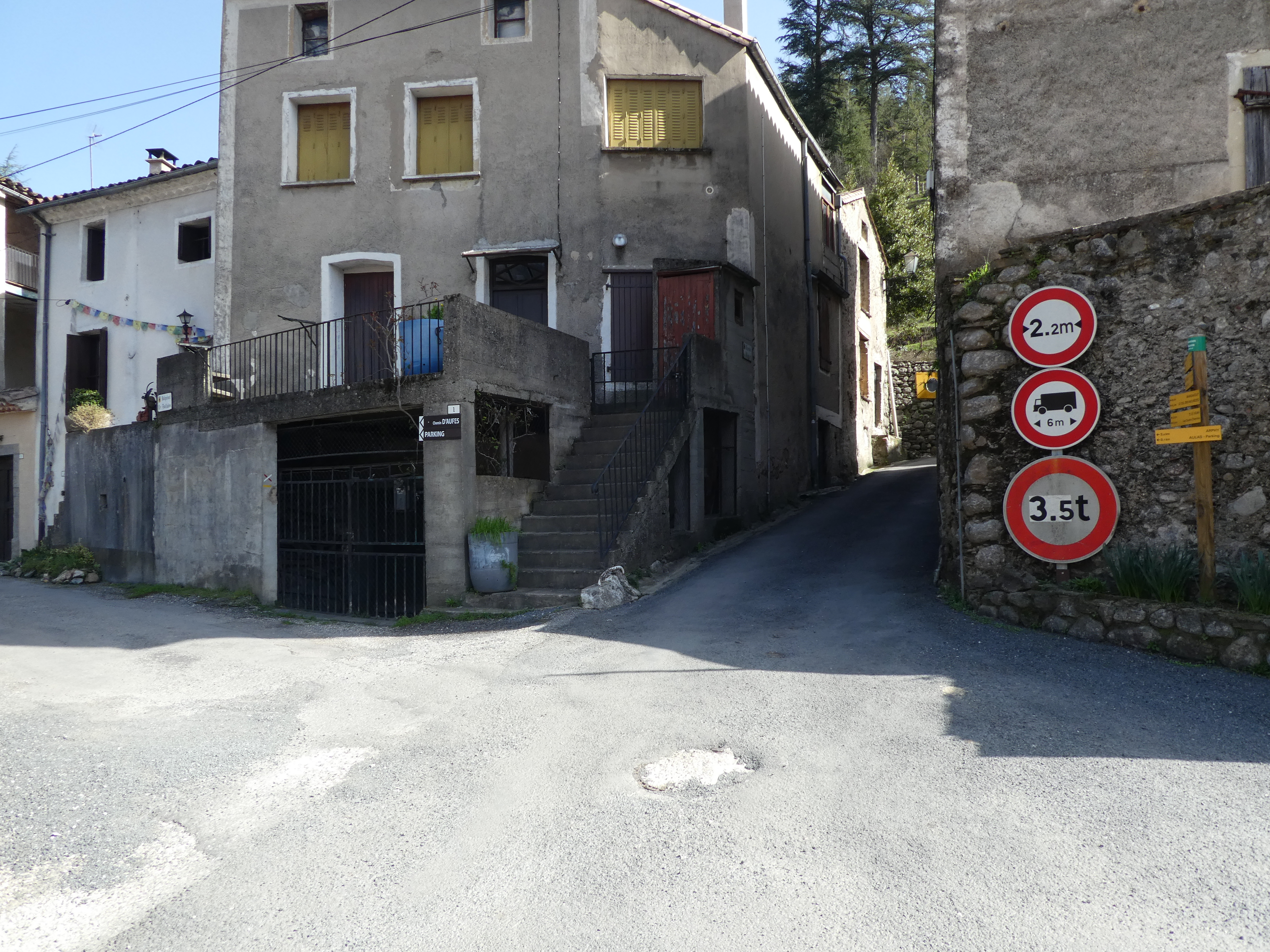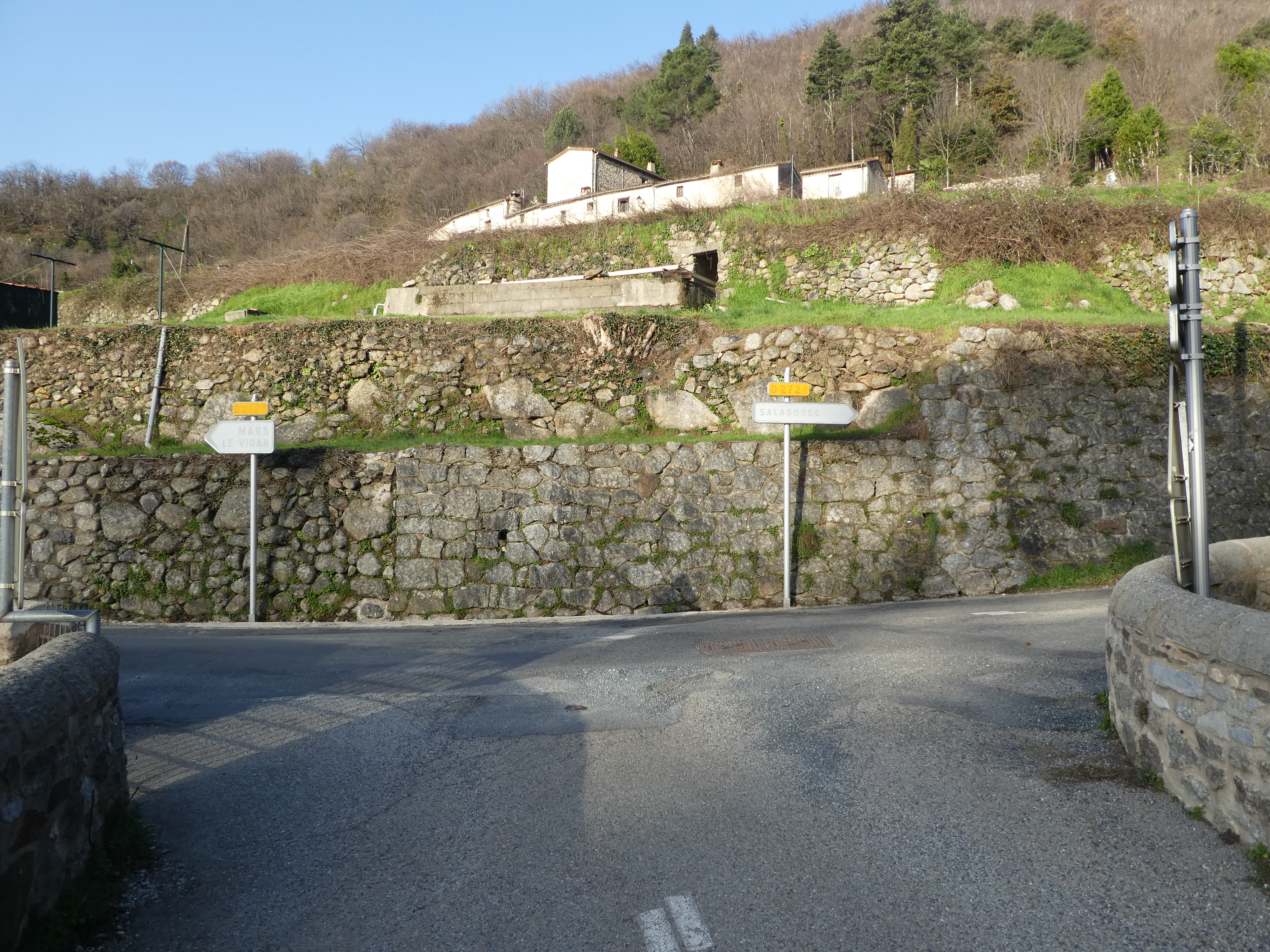 A cette intersection (200 mètres après la précédente) (394 m), suivre la route montant sur la droite en lacets direction Mars, balisé en jaune