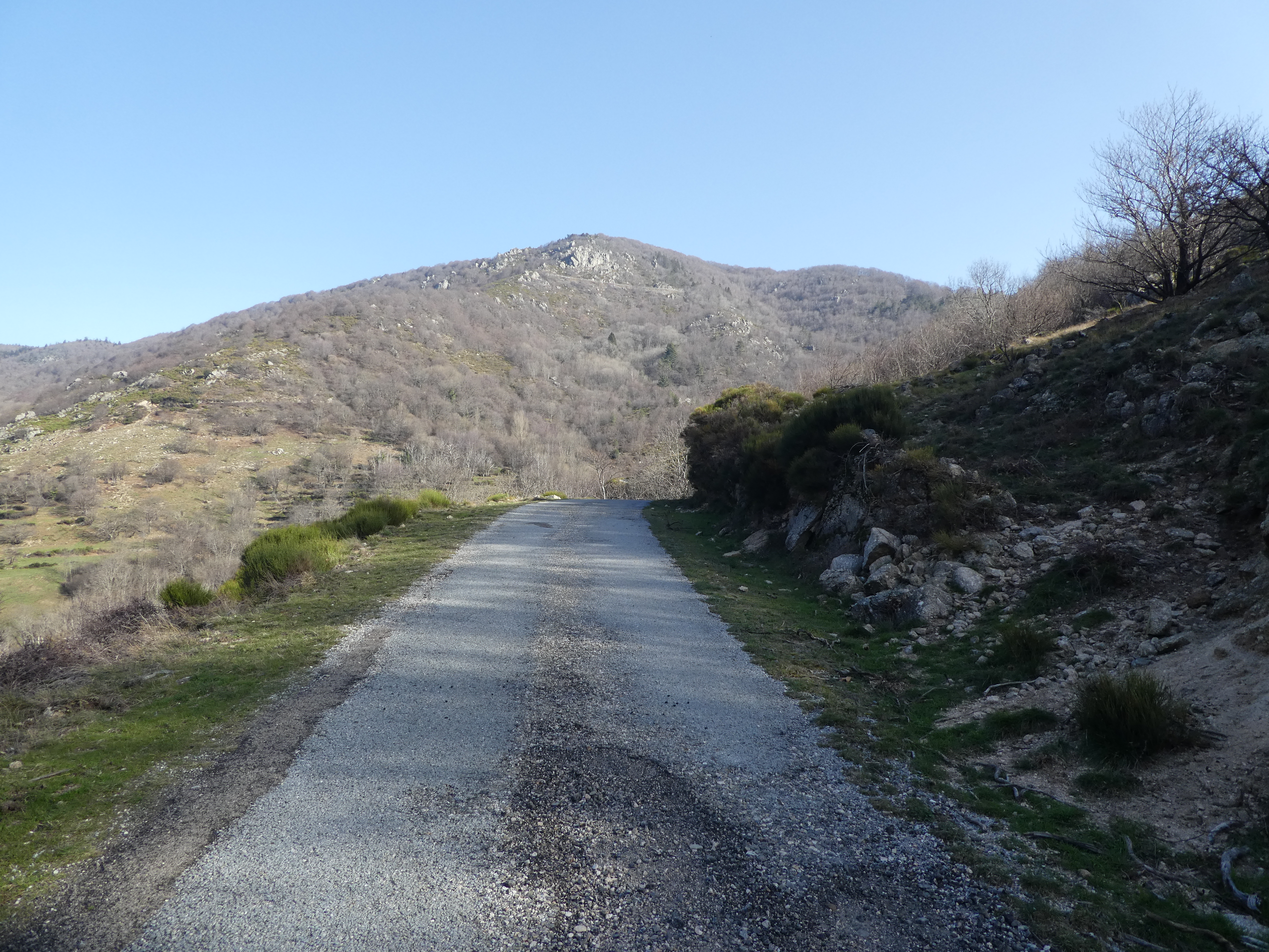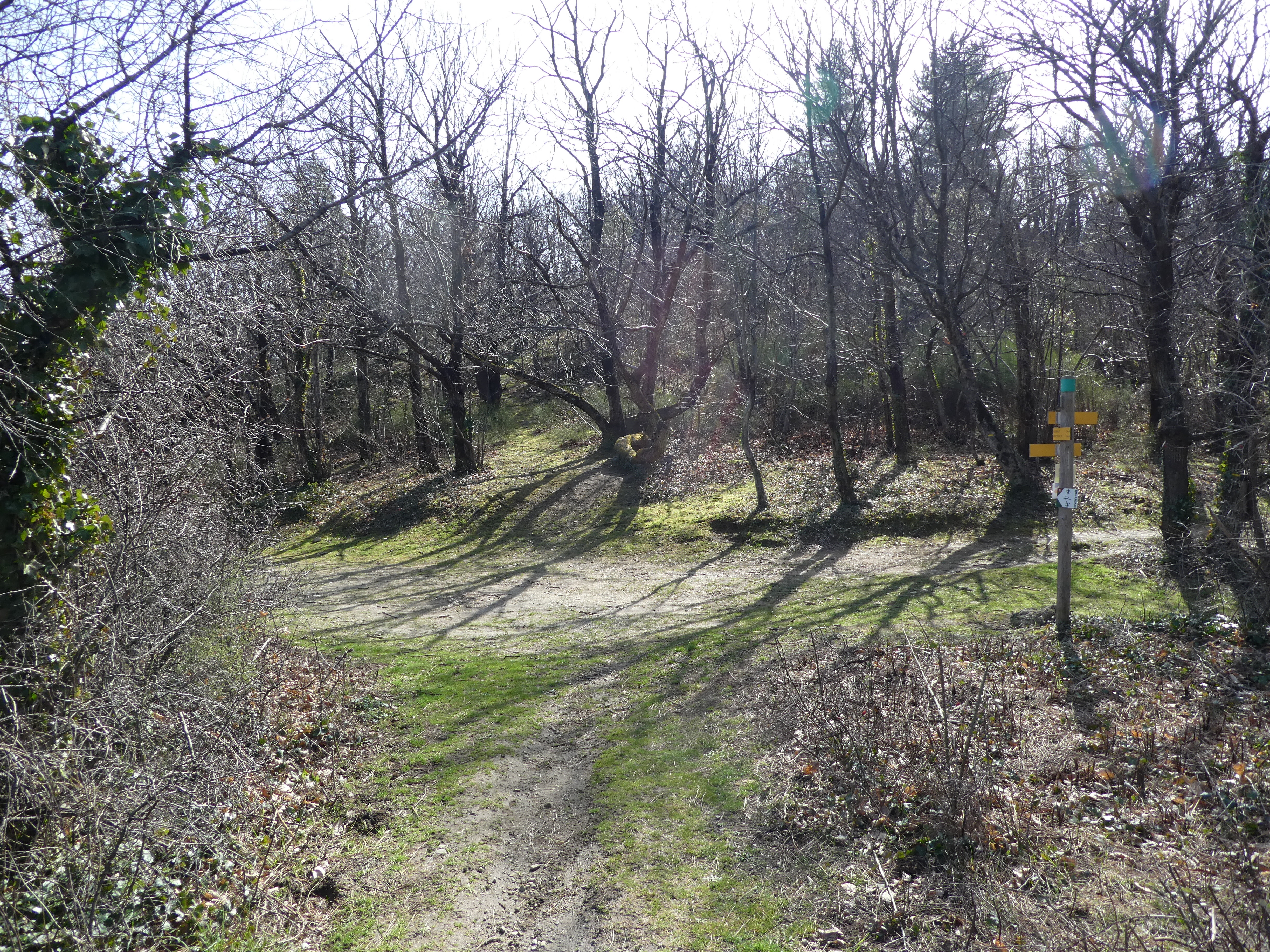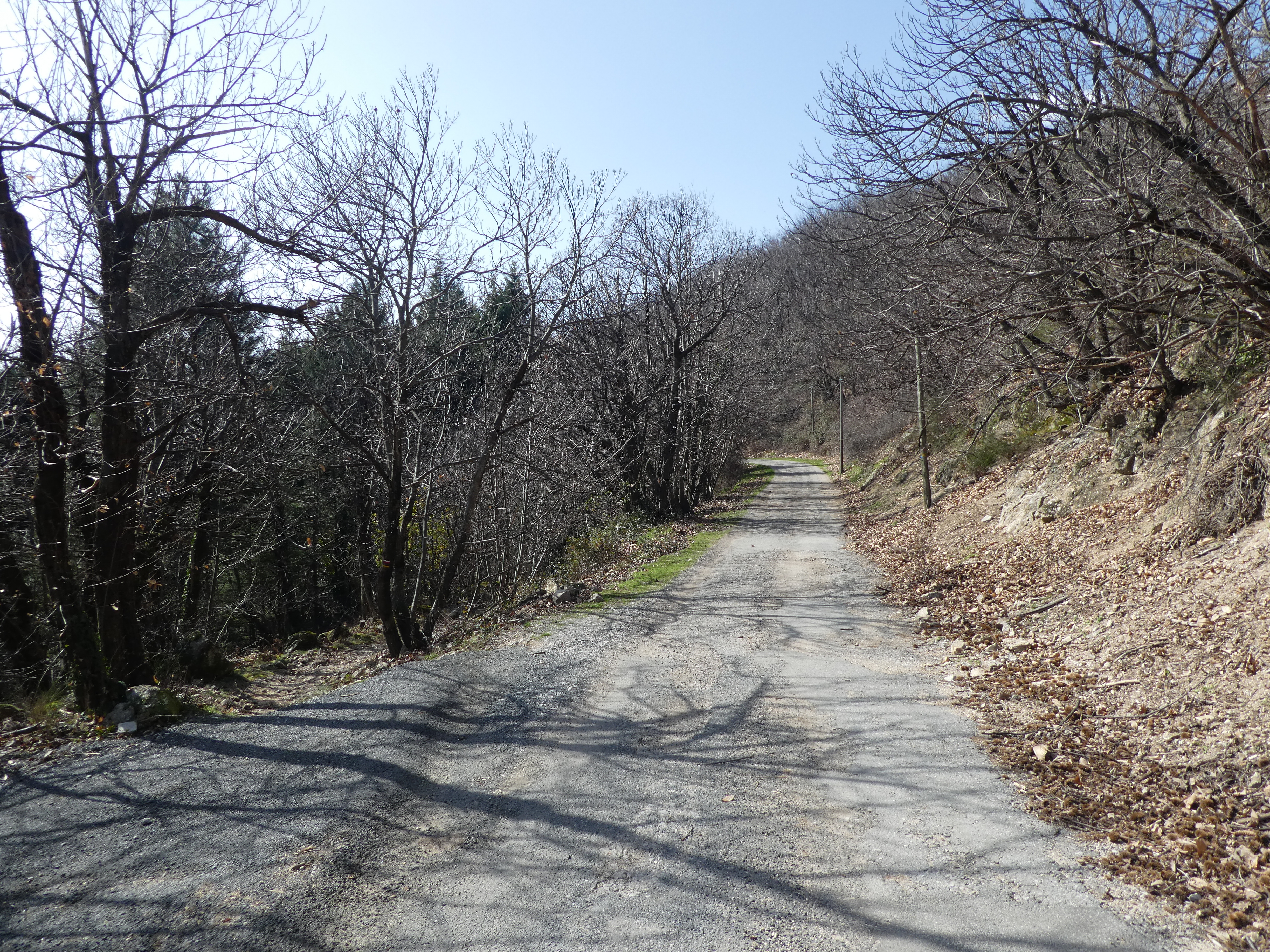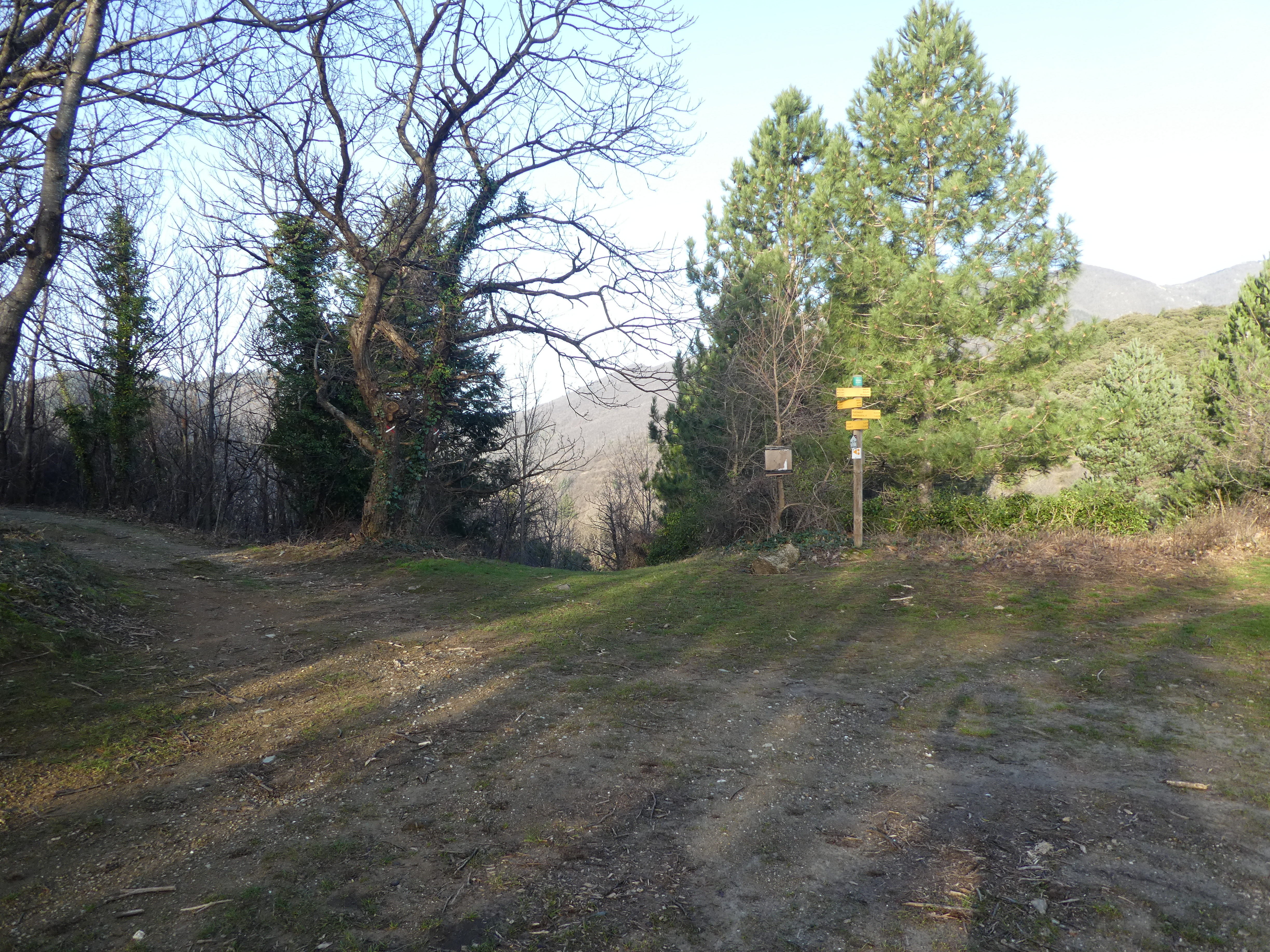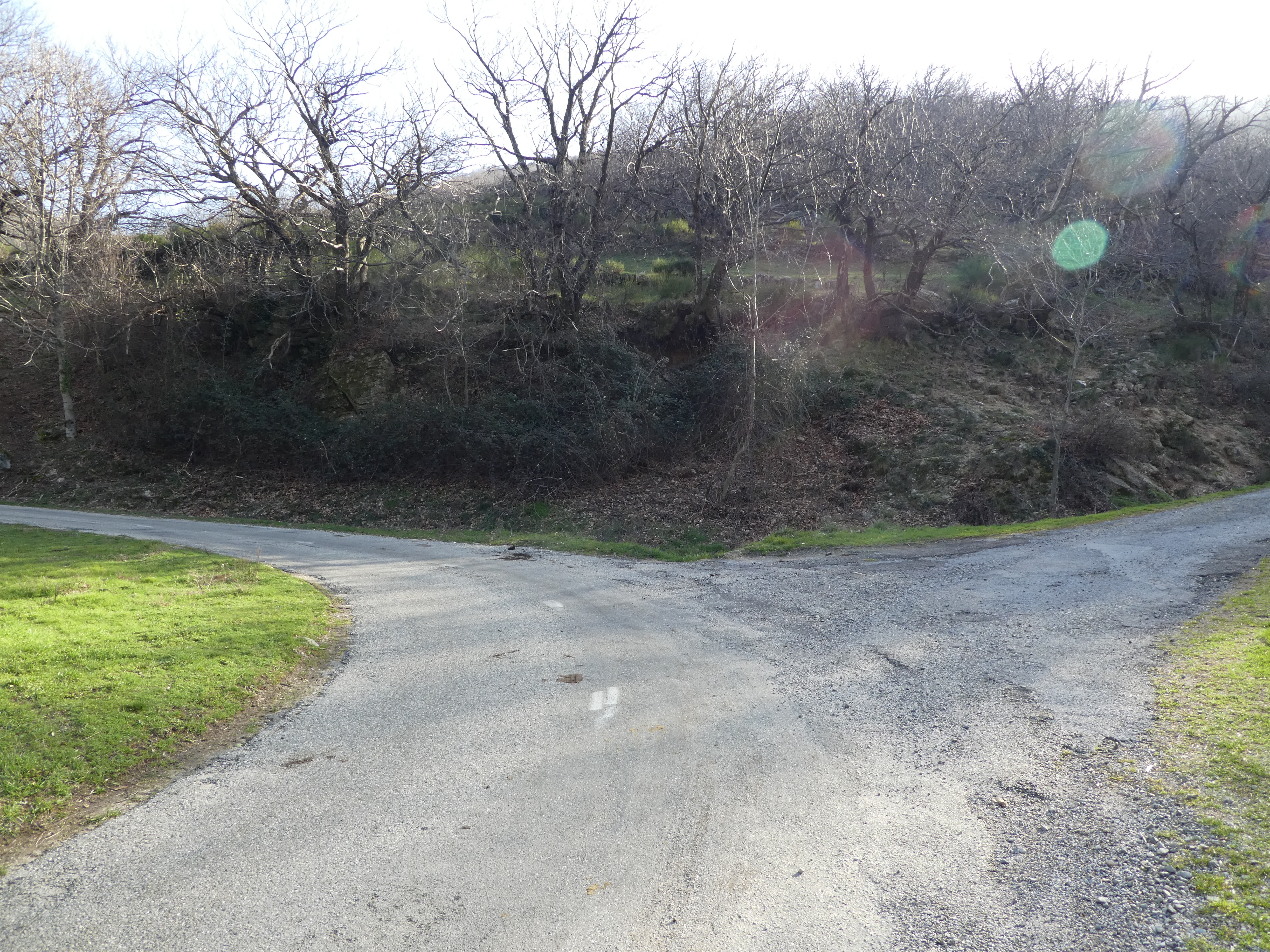 A ce croisement discret (800 mètres après le lieu-dit "Salagosse"), continuer à suivre la route partant tout droit direction Puechagut, balisé en jaune (le chemin "raccourci" montant sur la droite et passant proche du Roc de la Tride ne semble plus exister ... il faut donc suivre la route balisée en jaune beaucoup plus longue en distance !)
