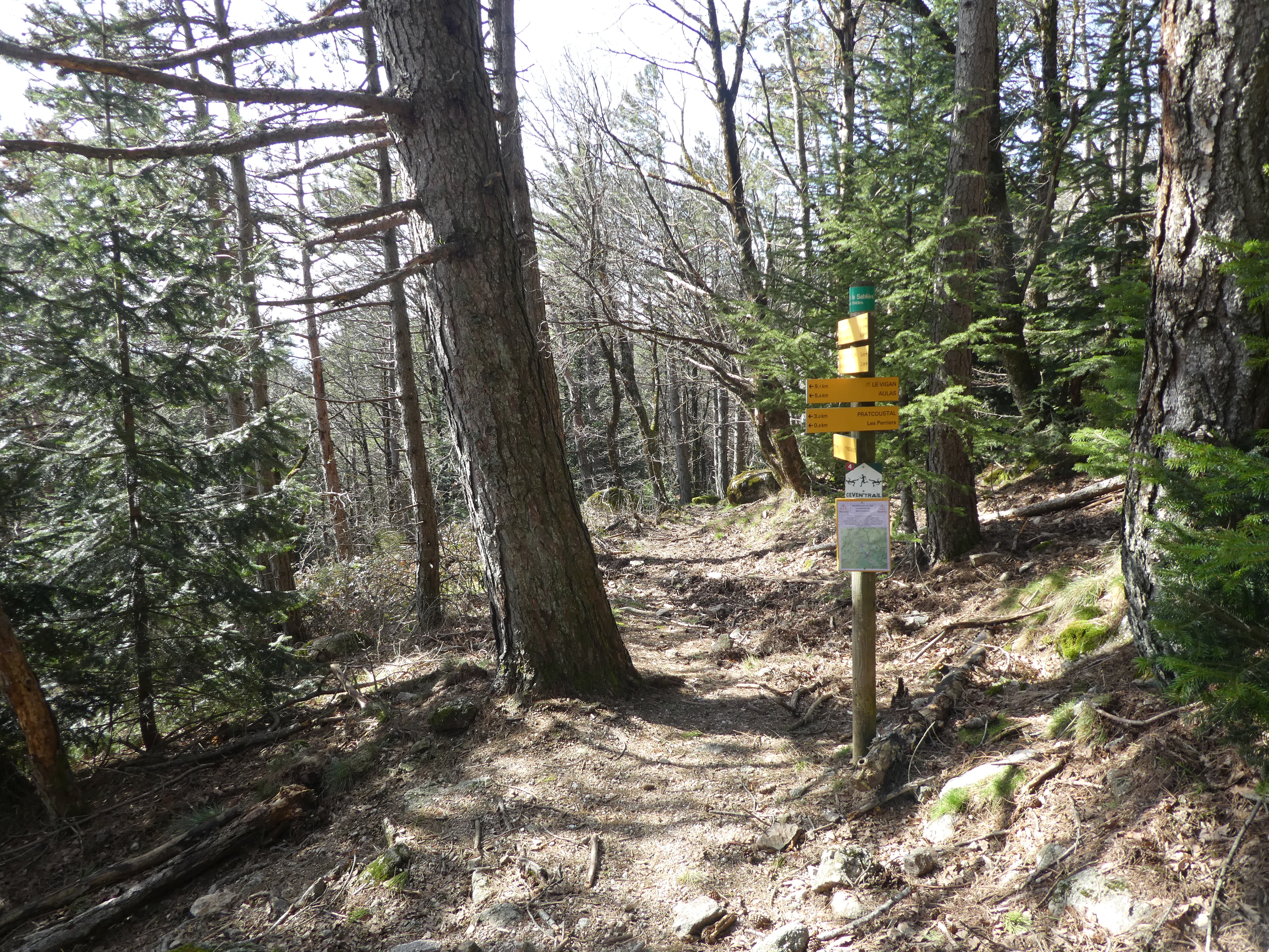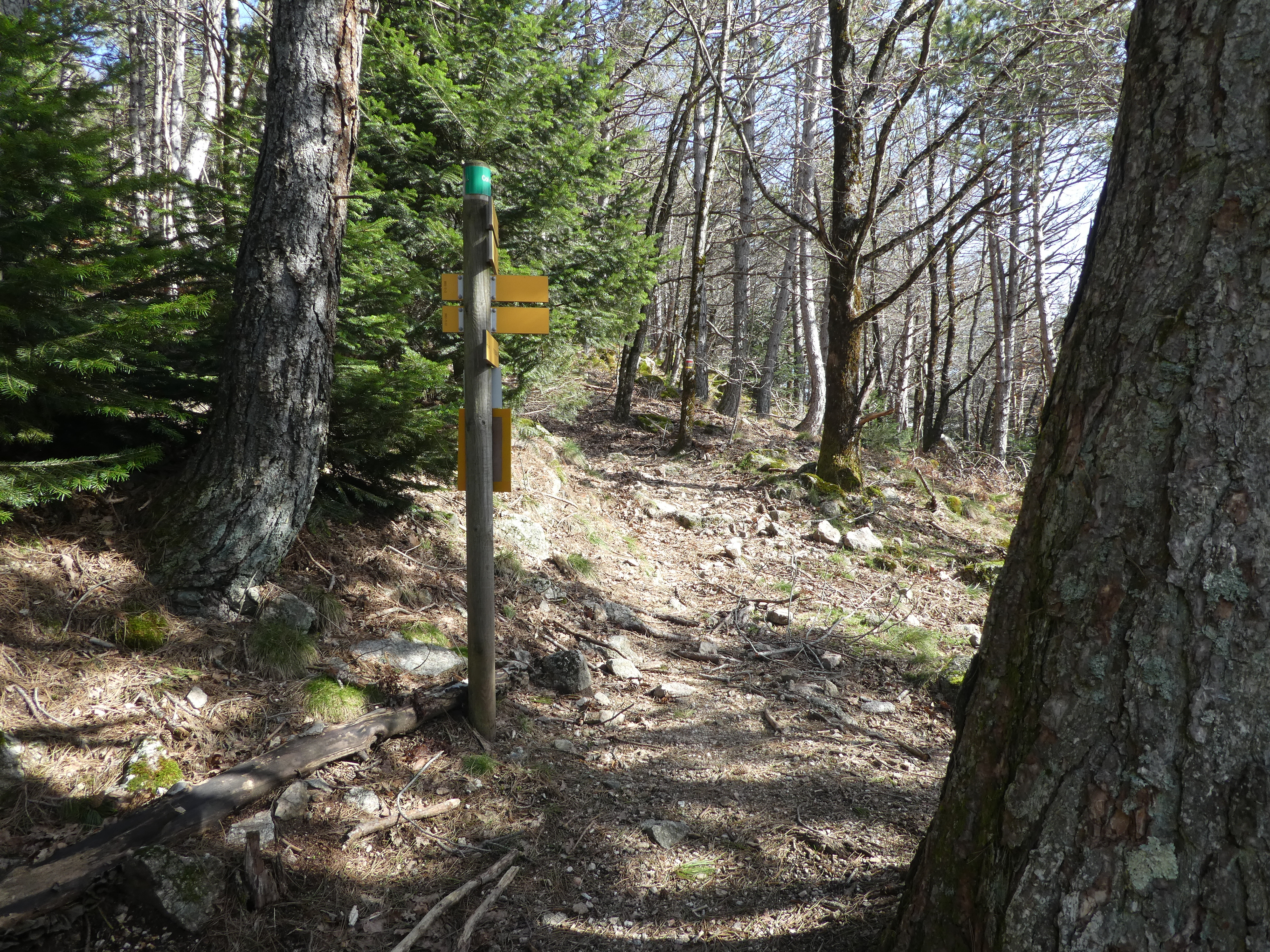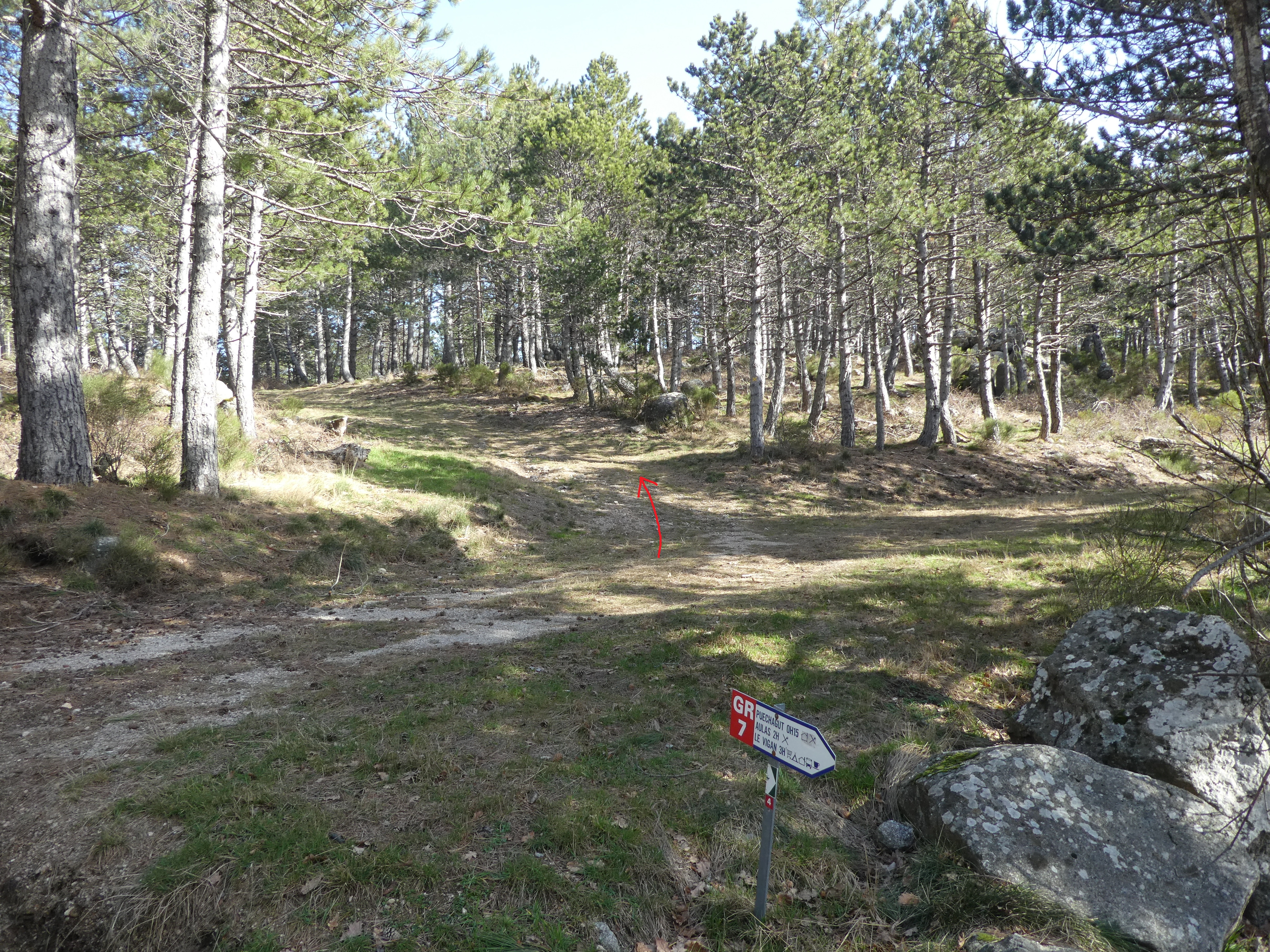 A ce croisement (500 mètres après le Col de la Sablière), quitter le GR7 partant sur la gauche pour suivre le chemin partant tout droit direction Rocher de Bonnetier, aucun balisage dorénavant