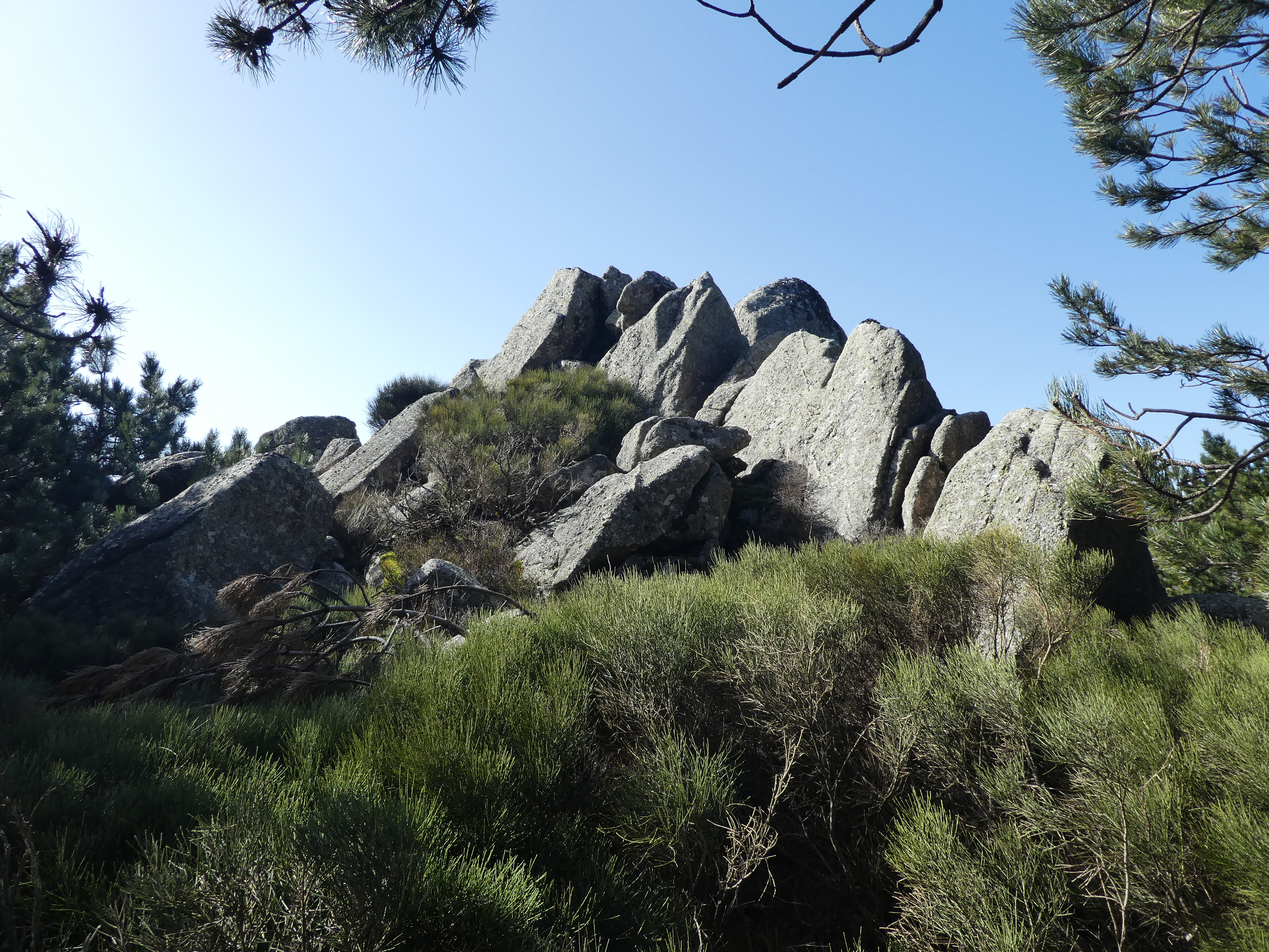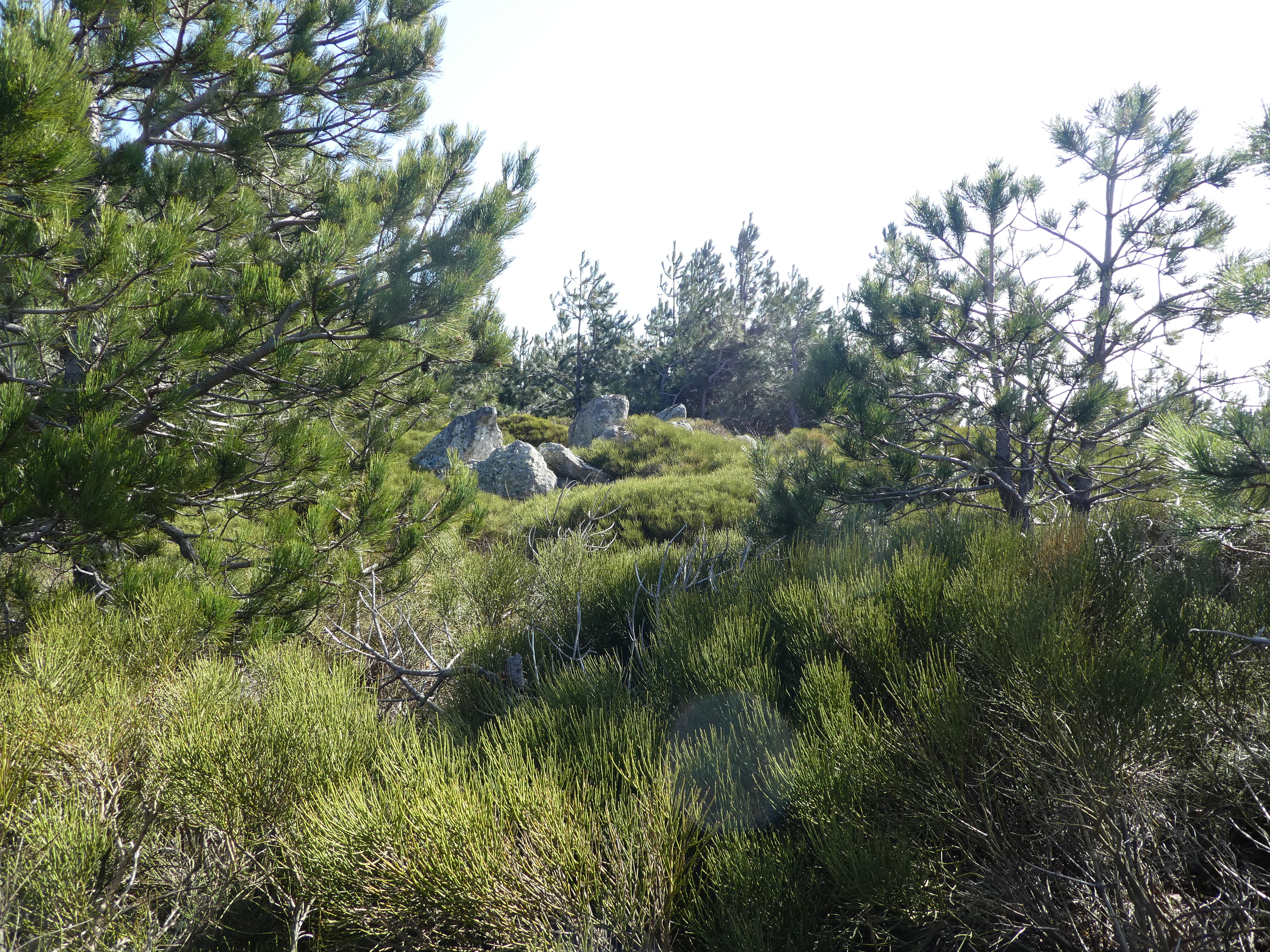 - Montée finale vers le Rocher de Bonnetier hors sentier et à vue à travers la basse végétation et les genêts (rochers à gravir sur la partie terminale)