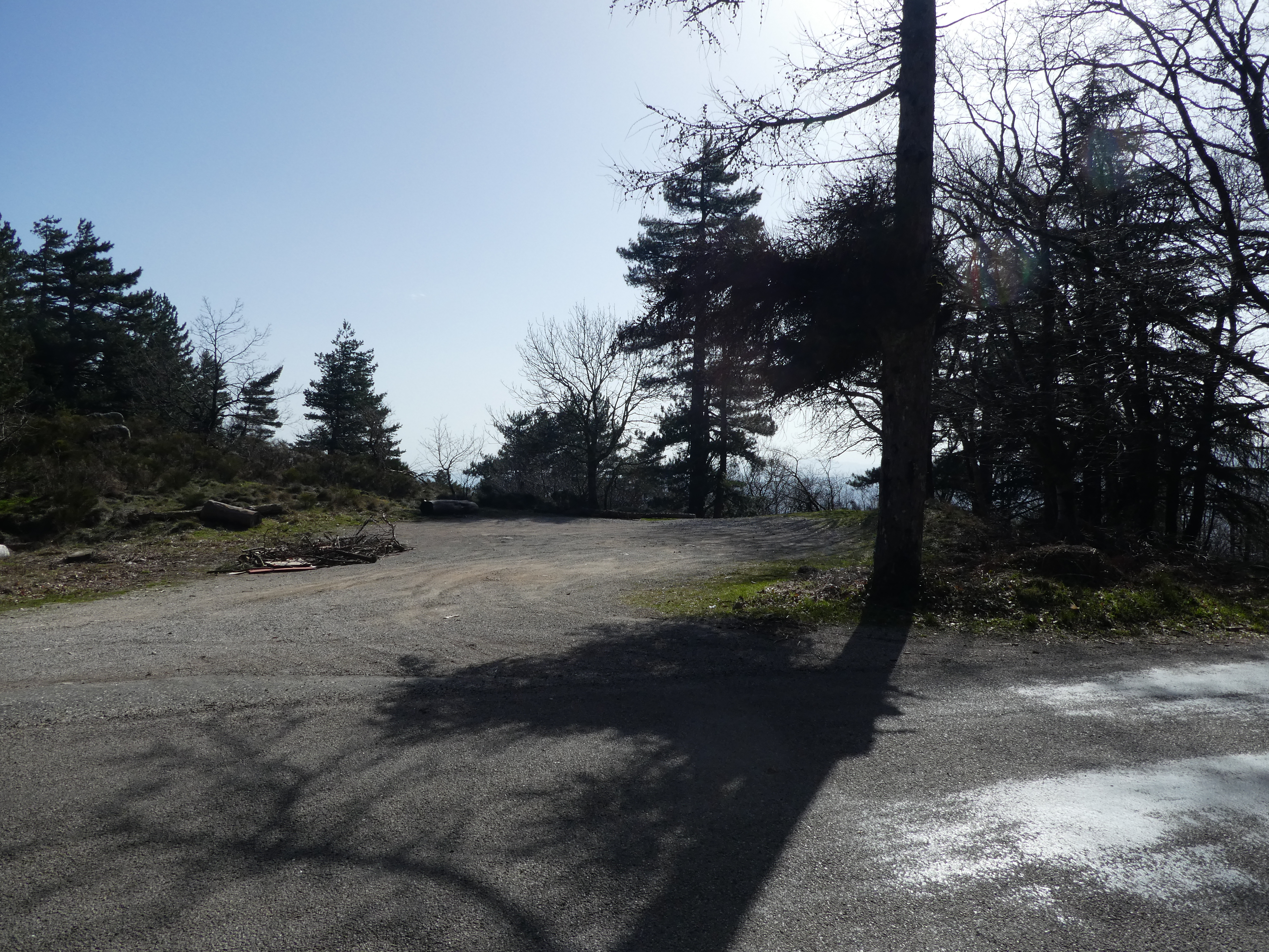 A ce croisement avec la D48n (150 mètres après le Col de la Sablière) (1014 m), suivre le chemin descendant tout droit en face de la route direction Aulas, balisé en jaune
