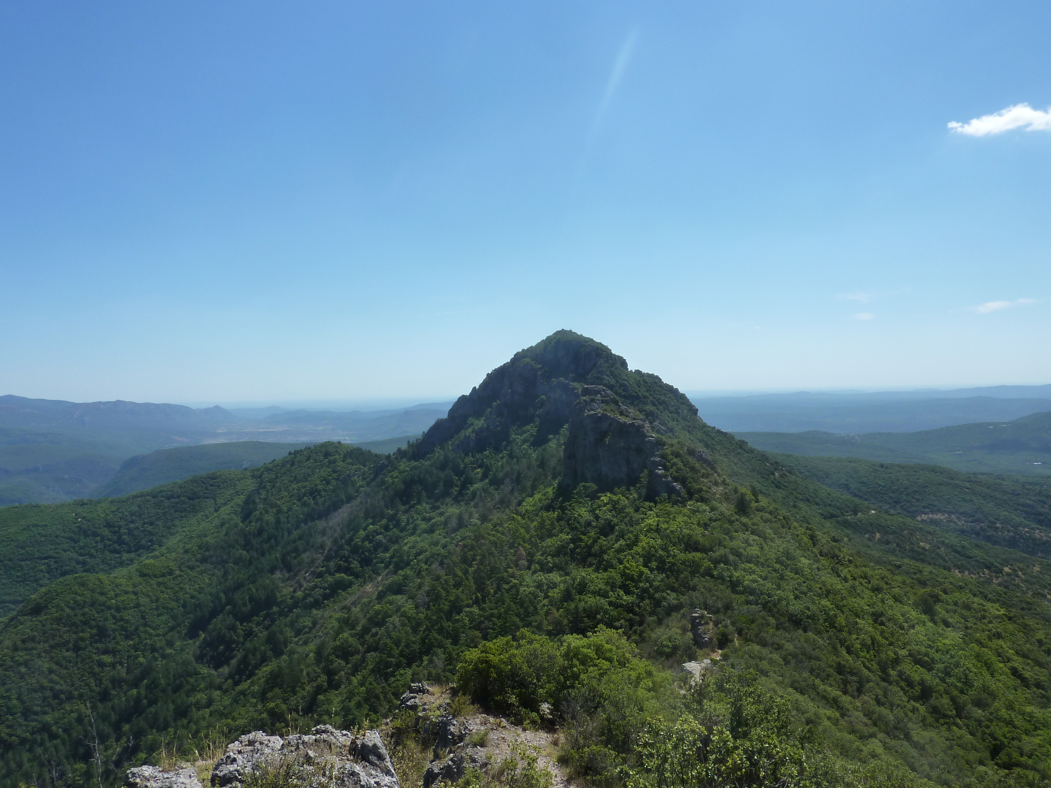 Arrivée au sommet du Roc Peyras (803 m) : beau panorama sur les sommets des Cévennes suménoises et gangeoises, de la Vallée du Vidourle et de la Vallée Borgne, sur la Montagne de la Séranne ... le Pic d'Anjeau tout proche est accessible par des pas d'escalade d'après certains topos (non réalisé)