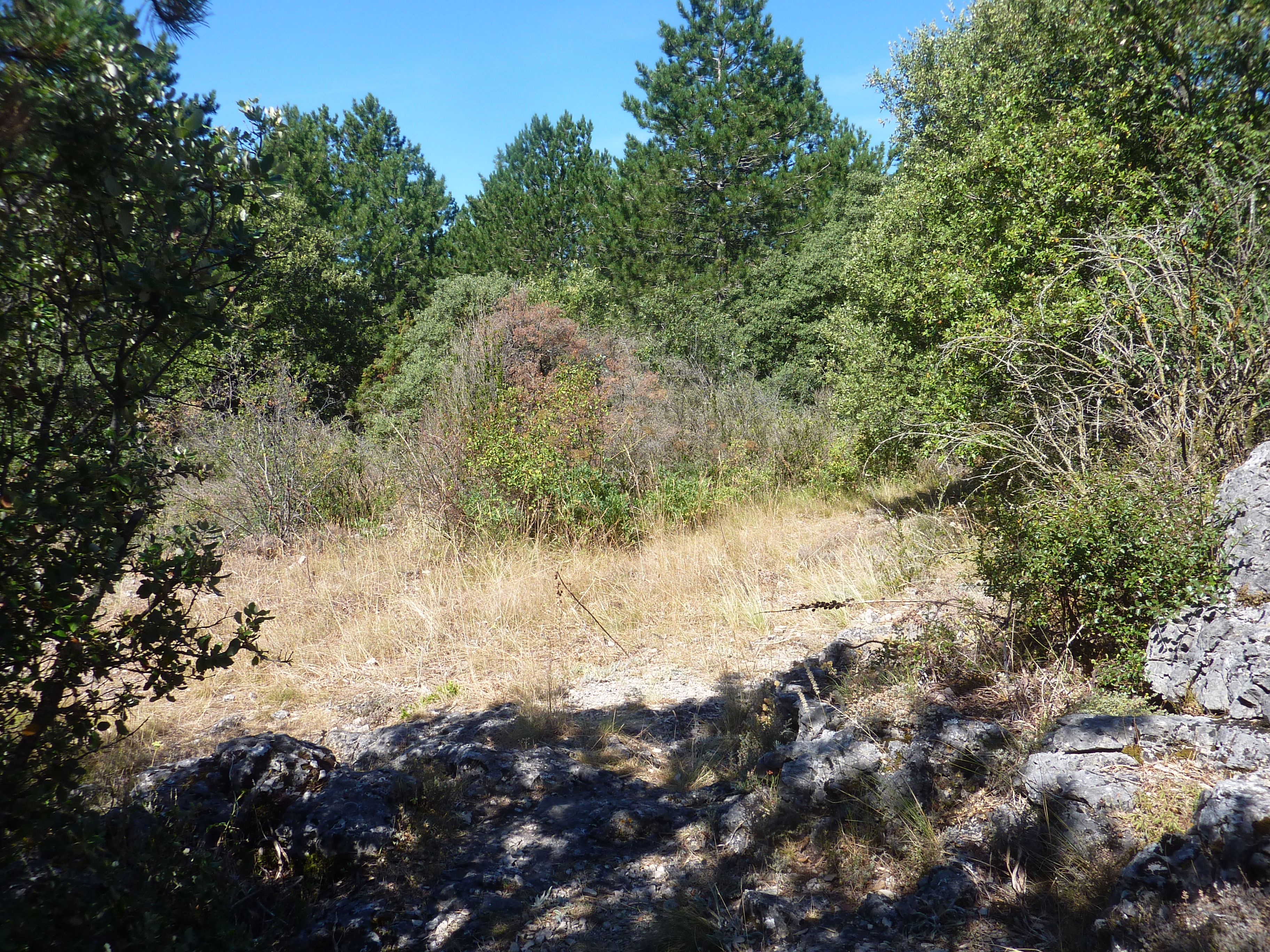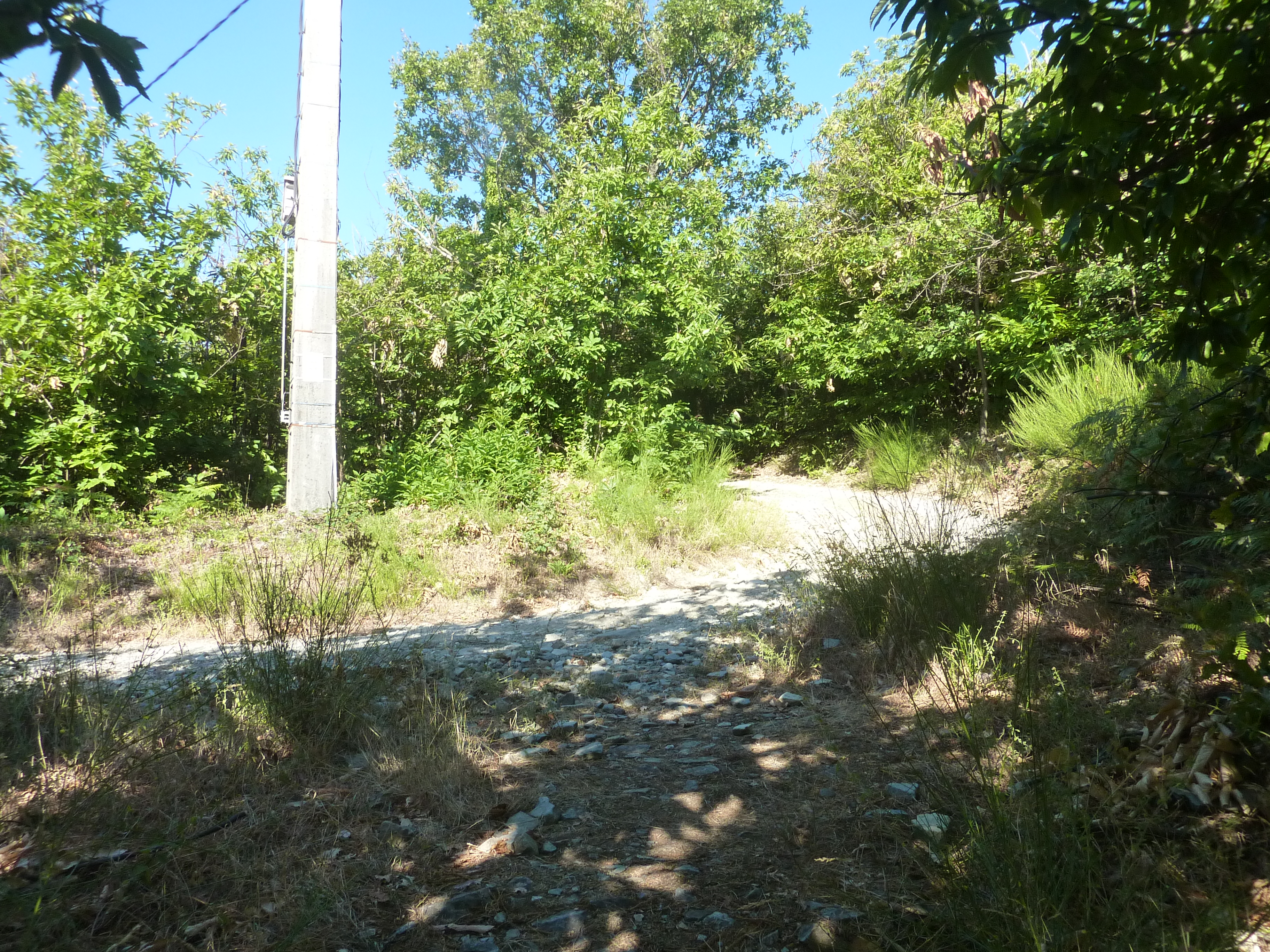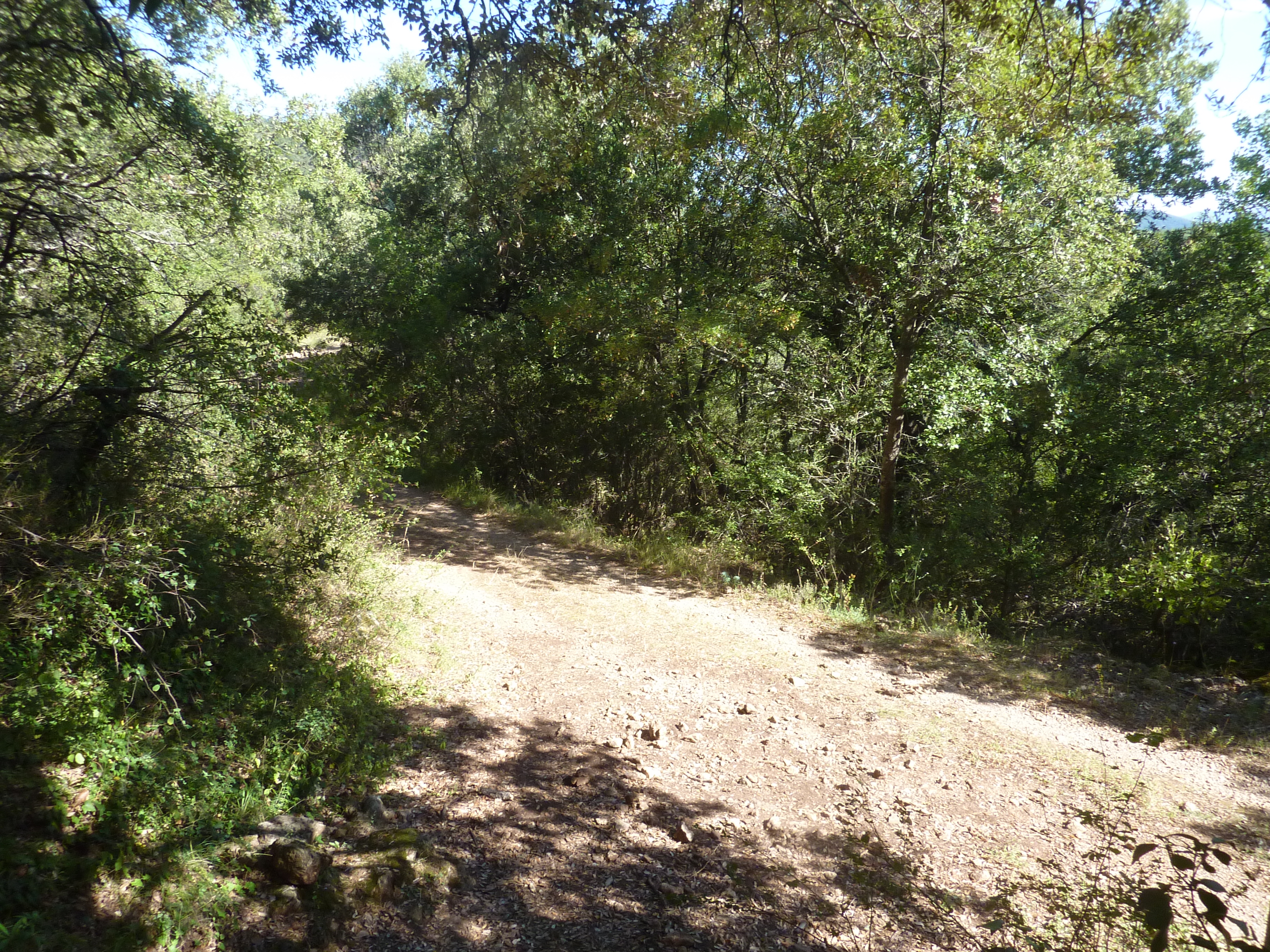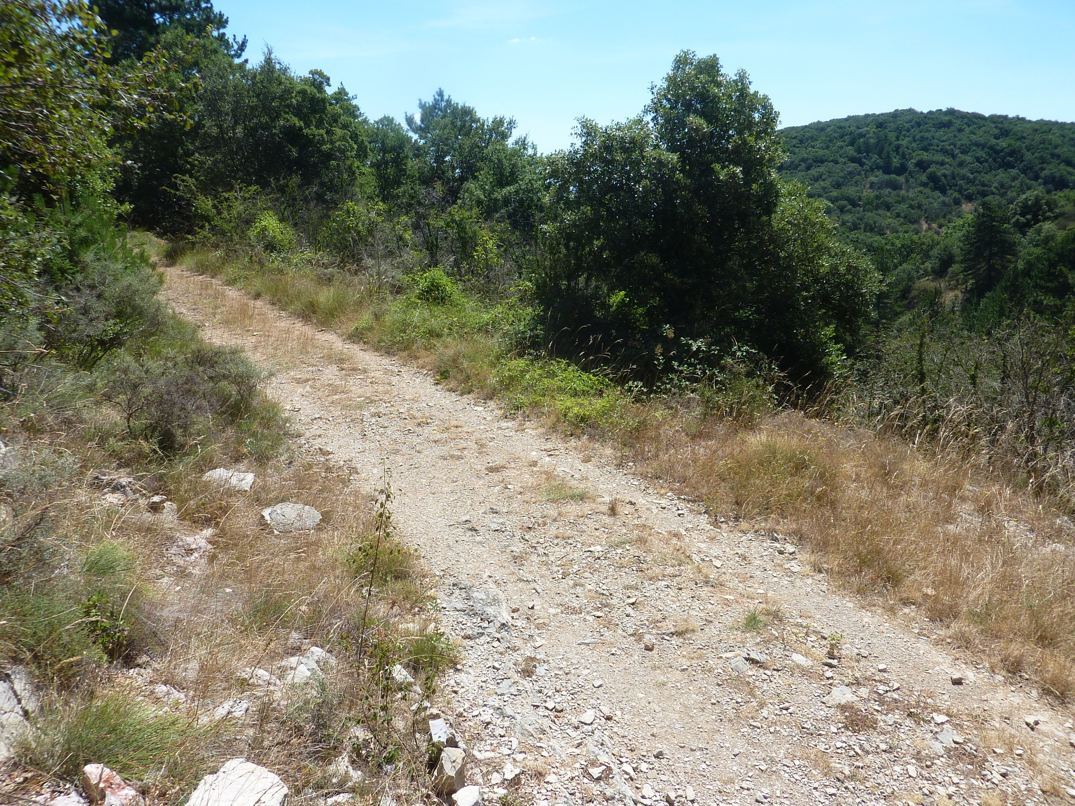 Plan d'Andiou (632 m) : suivre la piste partant tout droit direction Saint-Laurent-le-Minier, balisé en jaune (pour rappel, le chemin menant à la Ferme d'Anjeau et mentionné en pointillés roses sur la carte IGN n'est plus balisé et n'existe certainement plus)