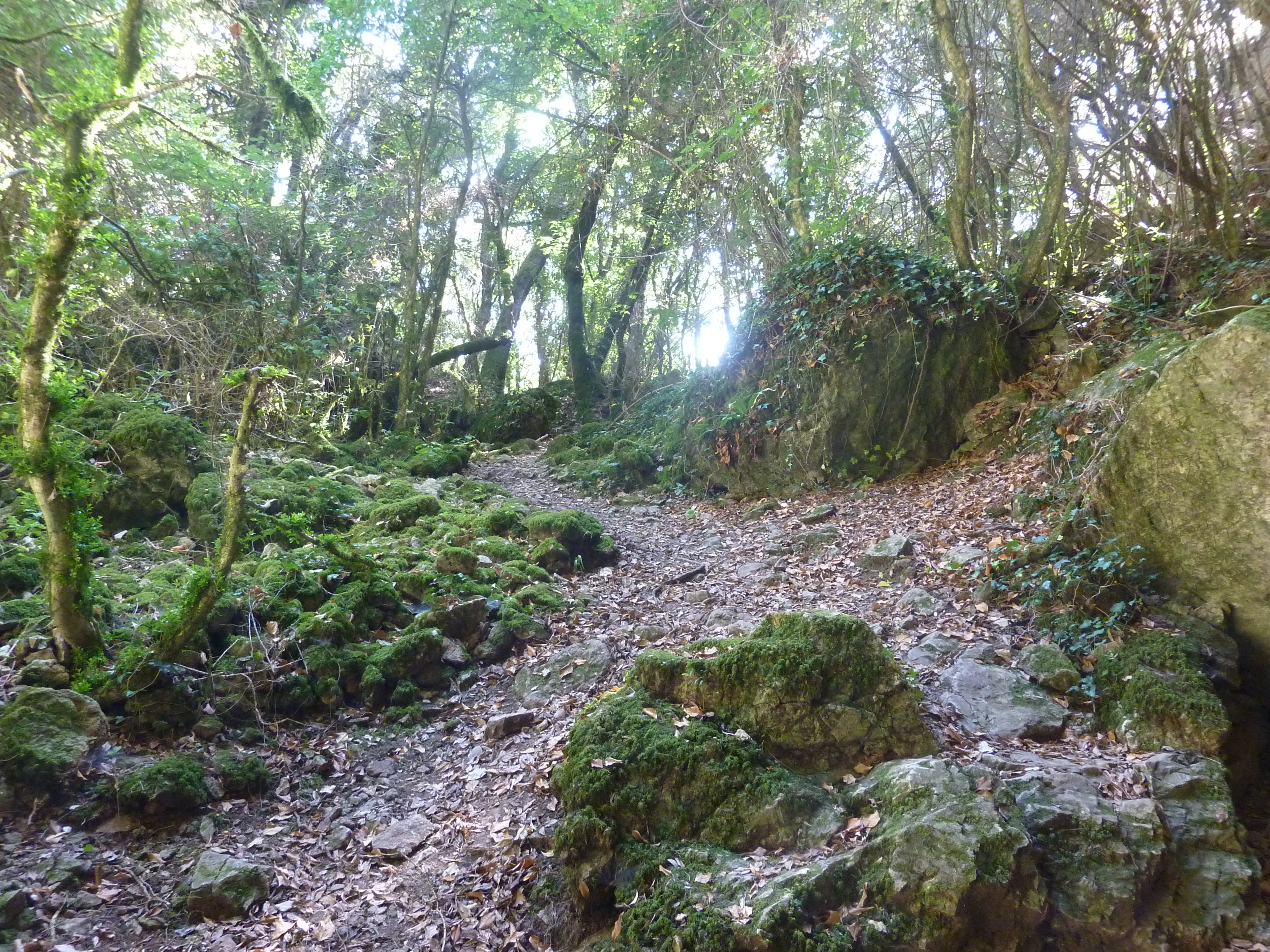 Chemin des Escoliers (487 m) : suivre la piste partant tout droit direction Grotte d'Anjeau, balisé en jaune (pour rappel, le chemin mentionné en pointillés roses sur la carte IGN et menant à la Ferme d'Anjeau n'est plus balisé en jaune)