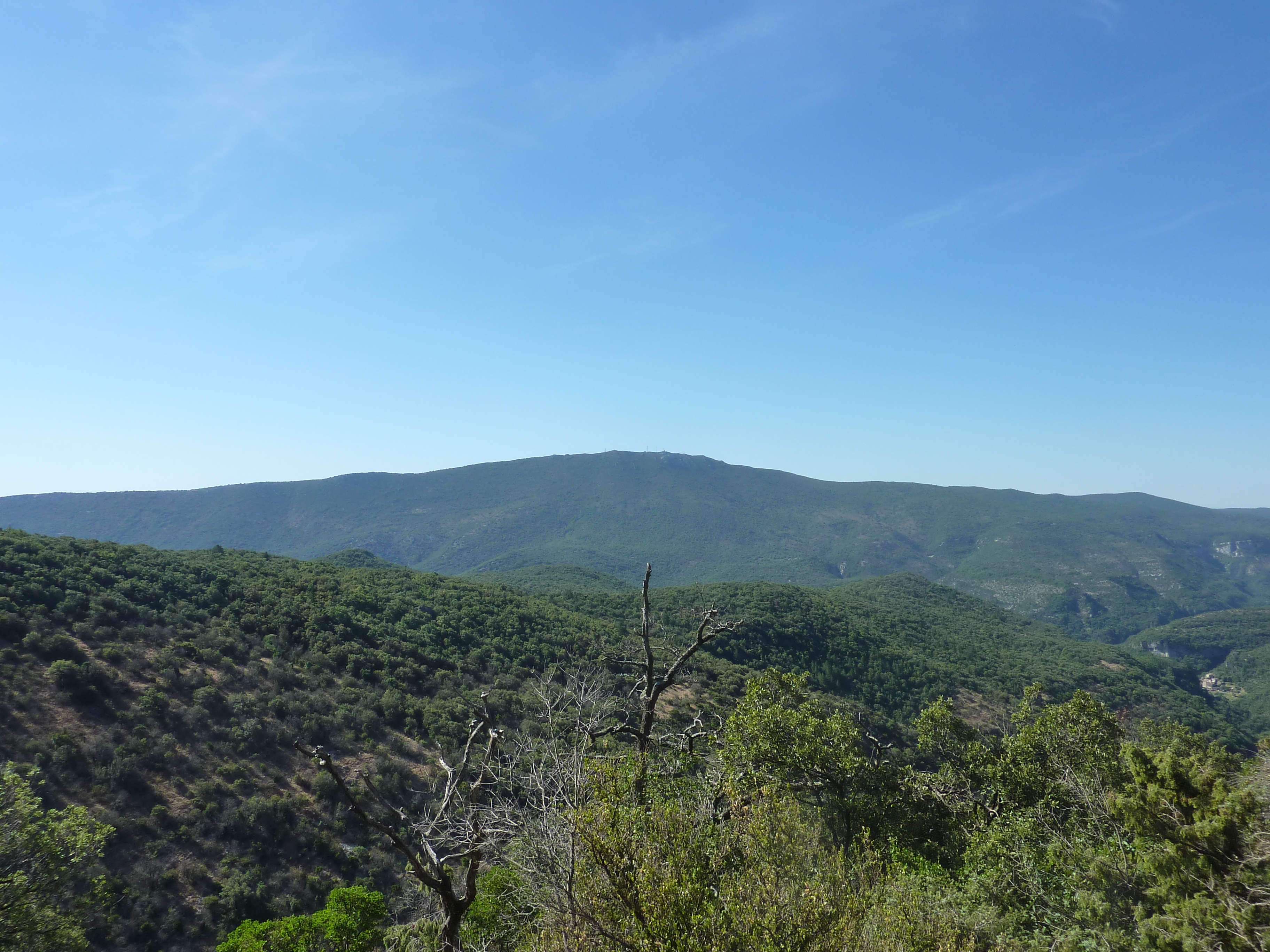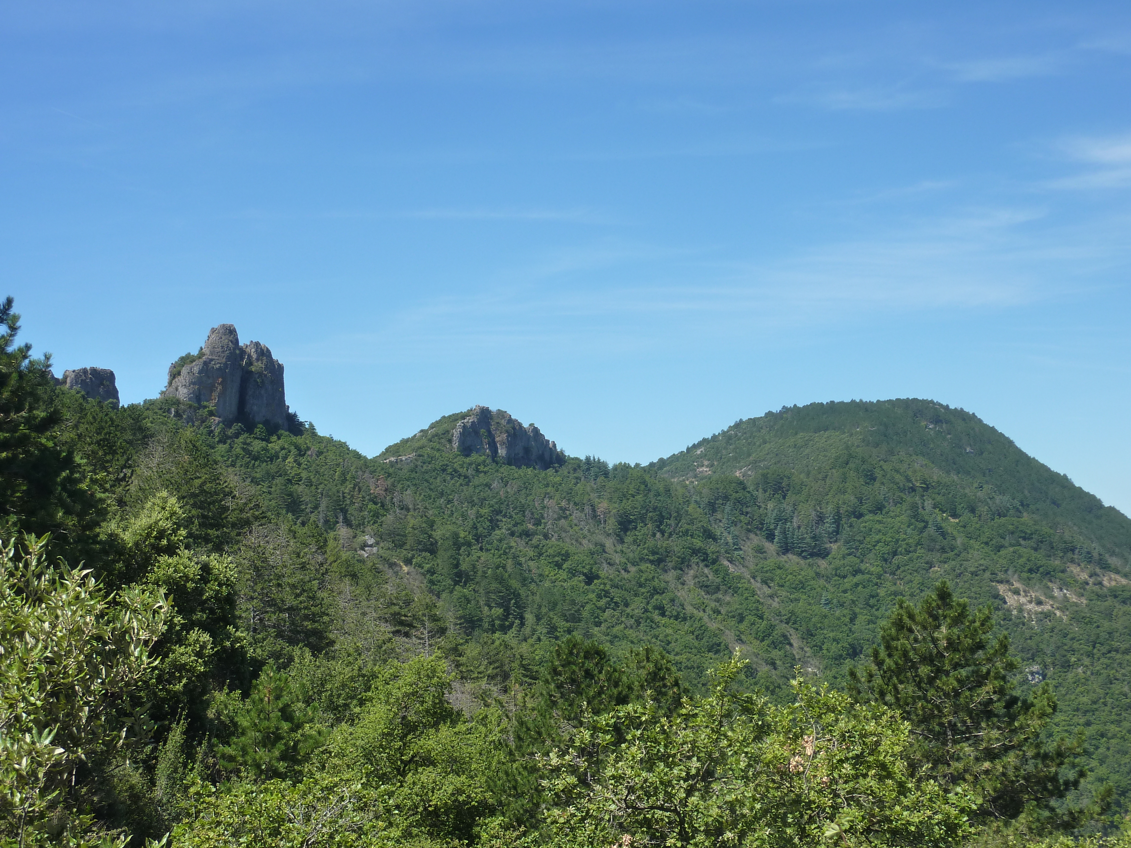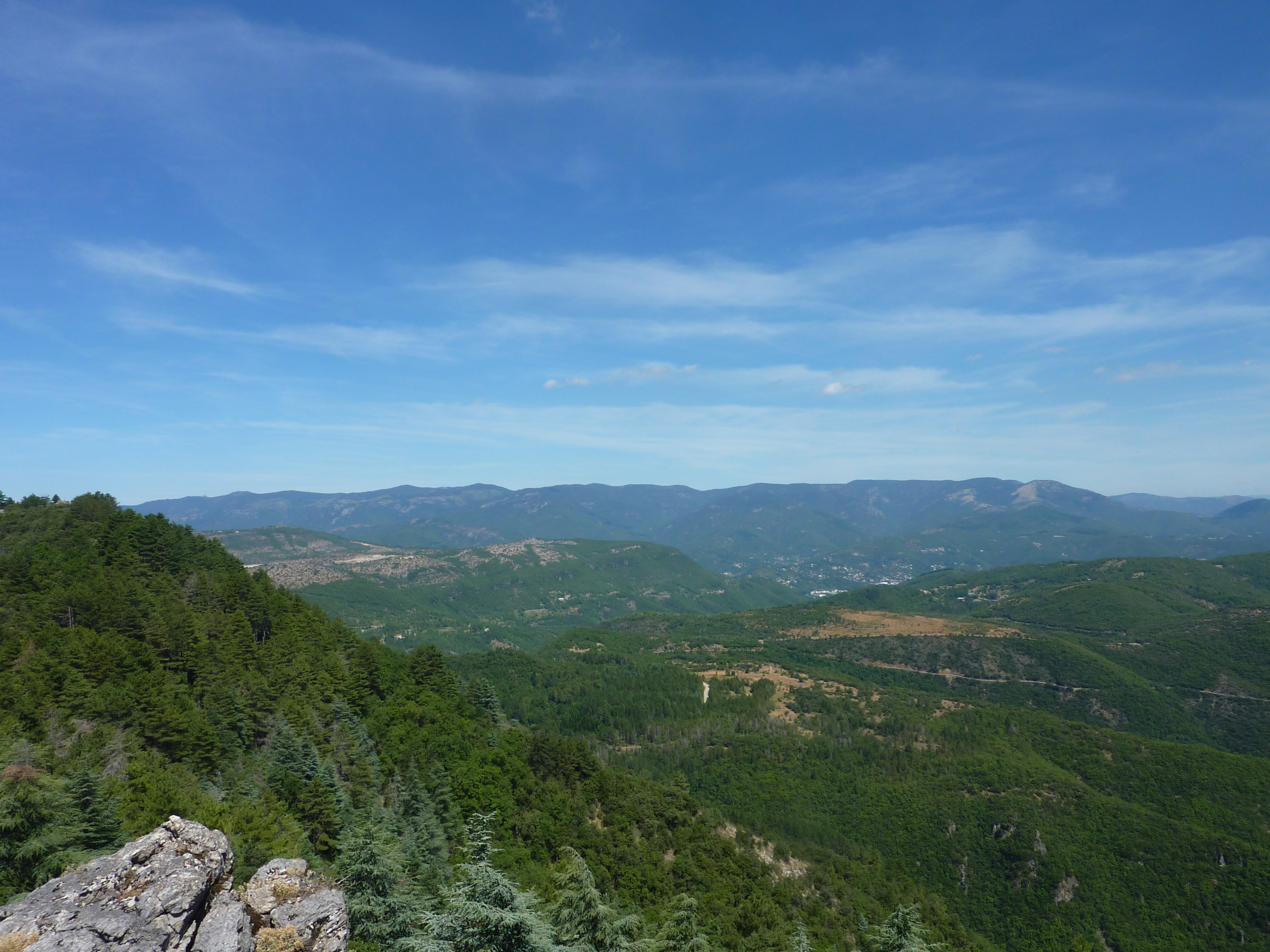 Arrivée au sommet des Rochers de la Tude (895 m) : panorama restreint sur les sommets du Pays Viganais et Gangeois, ainsi que sur ceux de la Vallée Borgne ... le Mont Lozère est également visible