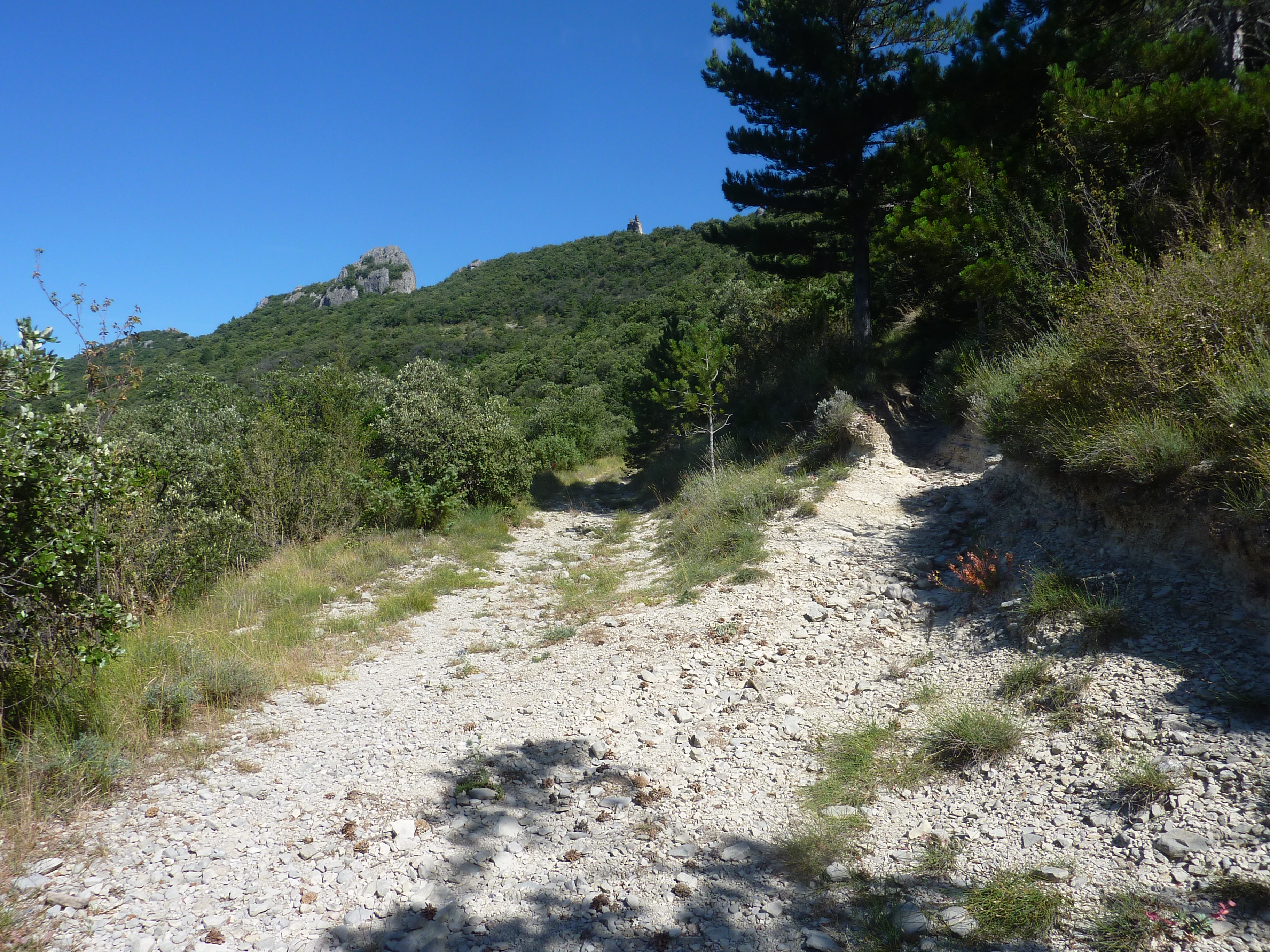La Baraquette (747 m) : suivre le chemin montant tout droit direction Roc Castel, balisé en jaune (le sommet nommé Roc Castel est en réalité le Roc Peyras ... le Roc Castel n'étant apparemment pas accessible par voie de randonnée)