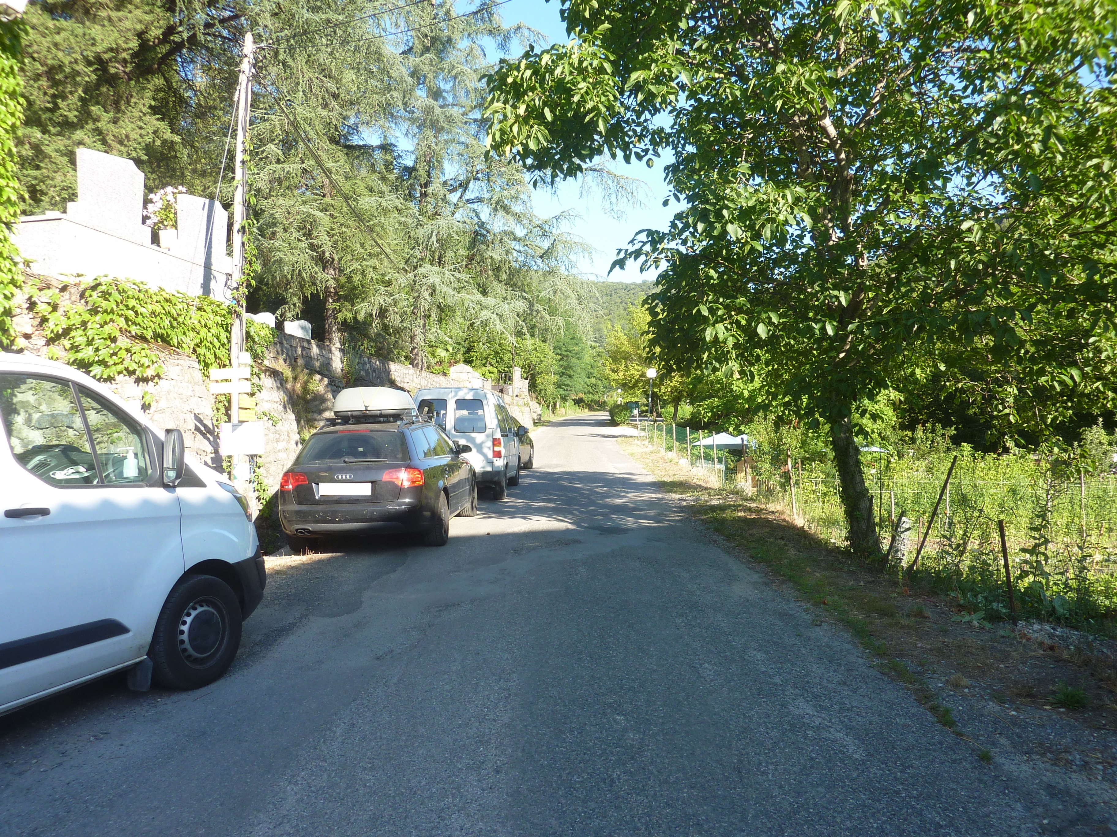 A cette intersection (200 mètres après le lieu-dit "Saint-Laurent-le-Minier - Cimetière"), suivre la rue partant sur la gauche direction Saint-Laurent-le-Minier - Mairie, aucun balisage dorénavant