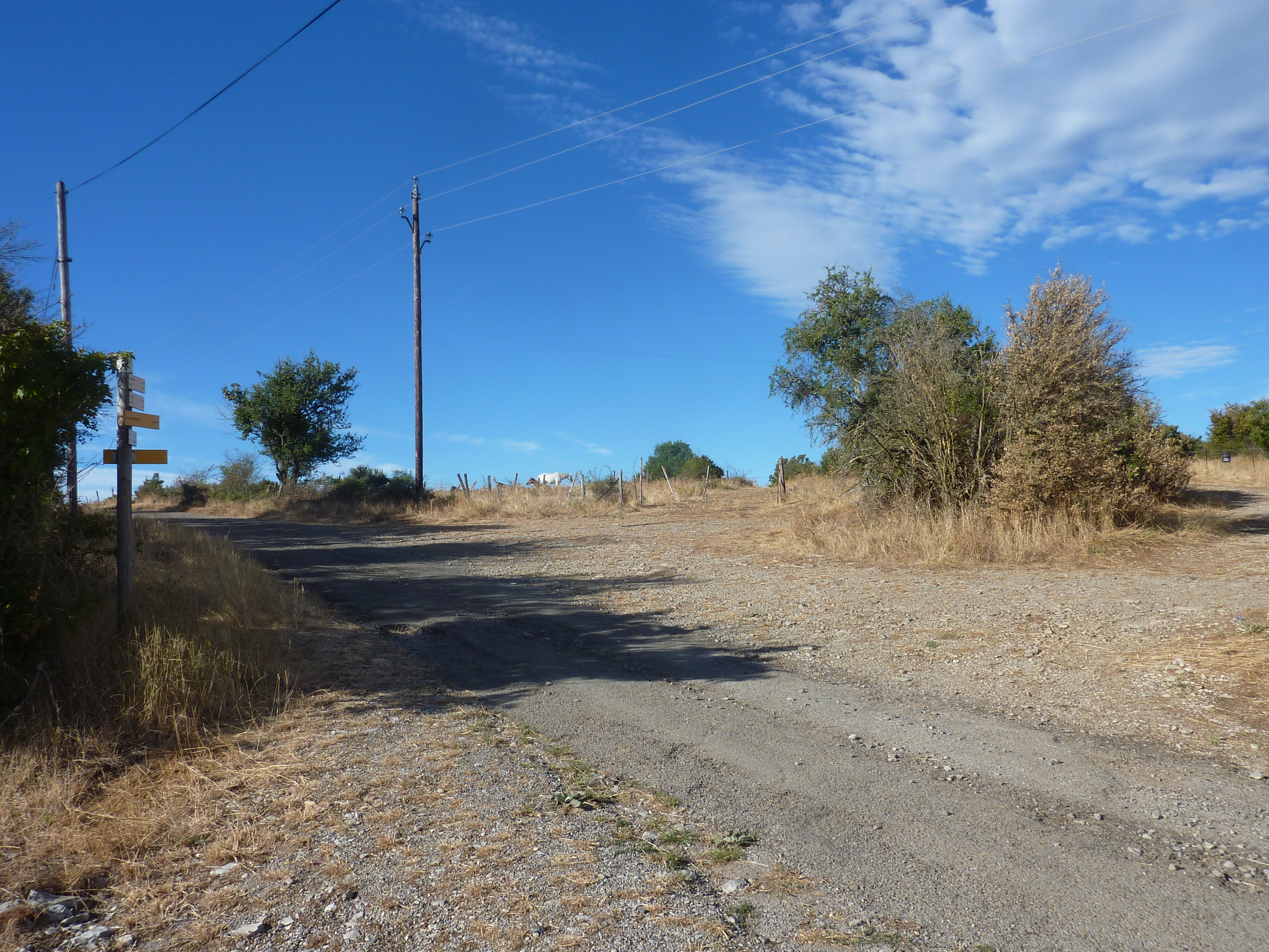 A ce croisement avec le chemin bien tracé venant du hameau de Navas, suivre ce dernier sur la gauche direction Navas, balisé sporadiquement en jaune dorénavant