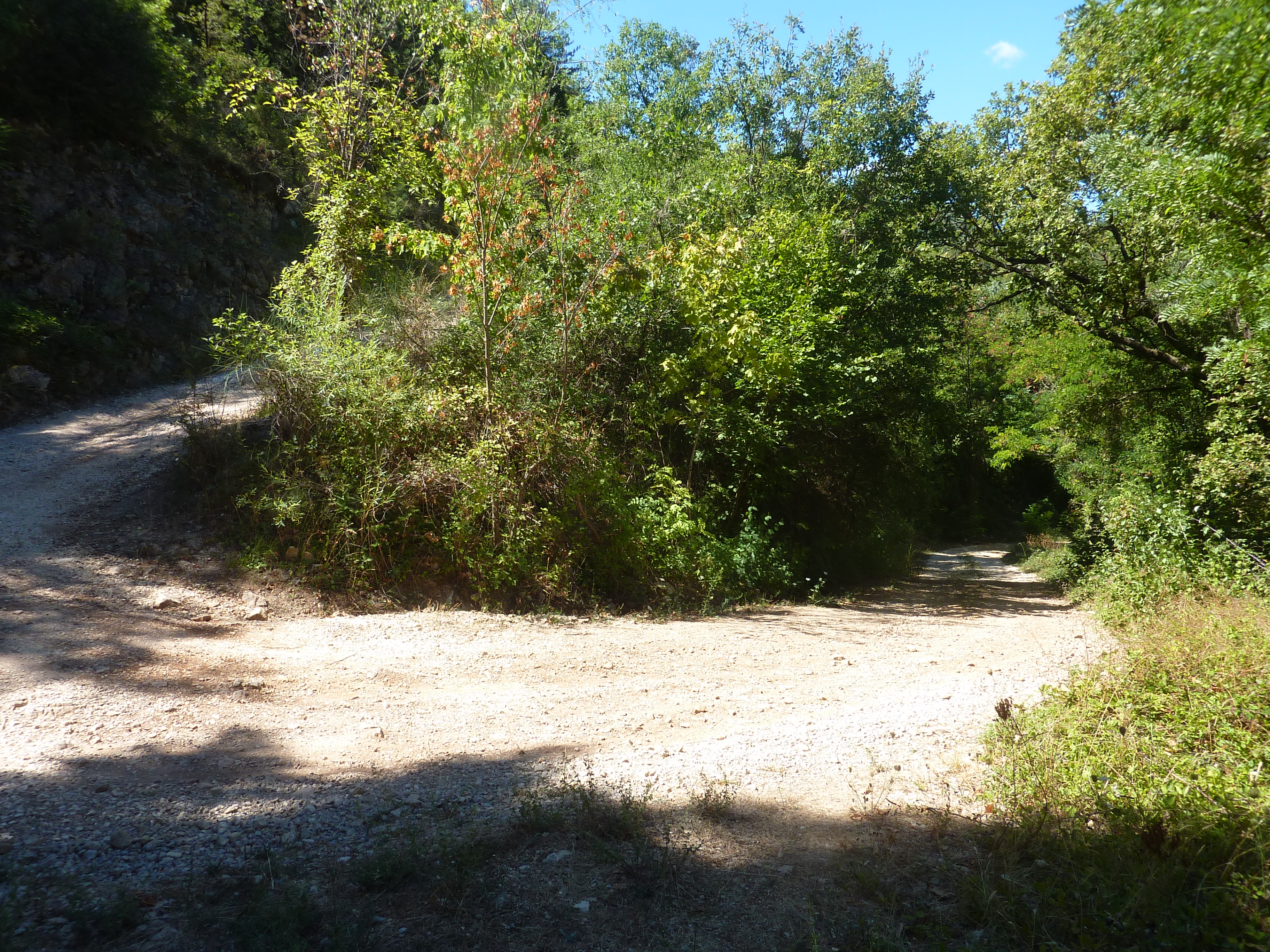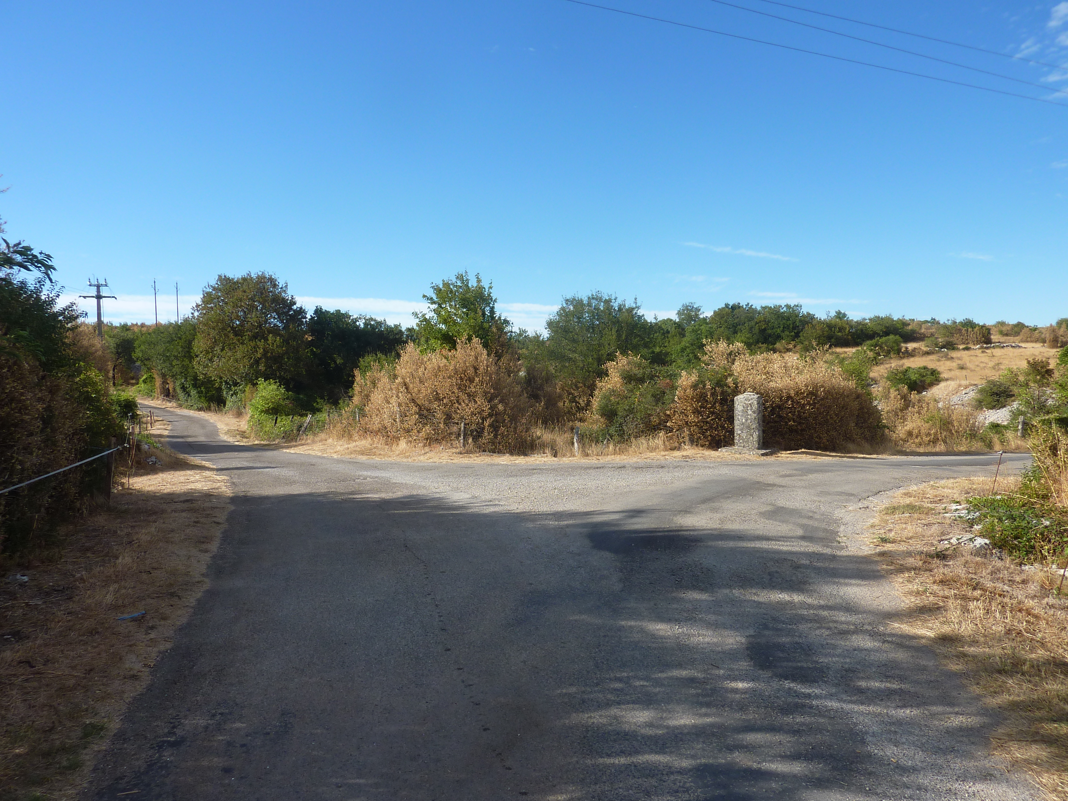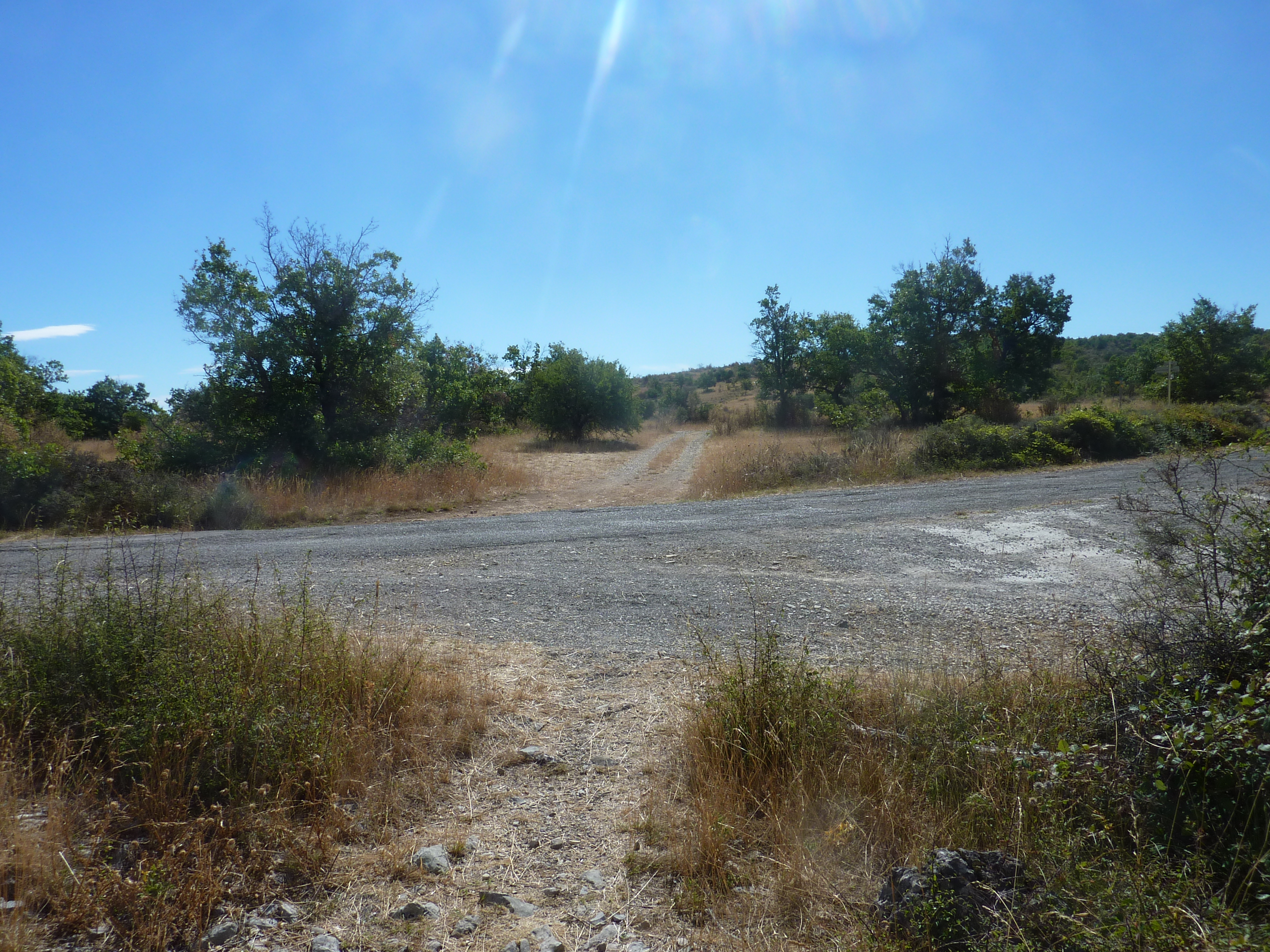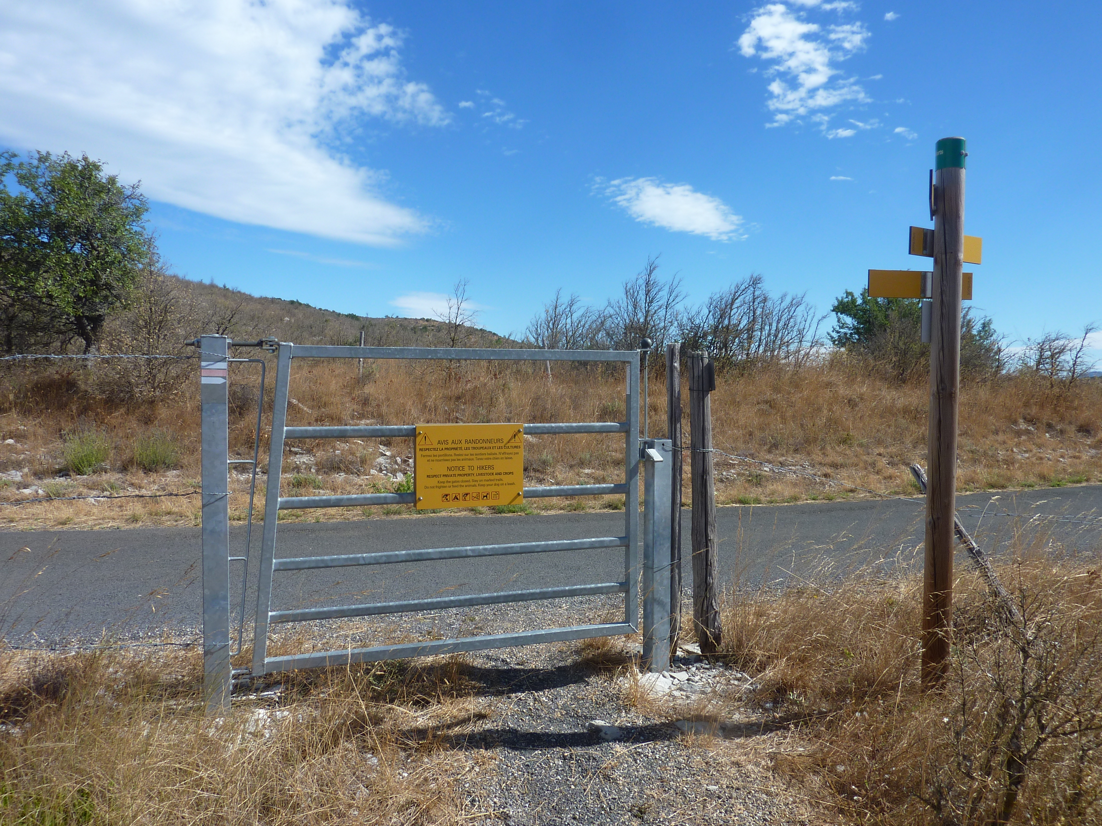 A ce croisement avec une piste au bout de la descente du Causse de Blandas (2000 mètres après avoir franchi le grillage précédemment mentionné), suivre cette dernière tout droit direction Bez-et-Esparron, balisé en jaune et rouge, et en jaune