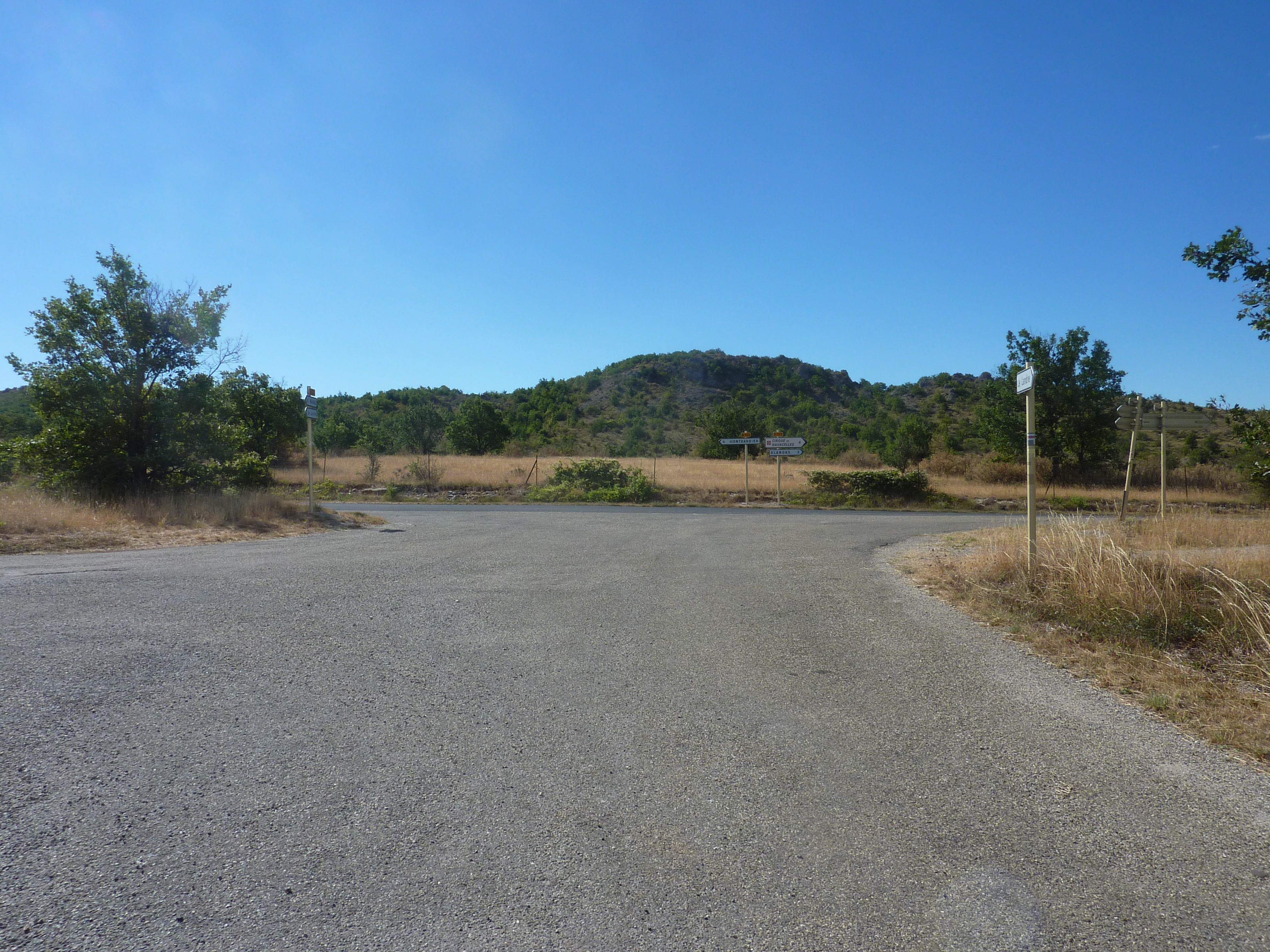 Le Landre (730 m) : suivre la route partant tout droit direction Montdardier, balisé en rouge et blanc, et en jaune dorénavant