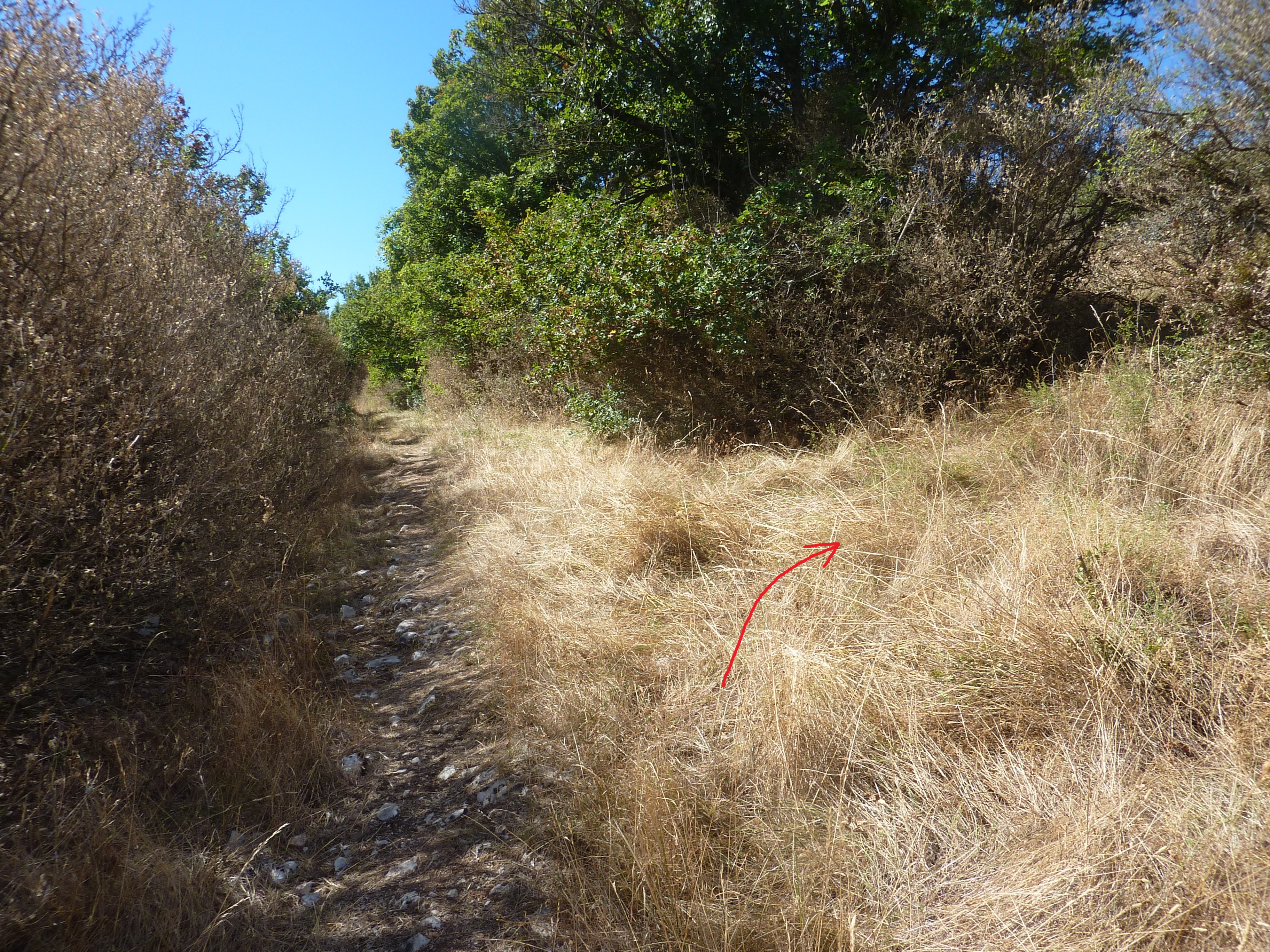 A ce croisement très peu visible (25 mètres après le lieu-dit "le Planas"), quitter le chemin bien tracé pour suivre le semblant de sente partant sur la droite direction Serre Barral, aucun balisage dorénavant