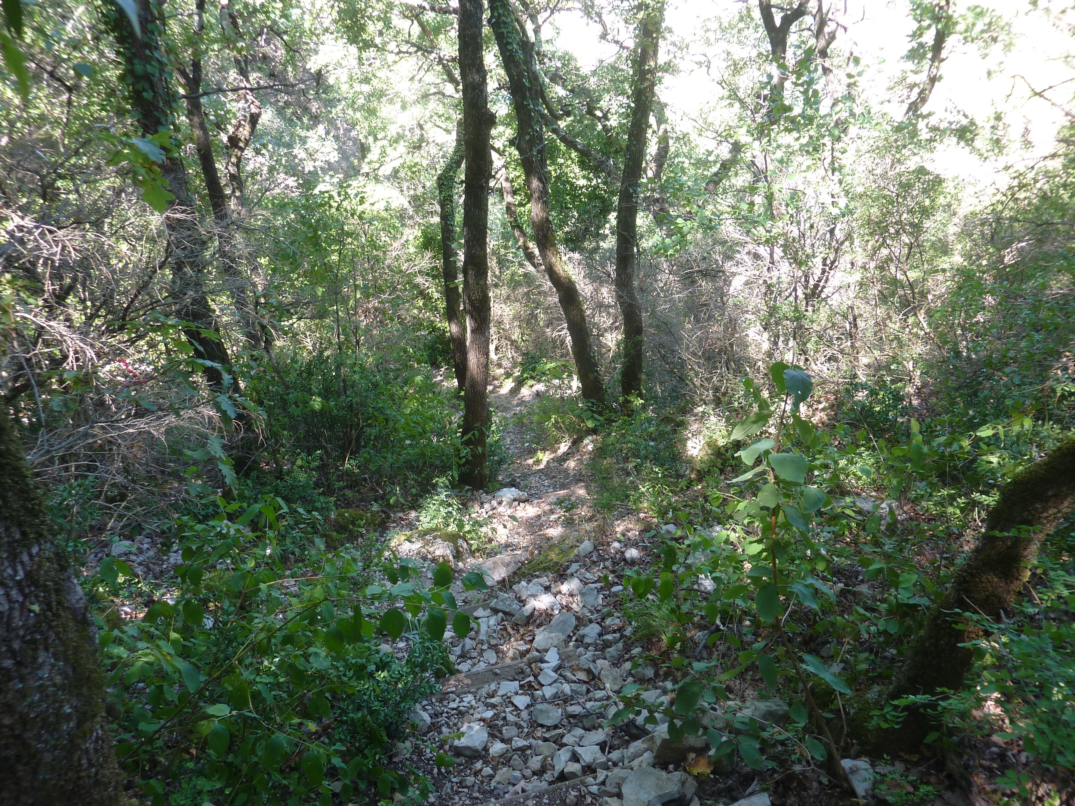 Au niveau de ce grillage, suivre le chemin partant tout droit et amorçant sa raide descente vers la Vallée de l'Arre direction Bez-et-Esparron, balisé en jaune et rouge, et en jaune