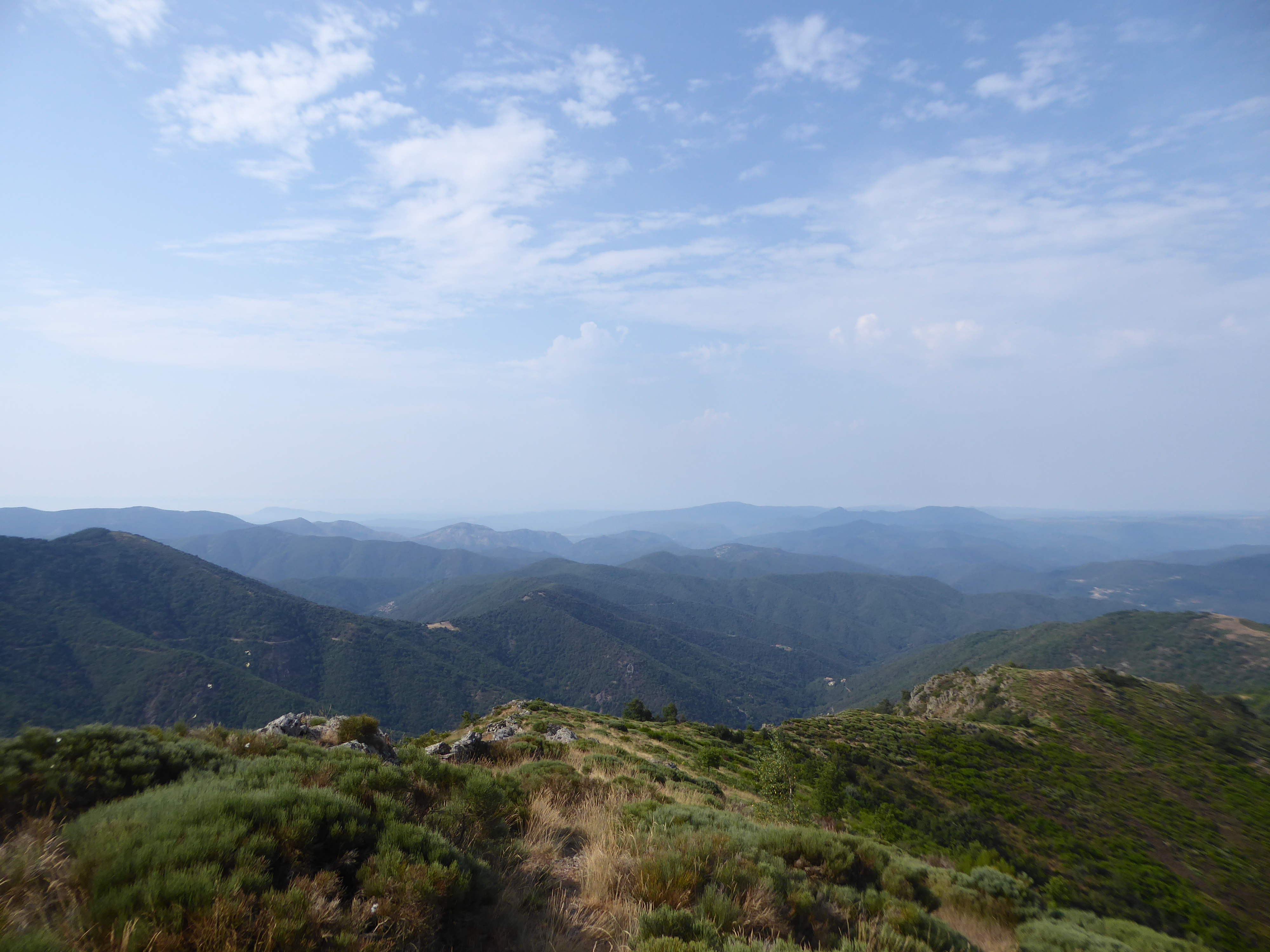 Arrivée au sommet de la Serre de Borgne (1066 m) : très beau panorama aujourd'hui (contre-jour dû au voile nuageux ...) sur les Cévennes gardoises, lozériennes et héraultaises ... de la Séranne au Mont Bouquet en passant par l'Aigoual et le Mont Lozère