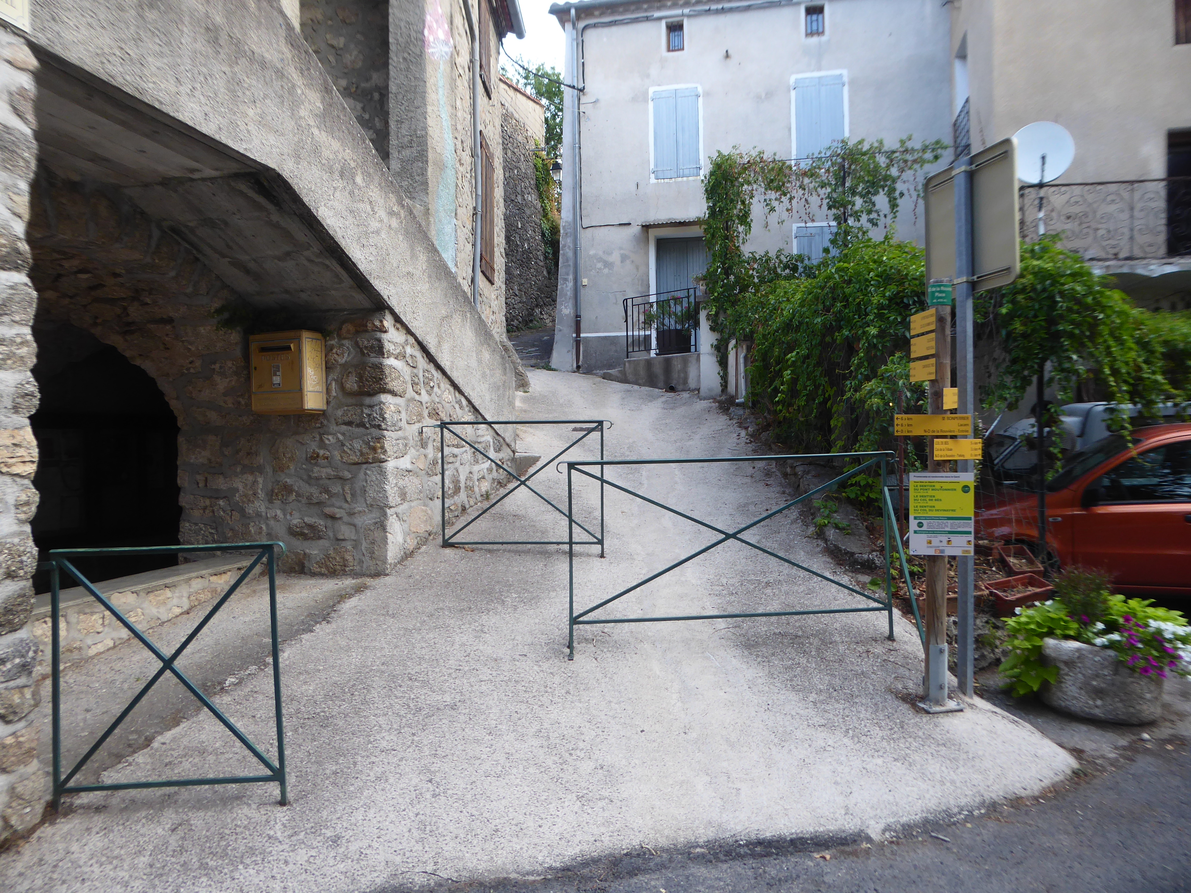 Notre-Dame-de-Rouvière - Entrée (408 m) : suivre la route partant tout droit direction Notre-Dame-de-Rouvière - Place, balisé en rouge et blanc