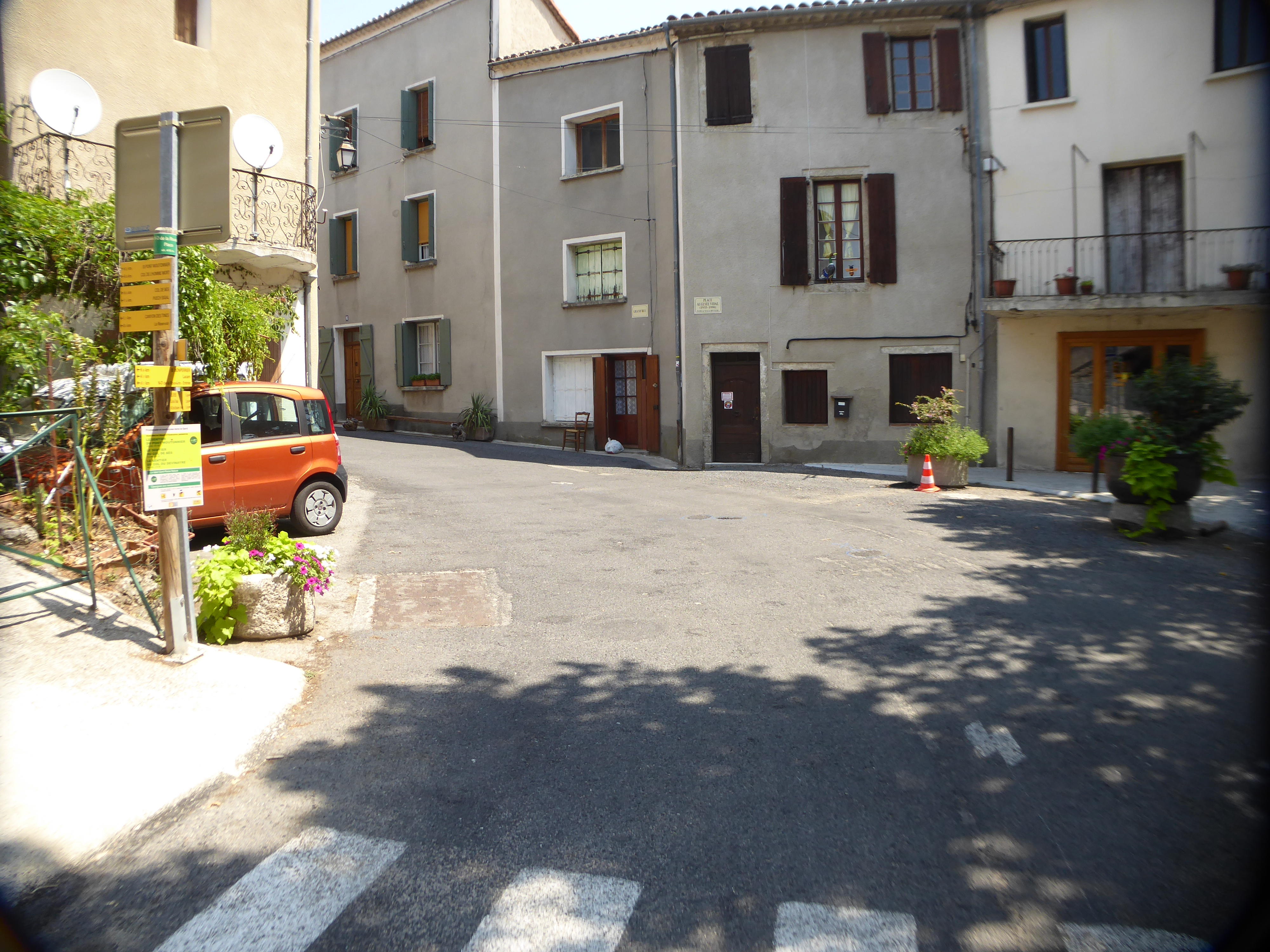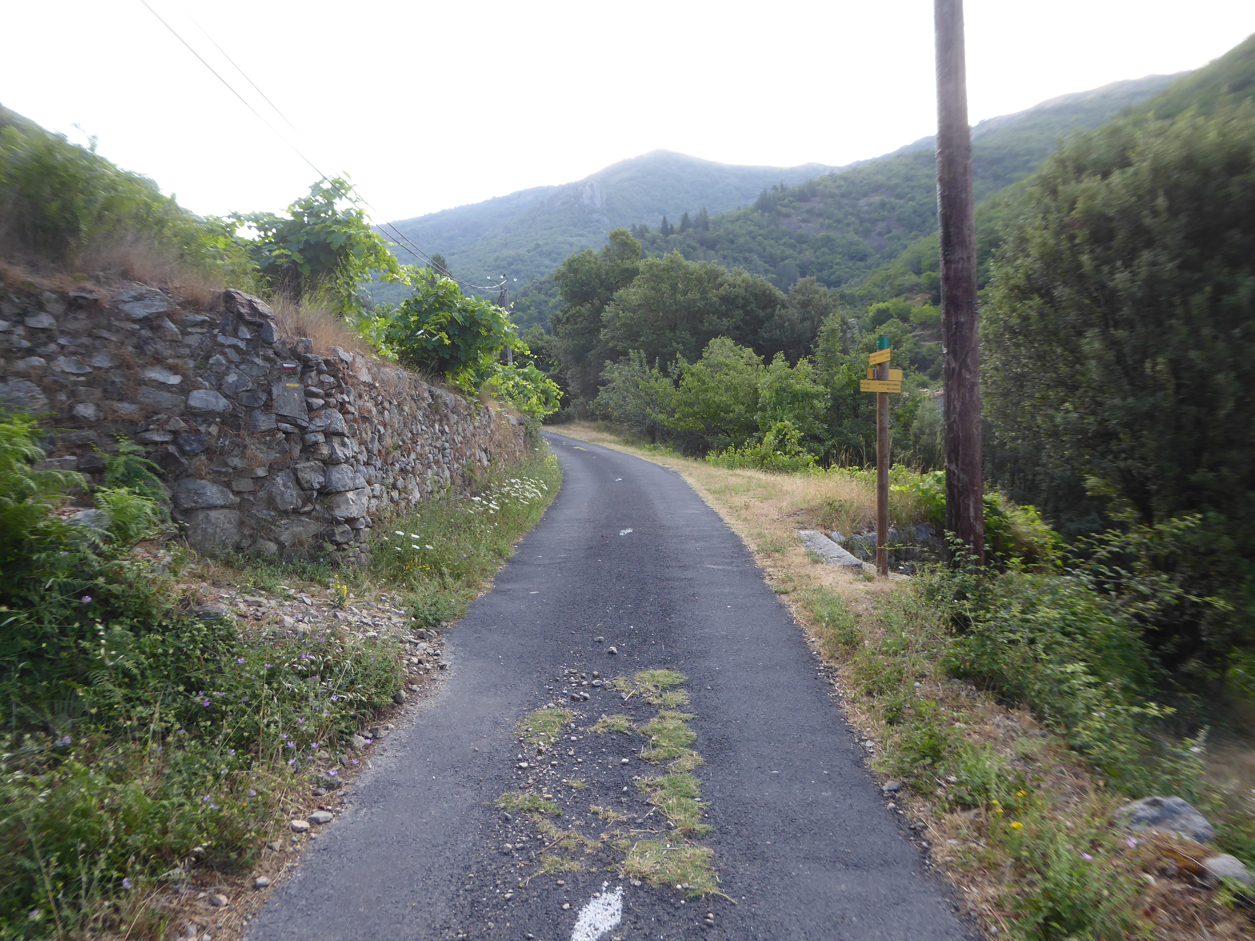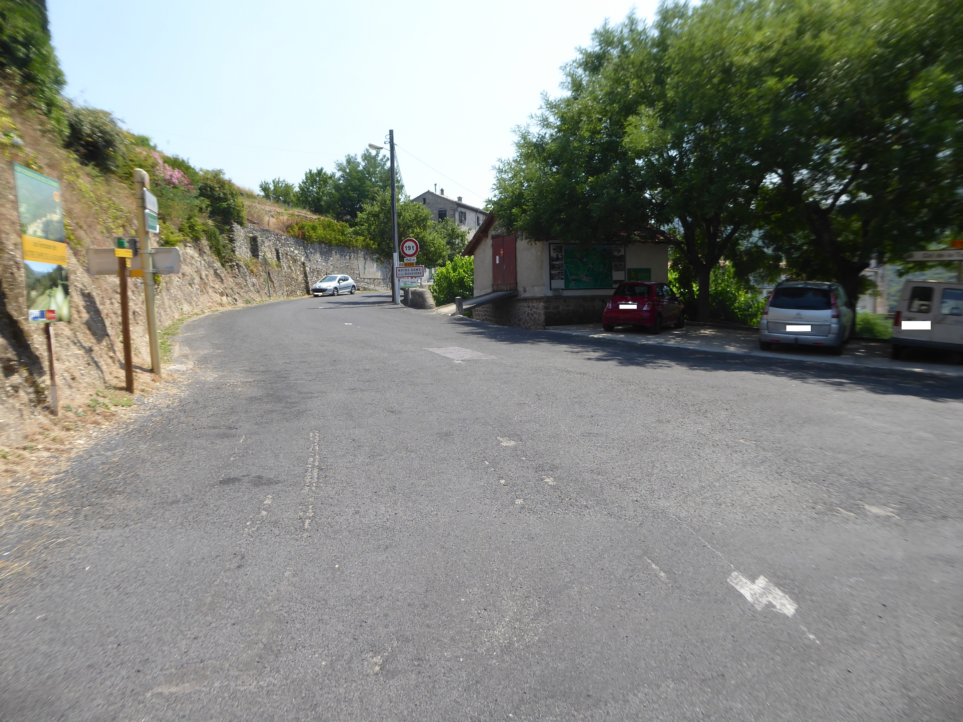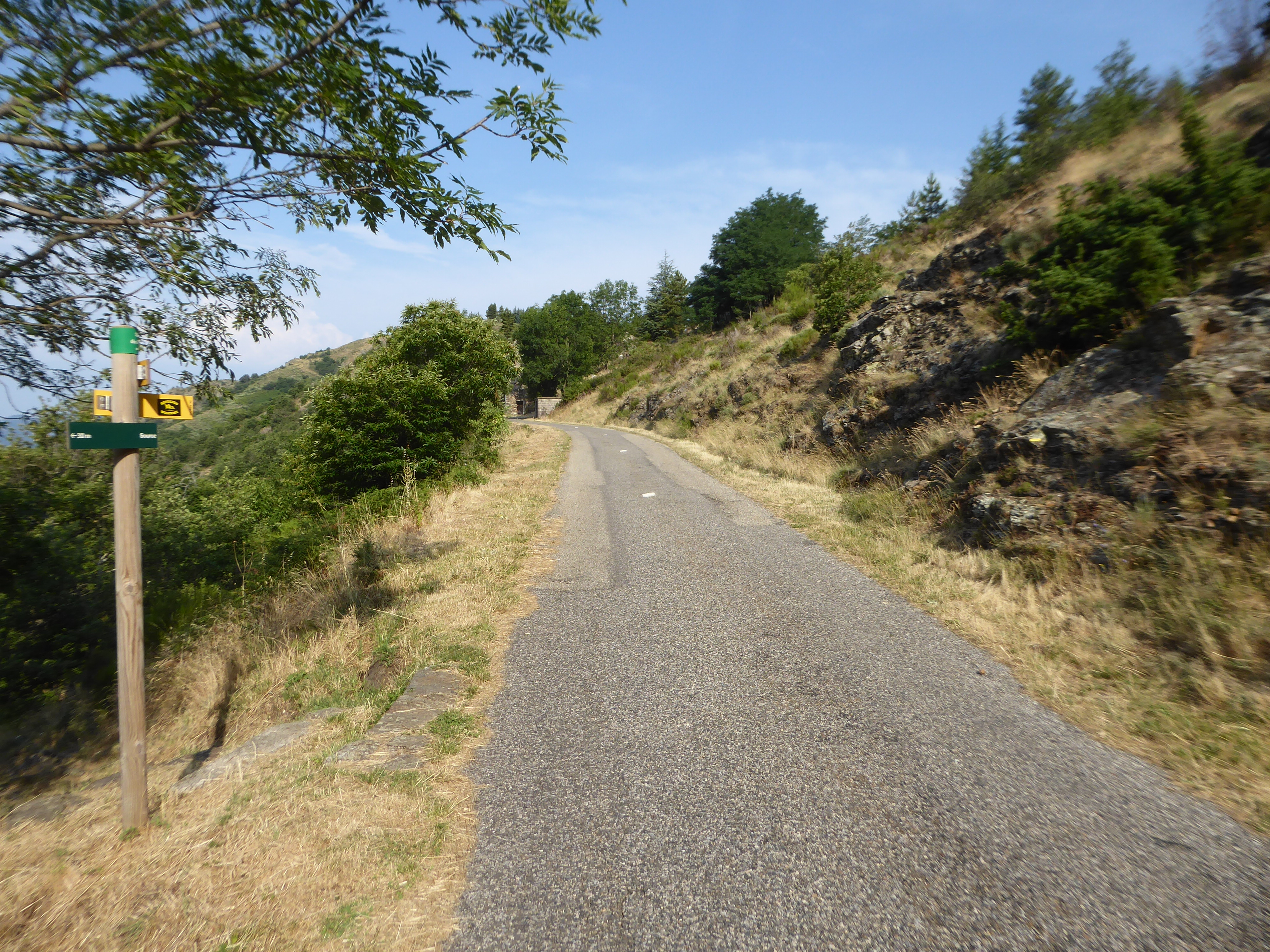 A ce croisement à l'entrée du hameau de Puech Sigal, suivre la route partant sur la droite direction Pont Moutonnier, balisé en rouge et blanc