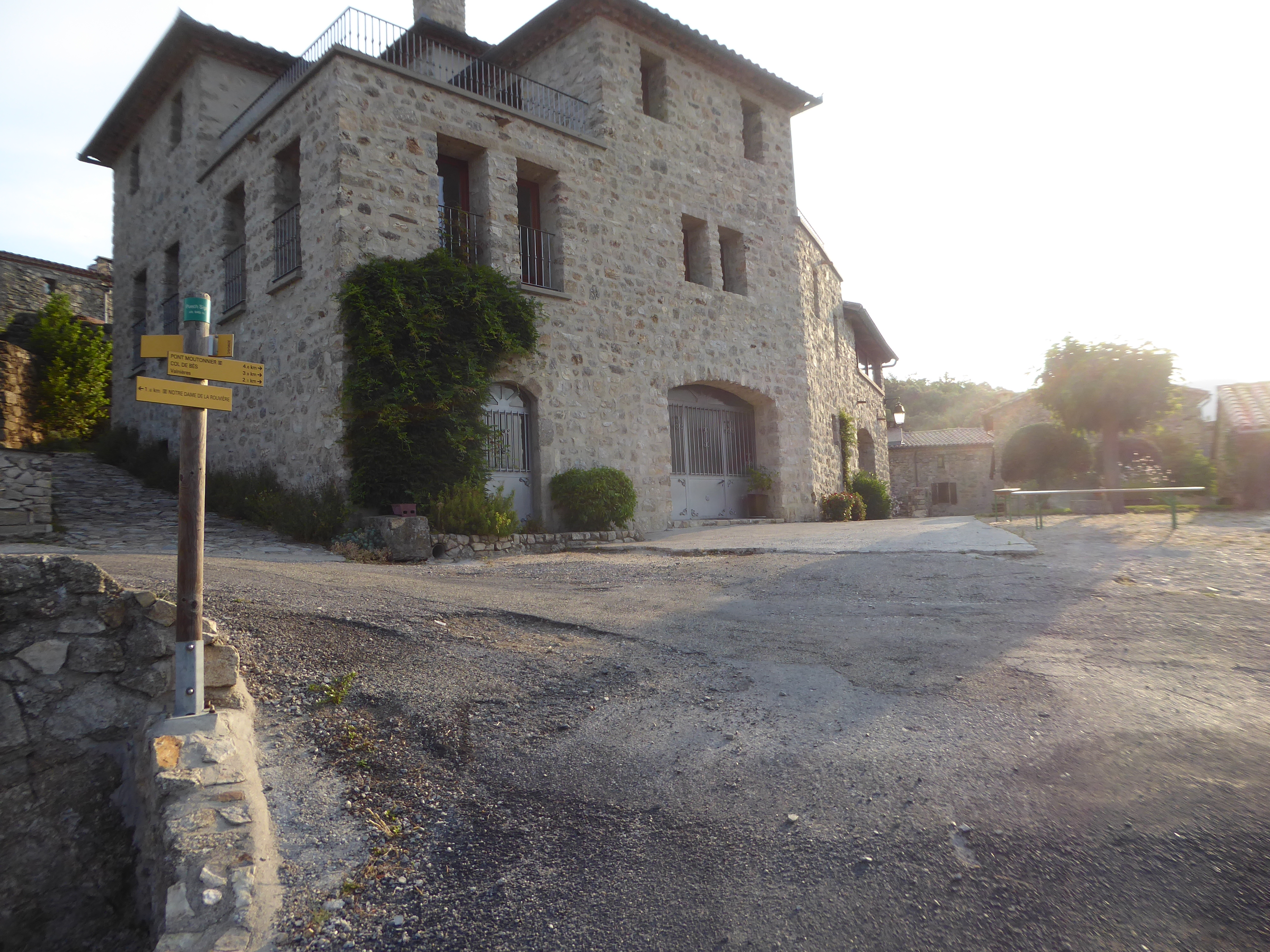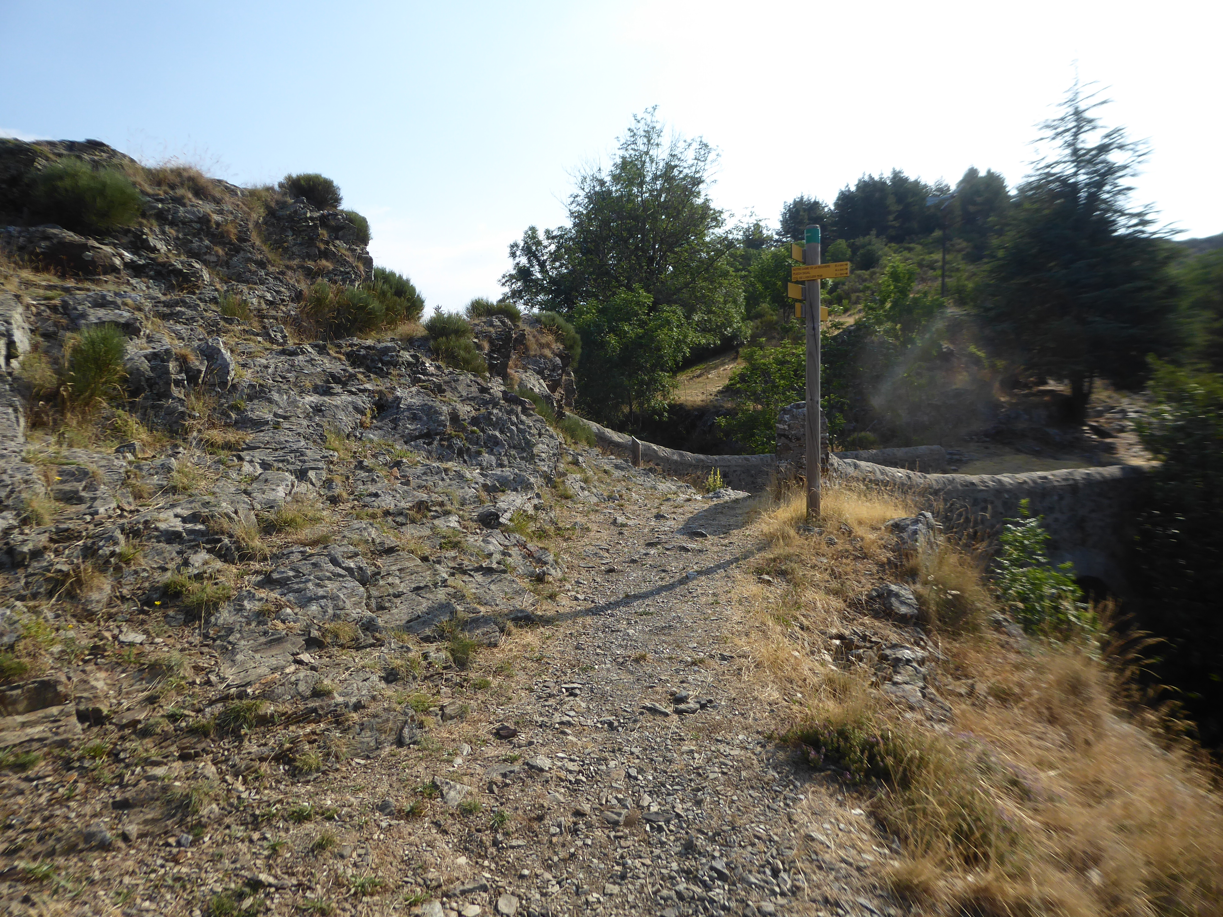 Mas Corbières (595 m) : suivre le chemin partant tout droit direction Pont Moutonnier, balisé en rouge et blanc