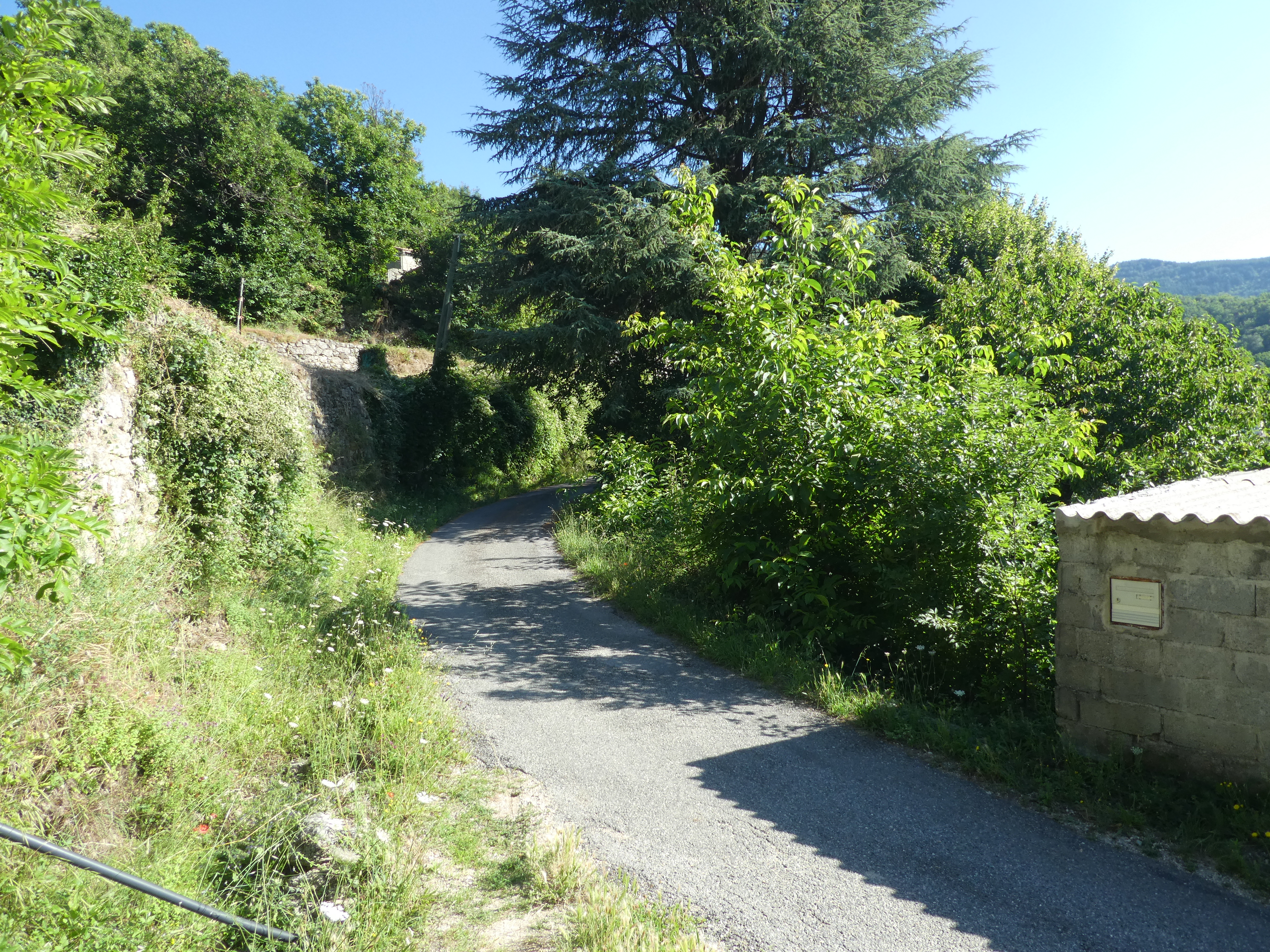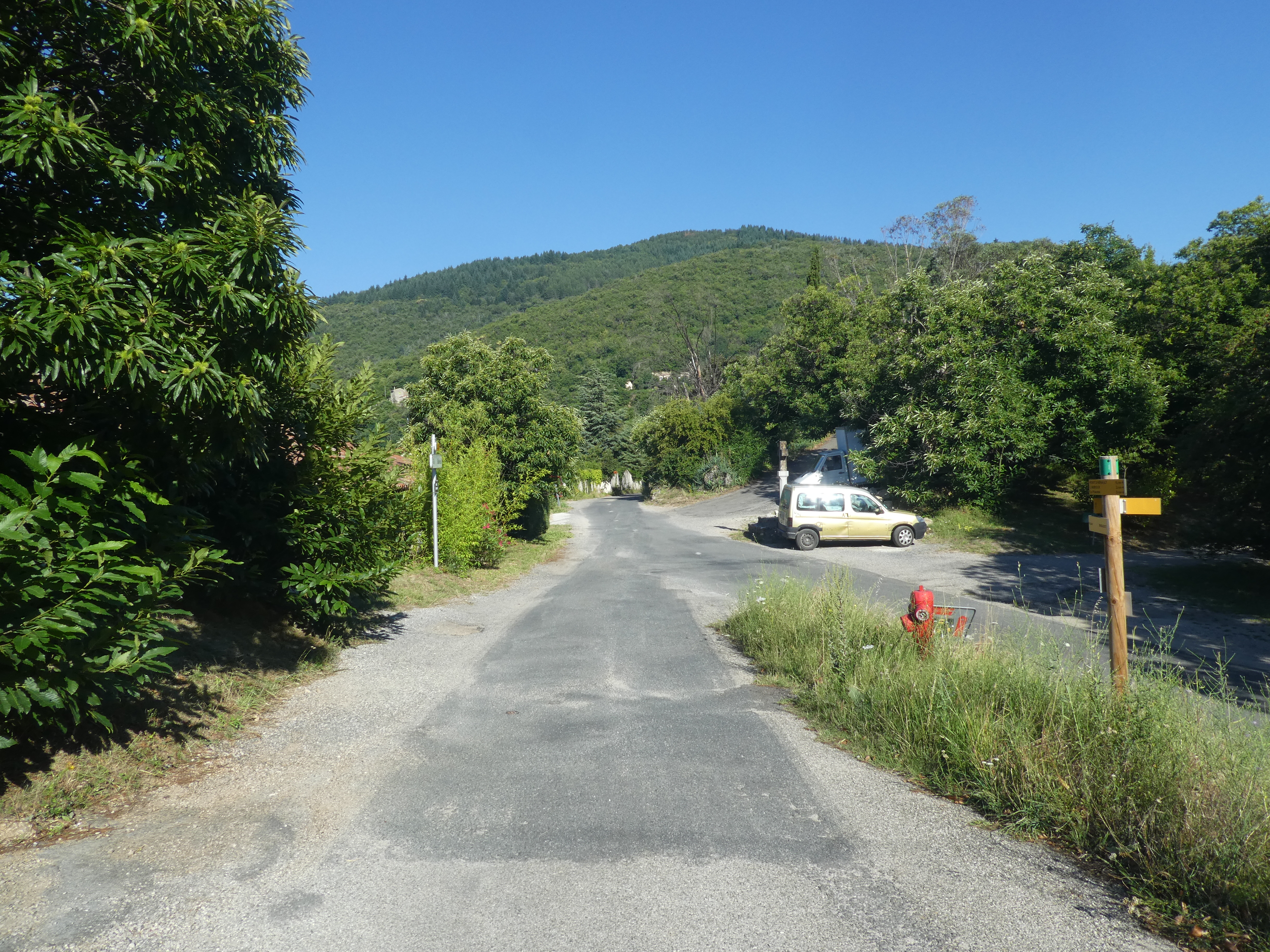 A ce croisement situé à l'entrée du hameau de Camias et marqué par la présence d'un panneau directionnel (700 mètres après le précédent), suivre la route partant sur la droite puis celle partant encore sur la droite 50 mètres après direction l'Arboux, balisé sporadiquement en jaune
