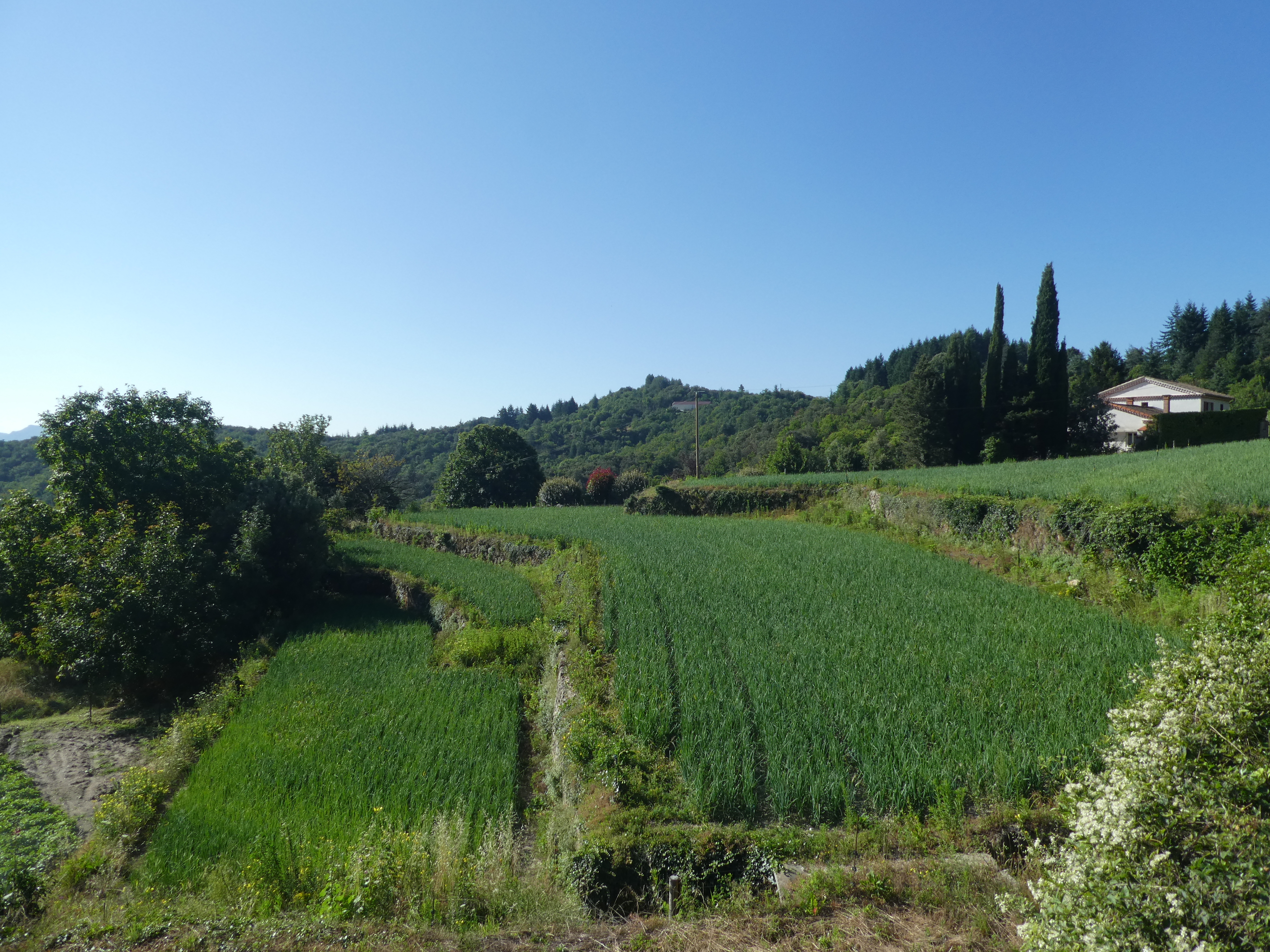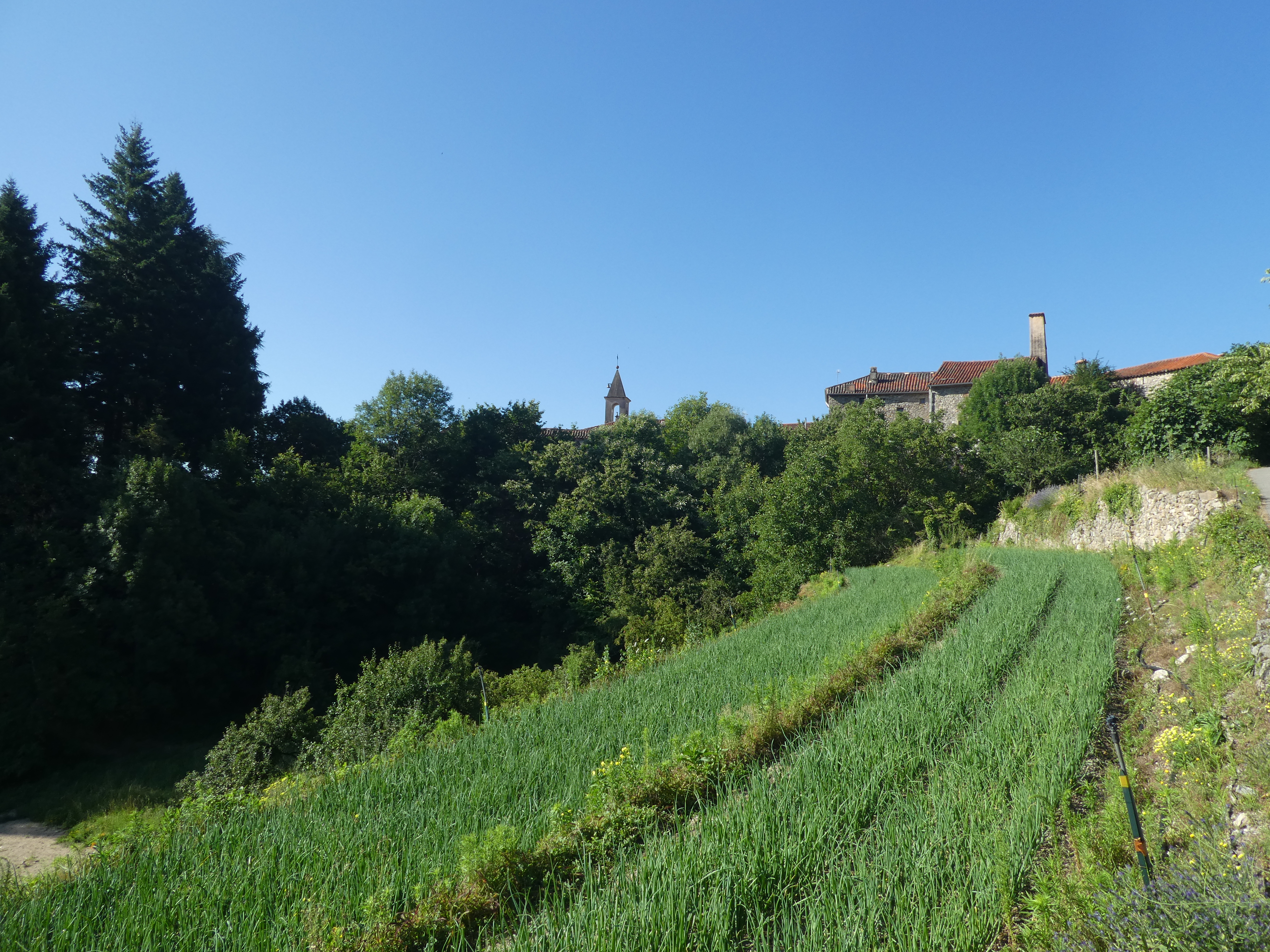 Vue sur le clocher de l'église de Mandagout depuis les terrasses de culture de l'oignon doux des Cévennes