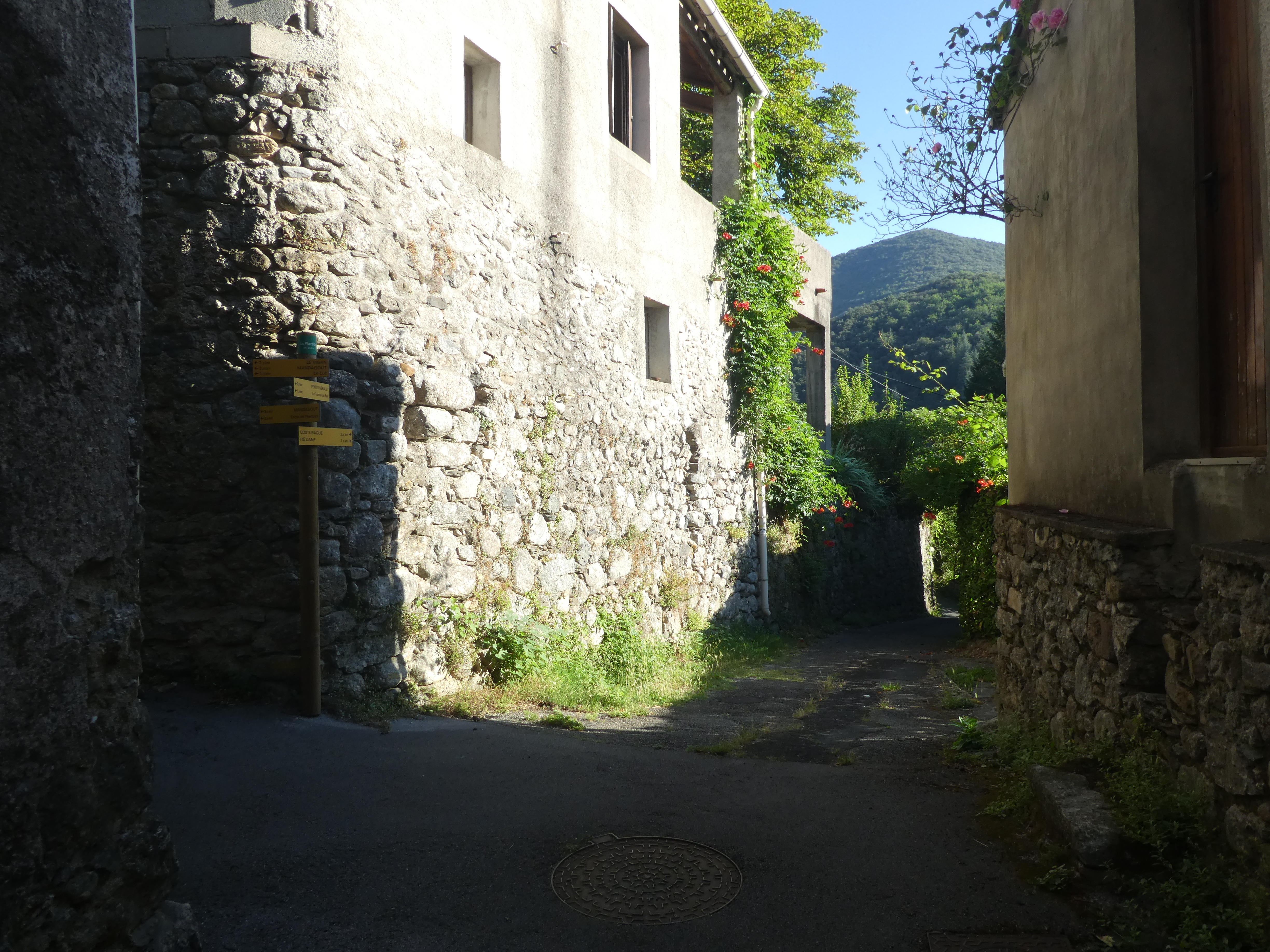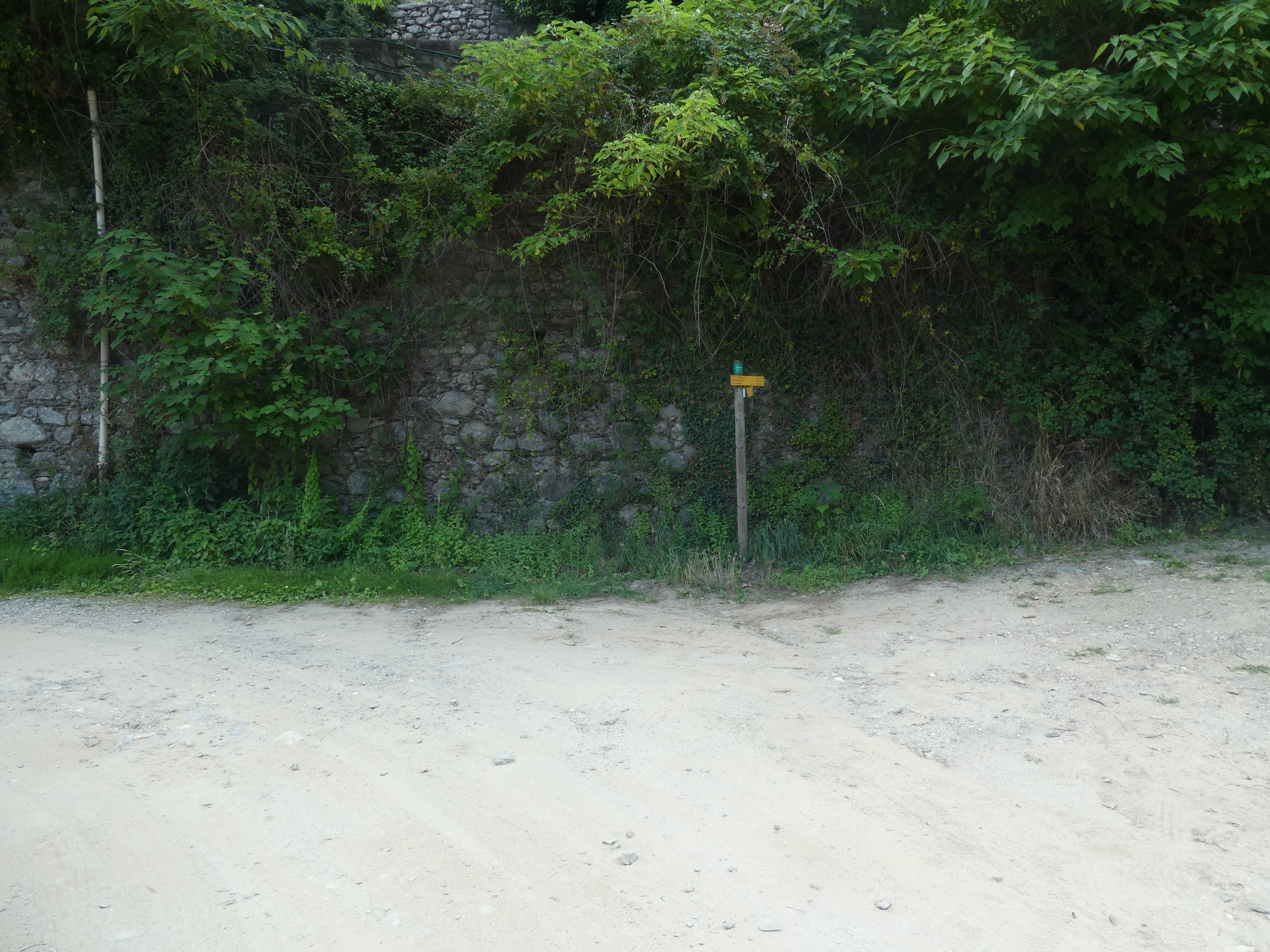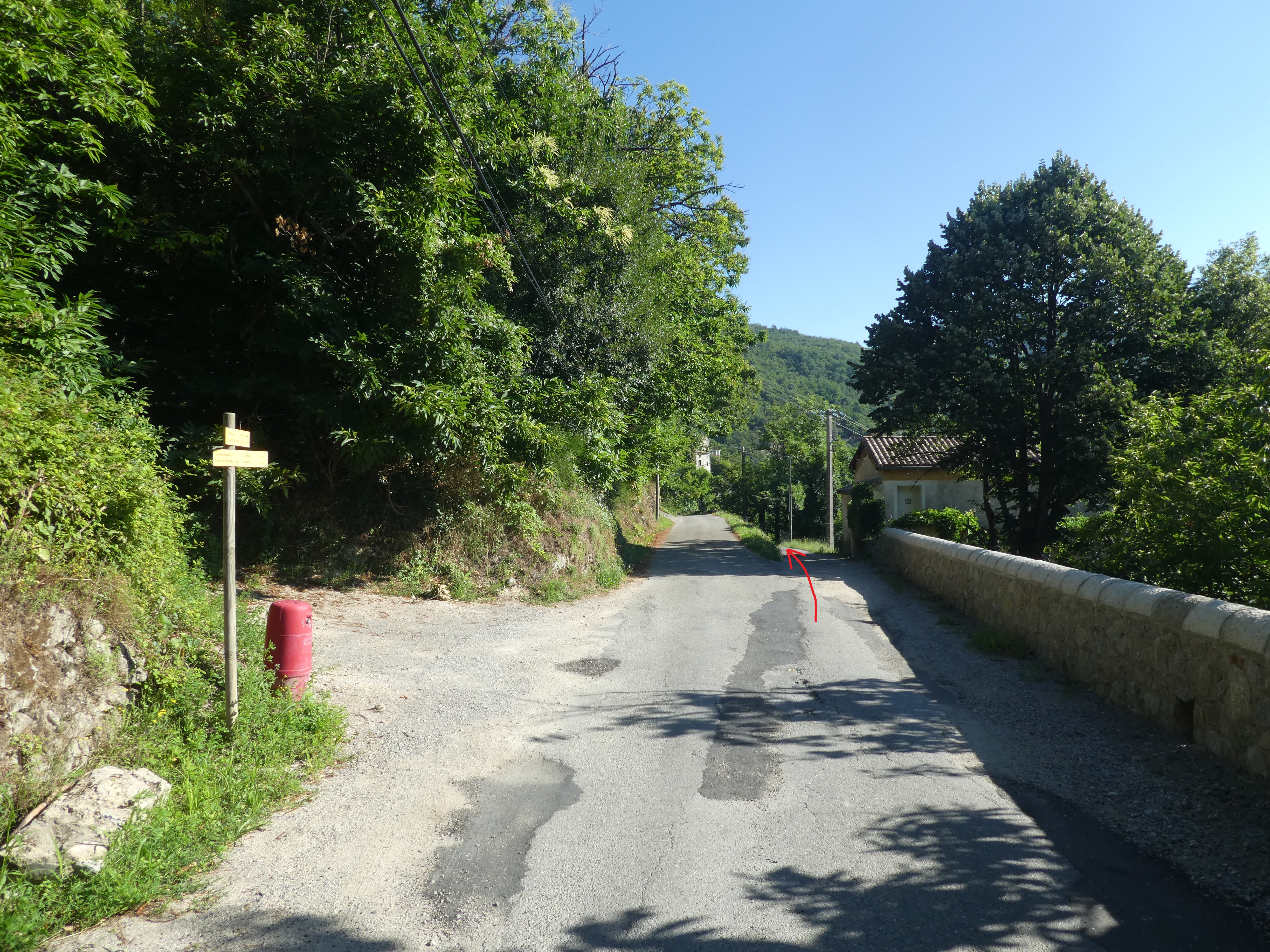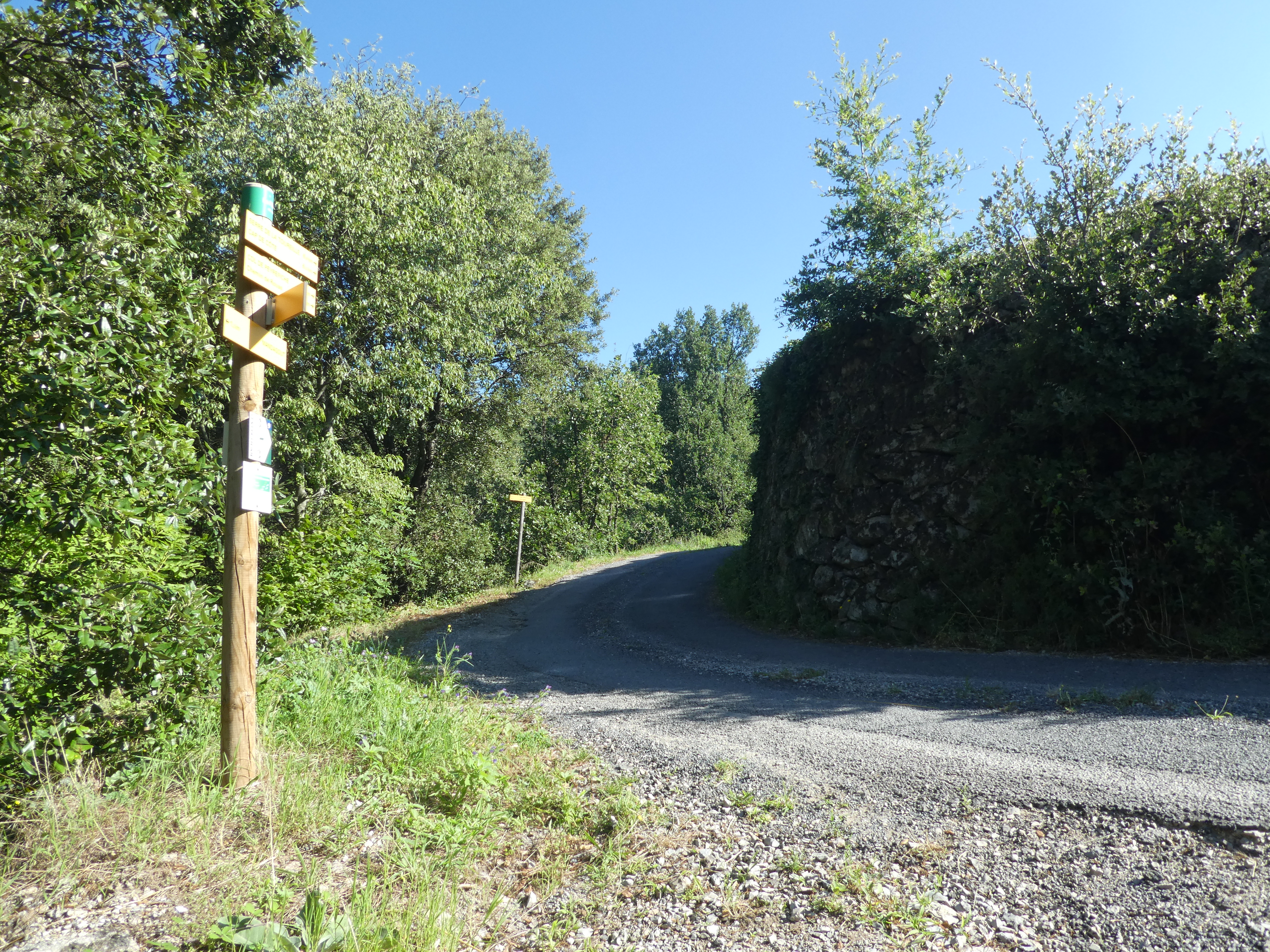 A cette intersection marquée par la présence d'un panneau directionnel (100 mètres après le précédent croisement), suivre la ruelle partant sur la gauche direction Col de Peyrefiche, balisé en jaune