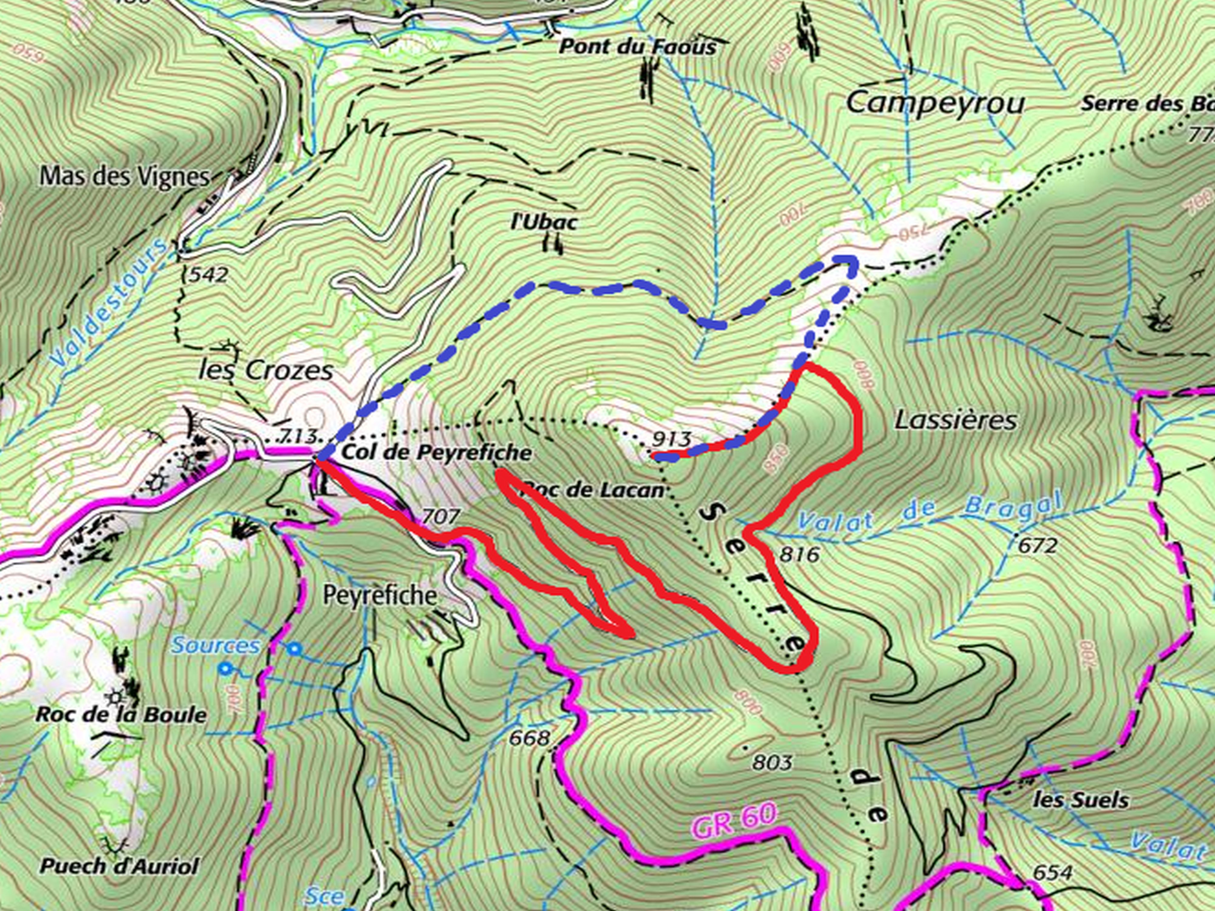 Voici le tracé approximatif de l'itinéraire à suivre jusqu'au sommet depuis le Col de Peyrefiche proposé par ce topo en rouge composé de larges pistes et chemins confortables ; le tracé en bleu est une variante qui a été utilisée à l'aller mais moins "roulante" et plus "herbeuse" sur la partie finale pour récupérer le large chemin de crête menant au Serre des Barthes (à vous de choisir)