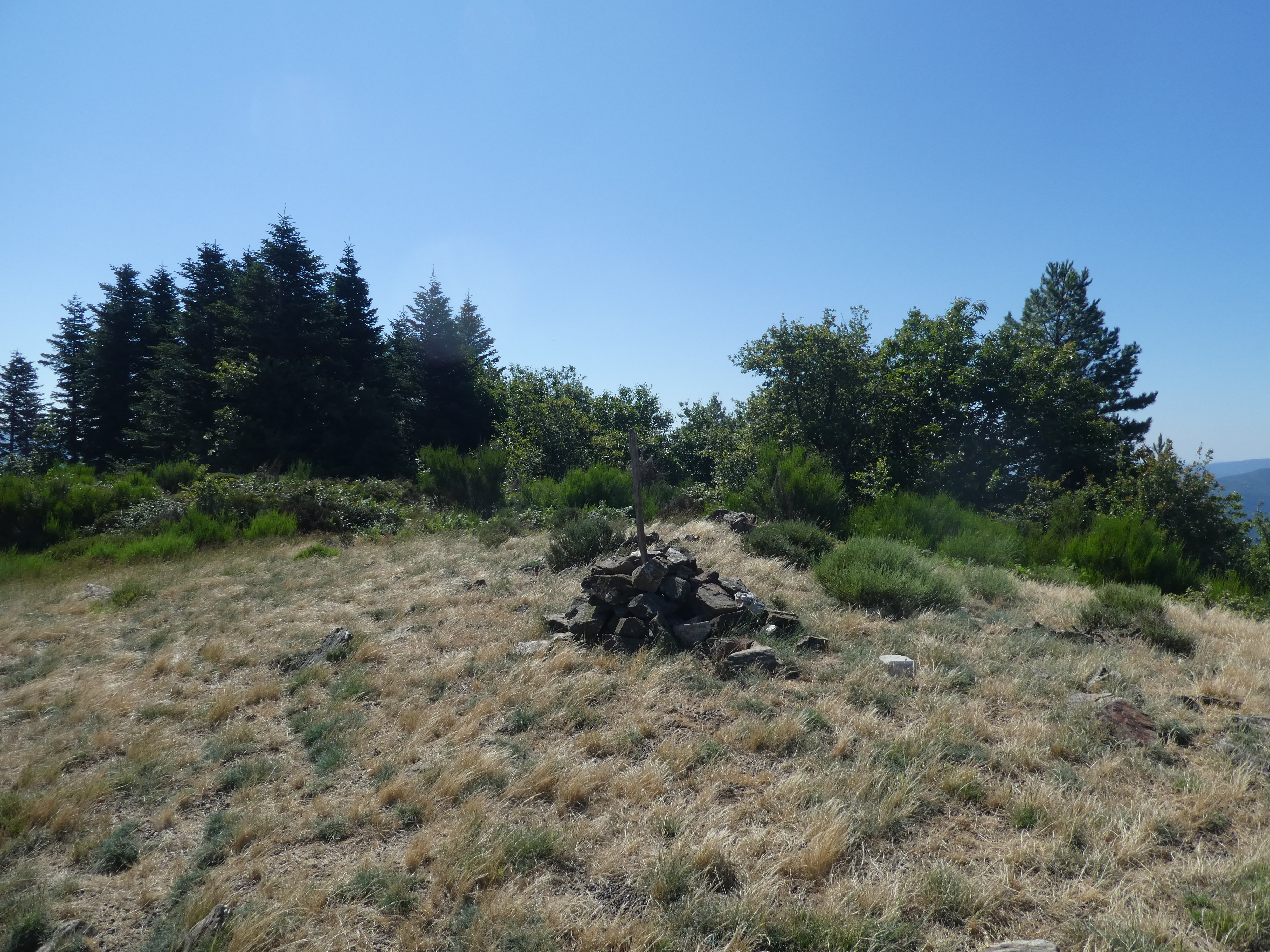 Arrivée au sommet du Serre de Rouas (913 m) : beau panorama sur l'Oiselette, la Montagne de la Séranne, le Pic d'Anjeau, les Rochers de la Tude, le Mont Saint-Baudille, le Causse de Blandas, le Serre de Navès, la Montagne du Lingas, le Serre de la Toureille, le Pic de Barette, l'Aigoual, les sommets de la Vallée de l'Hérault et de la Vallée Borgne, et le Mont Lozère