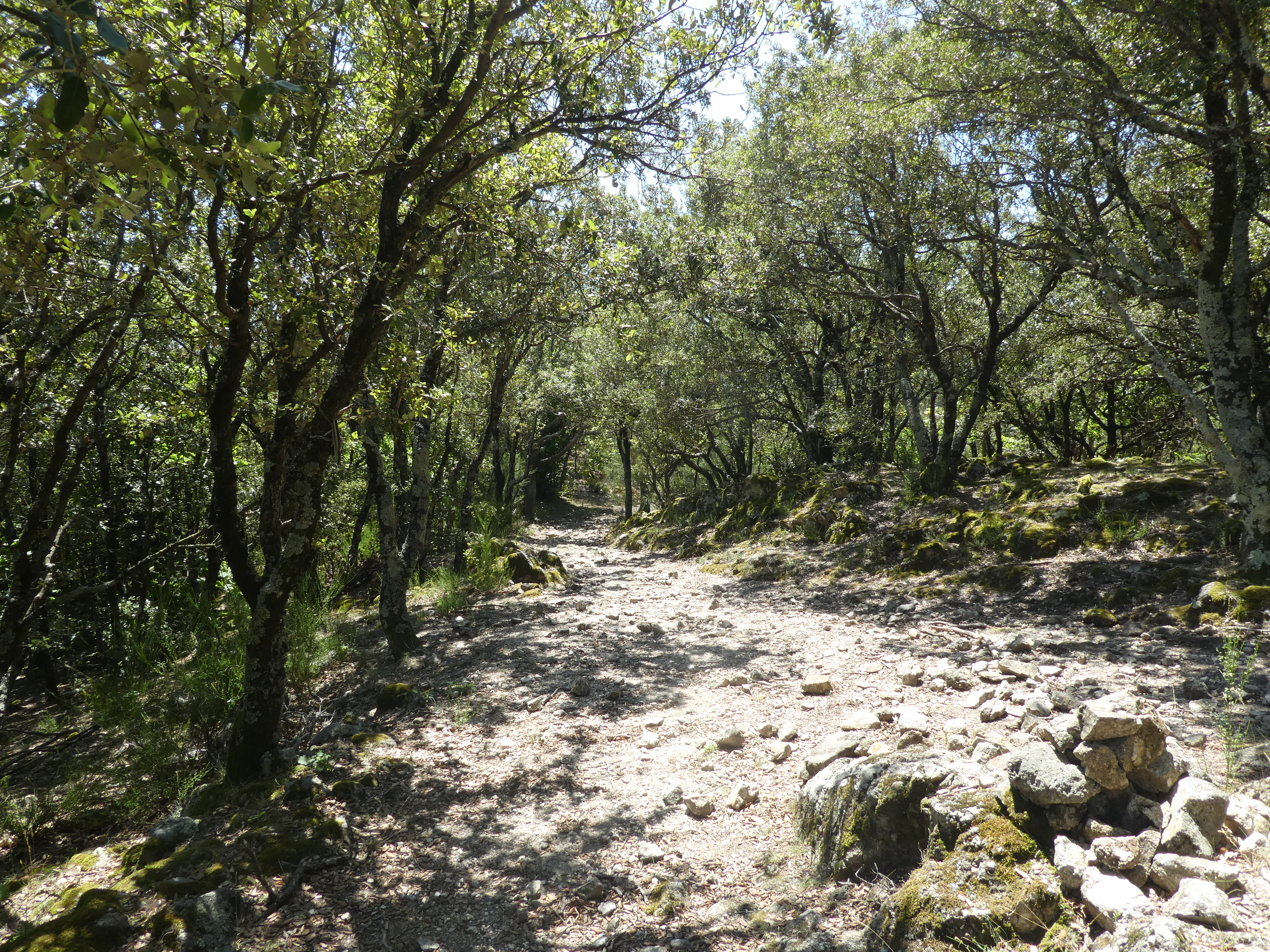 A ce croisement après que le chemin ait fait un virage sur la droite (100 mètres après le précédent), suivre le chemin descendant sur la gauche qui va être mieux tracé et mieux balisé quelques mètres plus loin direction Camias, balisé sporadiquement en jaune