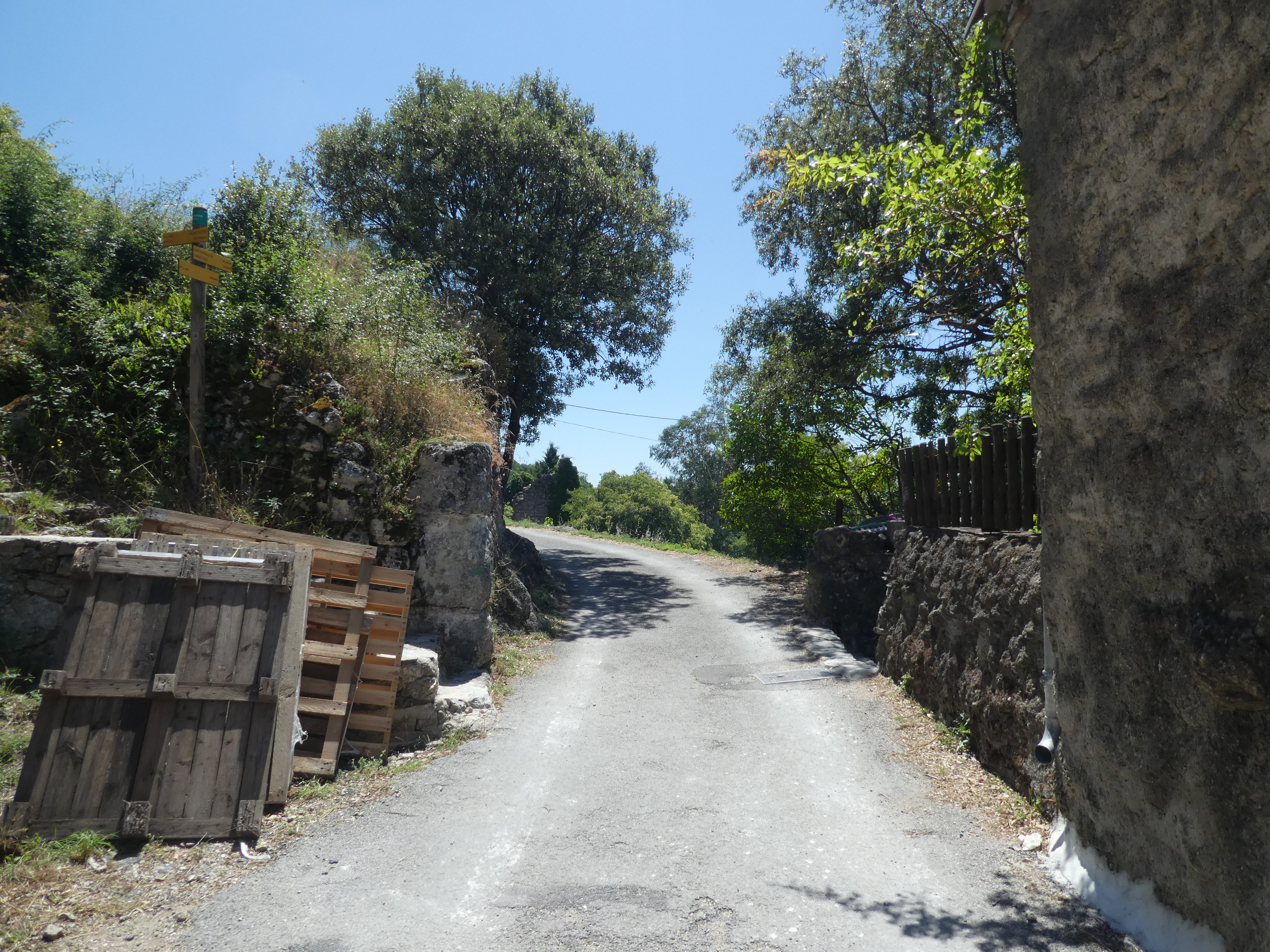 A ce croisement après que la route ait fait deux lacets (150 mètres après la précédente intersection), suivre le chemin descendant sur la droite direction Camias, balisé sporadiquement en jaune (suivre le chemin le mieux tracé)