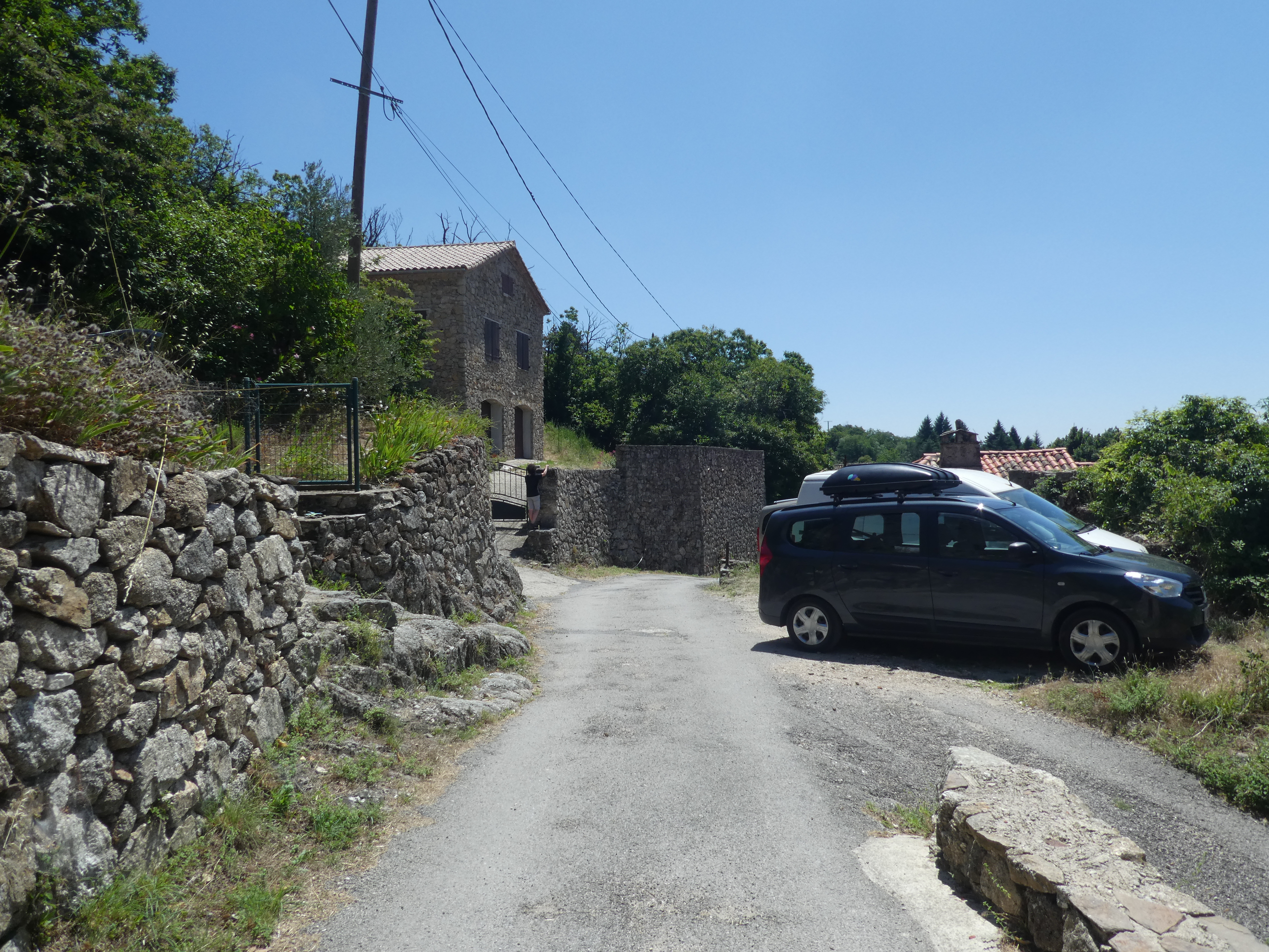 La Rouviérette (545 m) : suivre la route partant tout droit direction Pont d'Hérault, balisé en jaune et rouge, et en jaune dorénavant