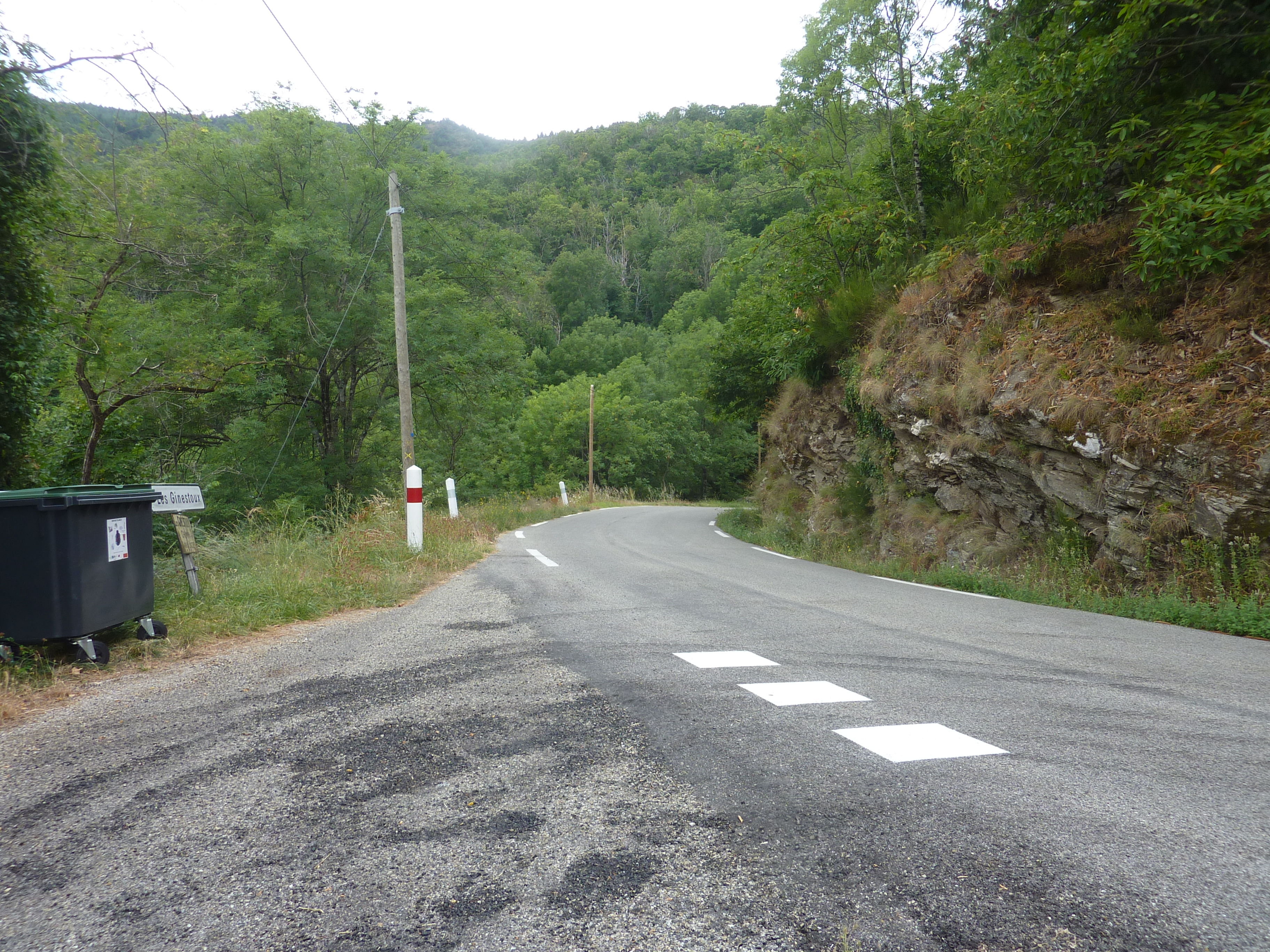 A ce croisement au niveau du hameau des Ginestoux (1000 mètres après le lieu-dit "le Pont Marès"), suivre la route partant tout droit direction Col Salidès, balisé en jaune