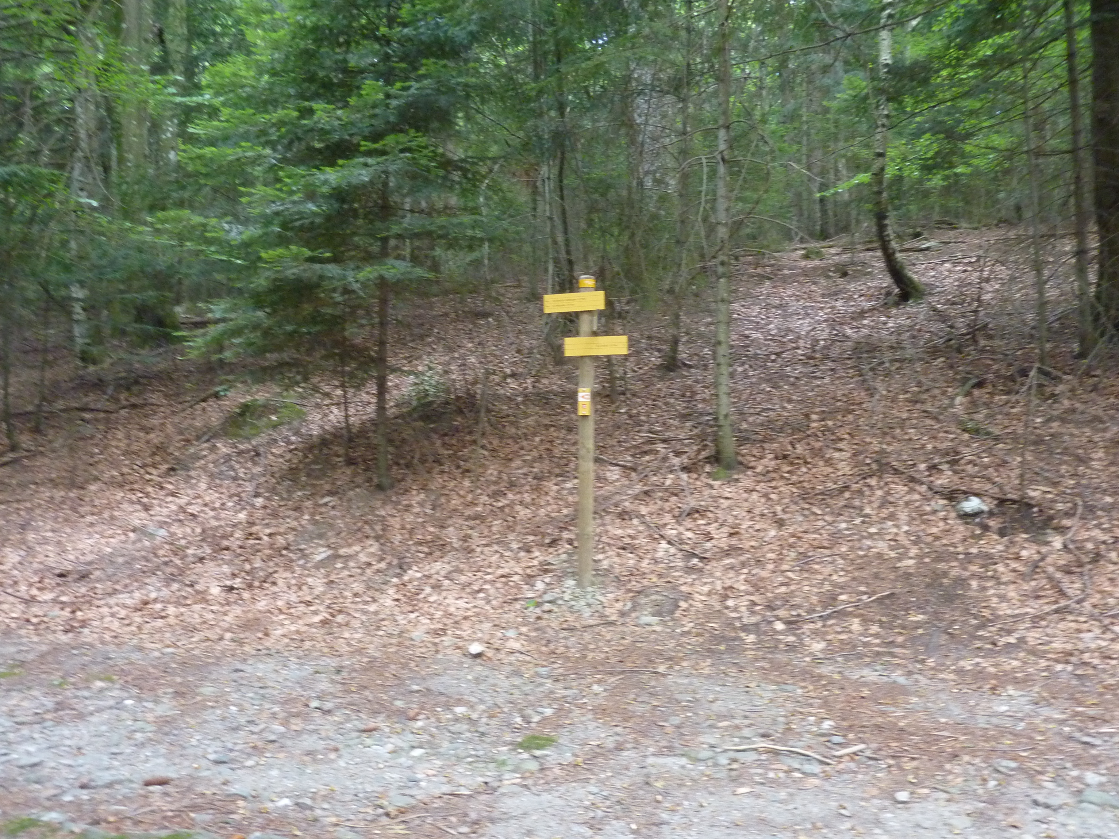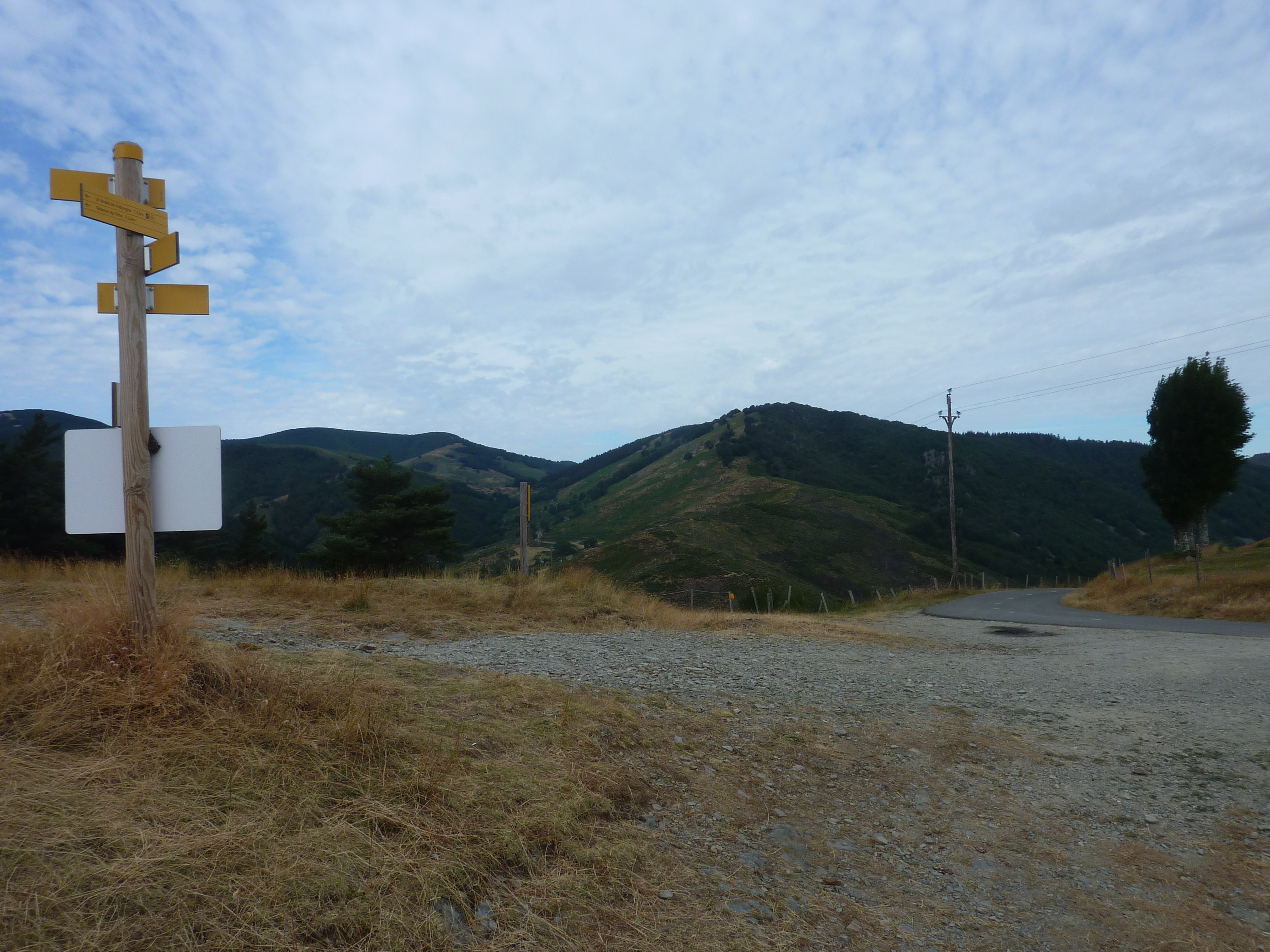 Col Salidès (1014 m) : suivre le large chemin partant sur la gauche direction Mont Aigoual, balisé en rouge et blanc, et en jaune dorénavant