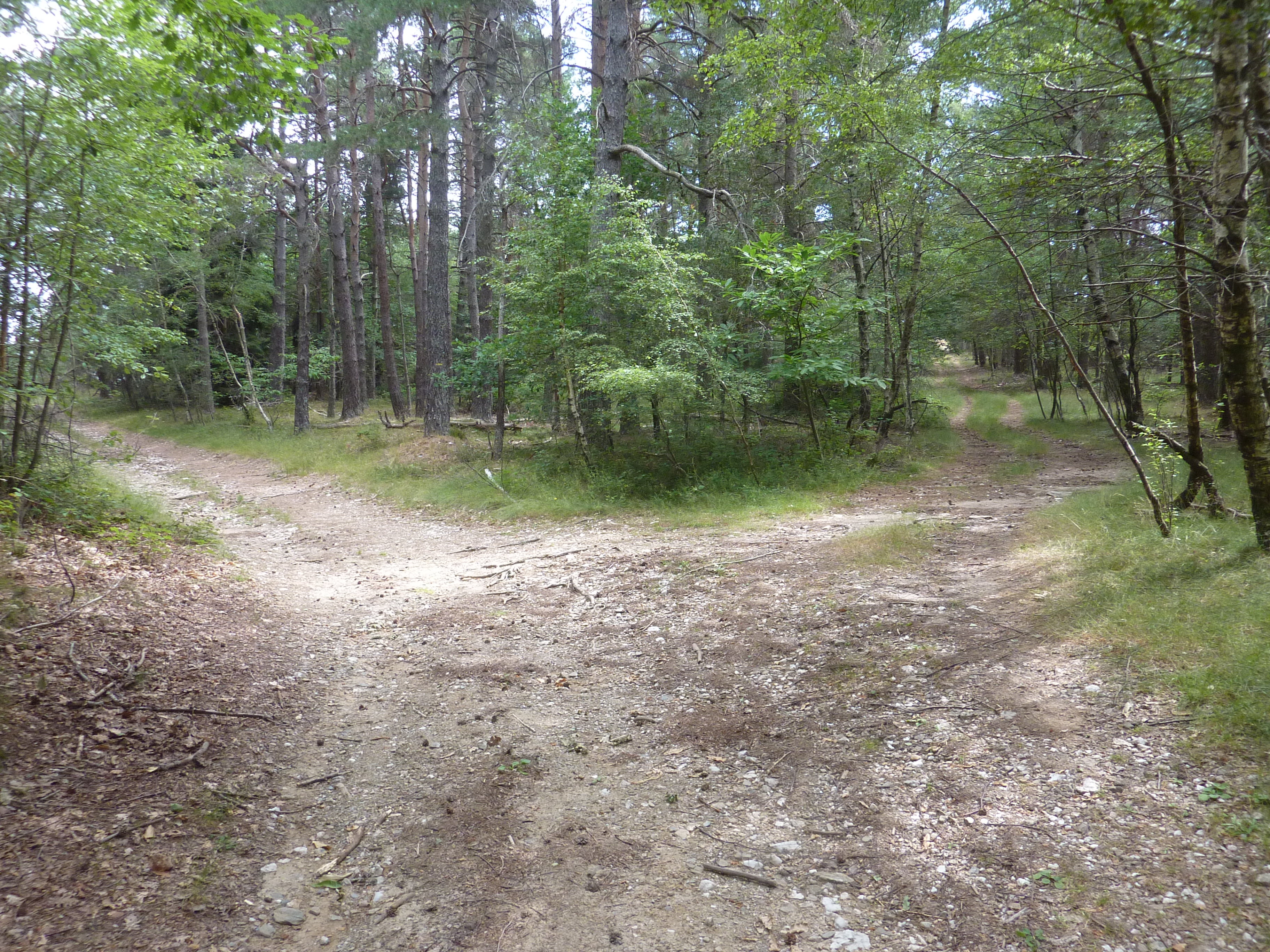 A ce croisement avec le chemin de l'aller (100 mètres après avoir quitté le sommet du Serre des Bruges), suivre ce dernier sur la droite direction Saint-André-de-Valborgne, balisé en jaune dorénavant (pour rappel, le chemin mentionné en pointillés roses sur la carte IGN ramenant à Saint-André-de-Valborgne par le lieu-dit "Roque Renard" ne semble plus exister)