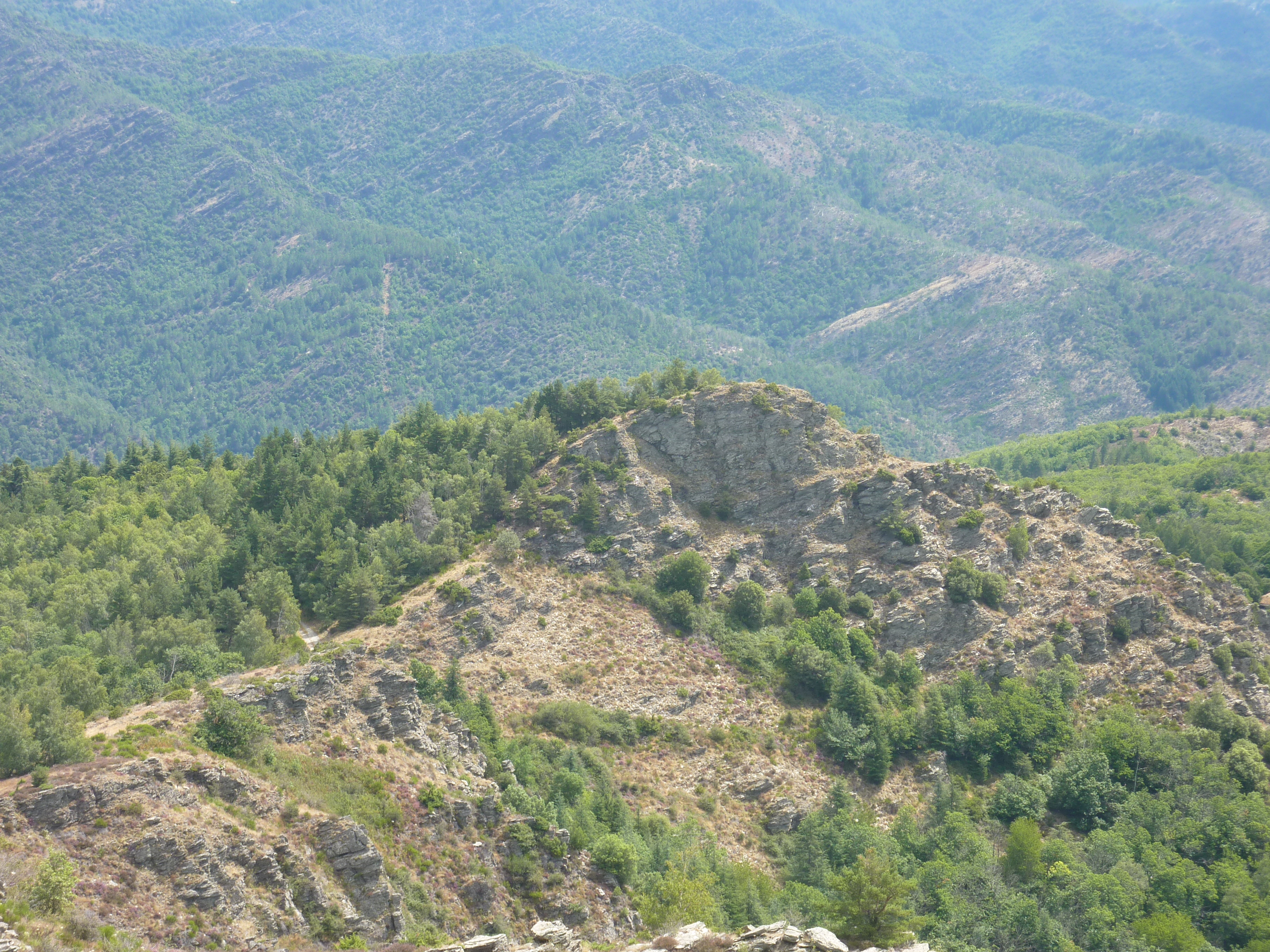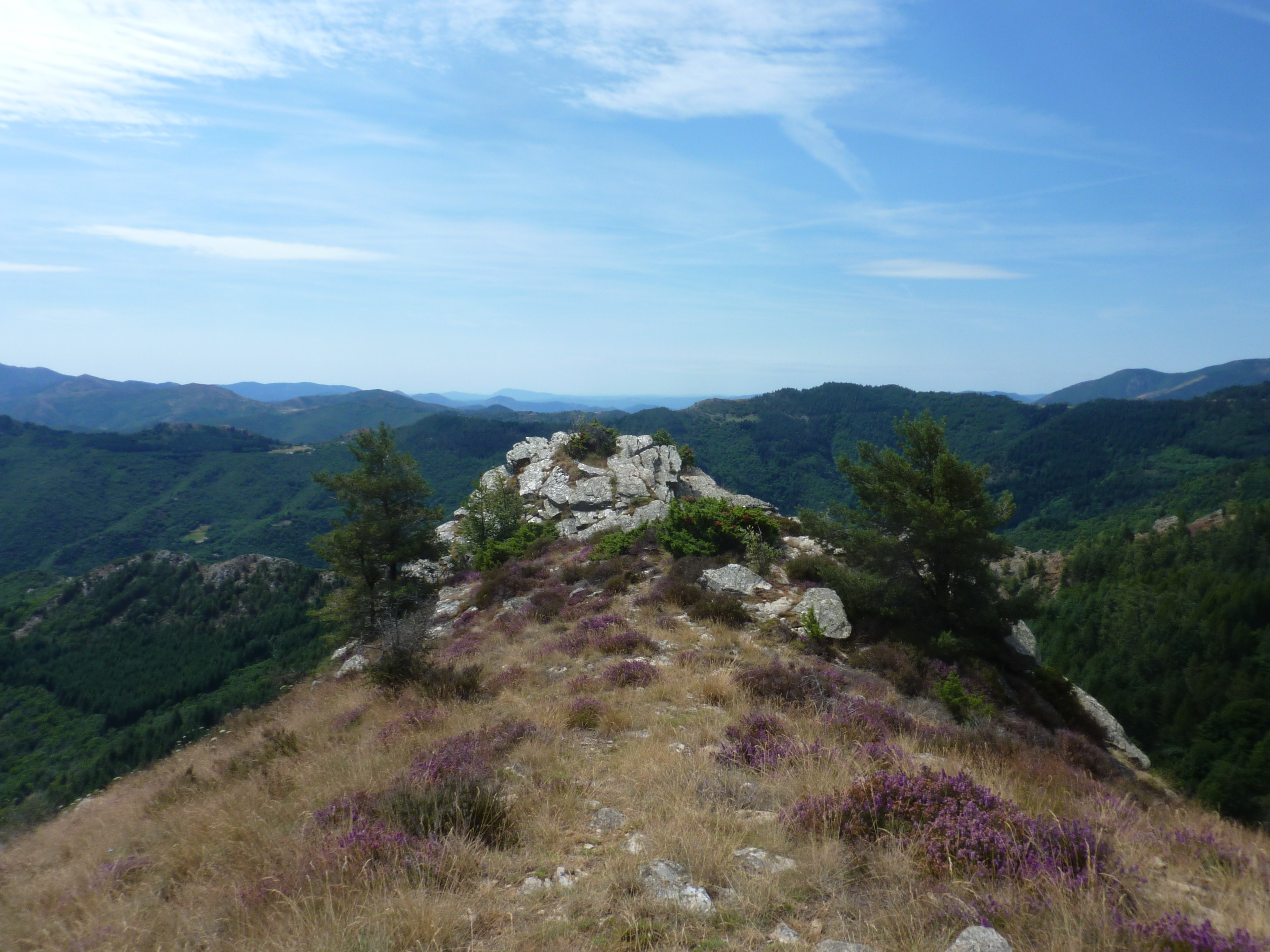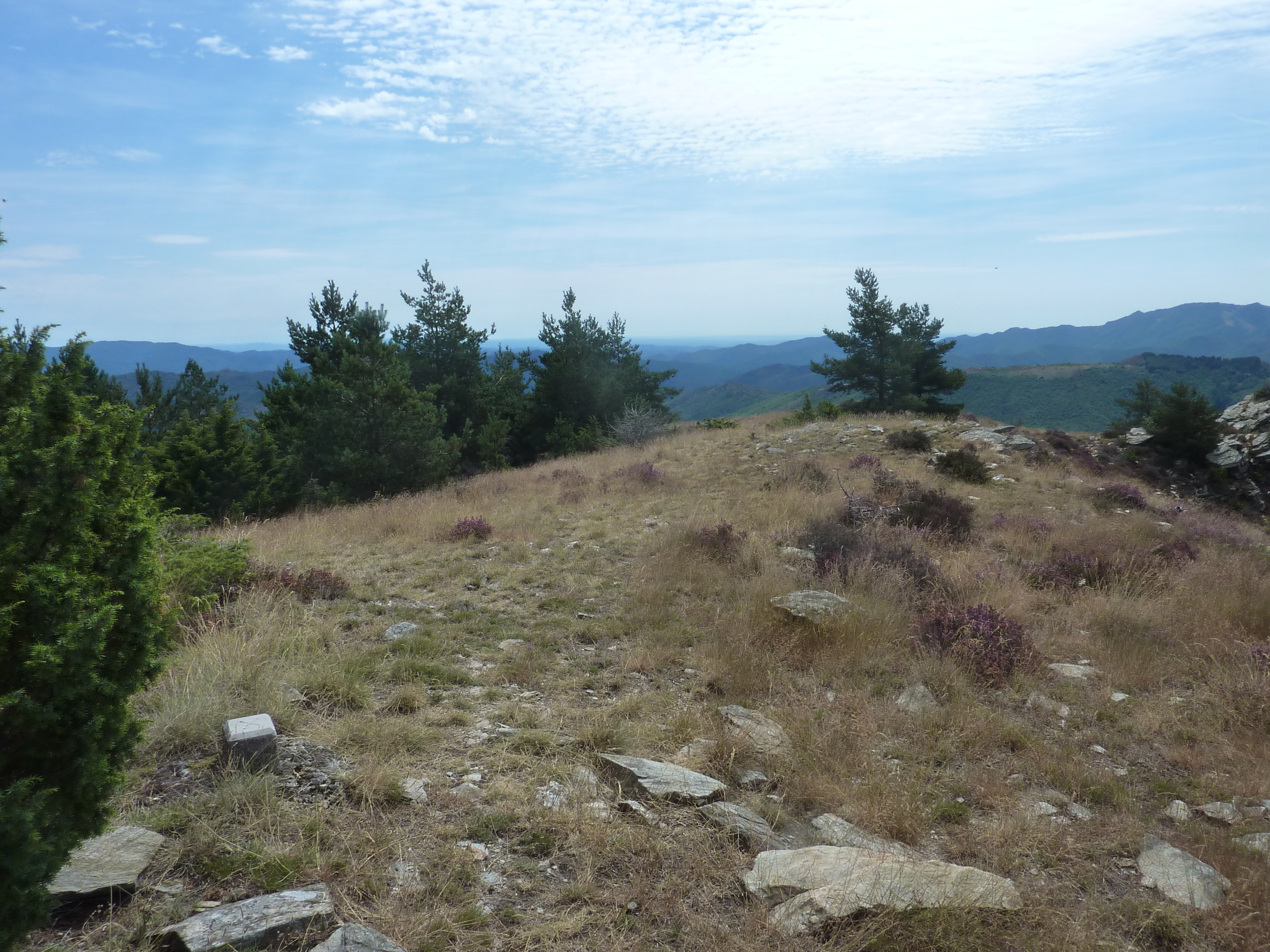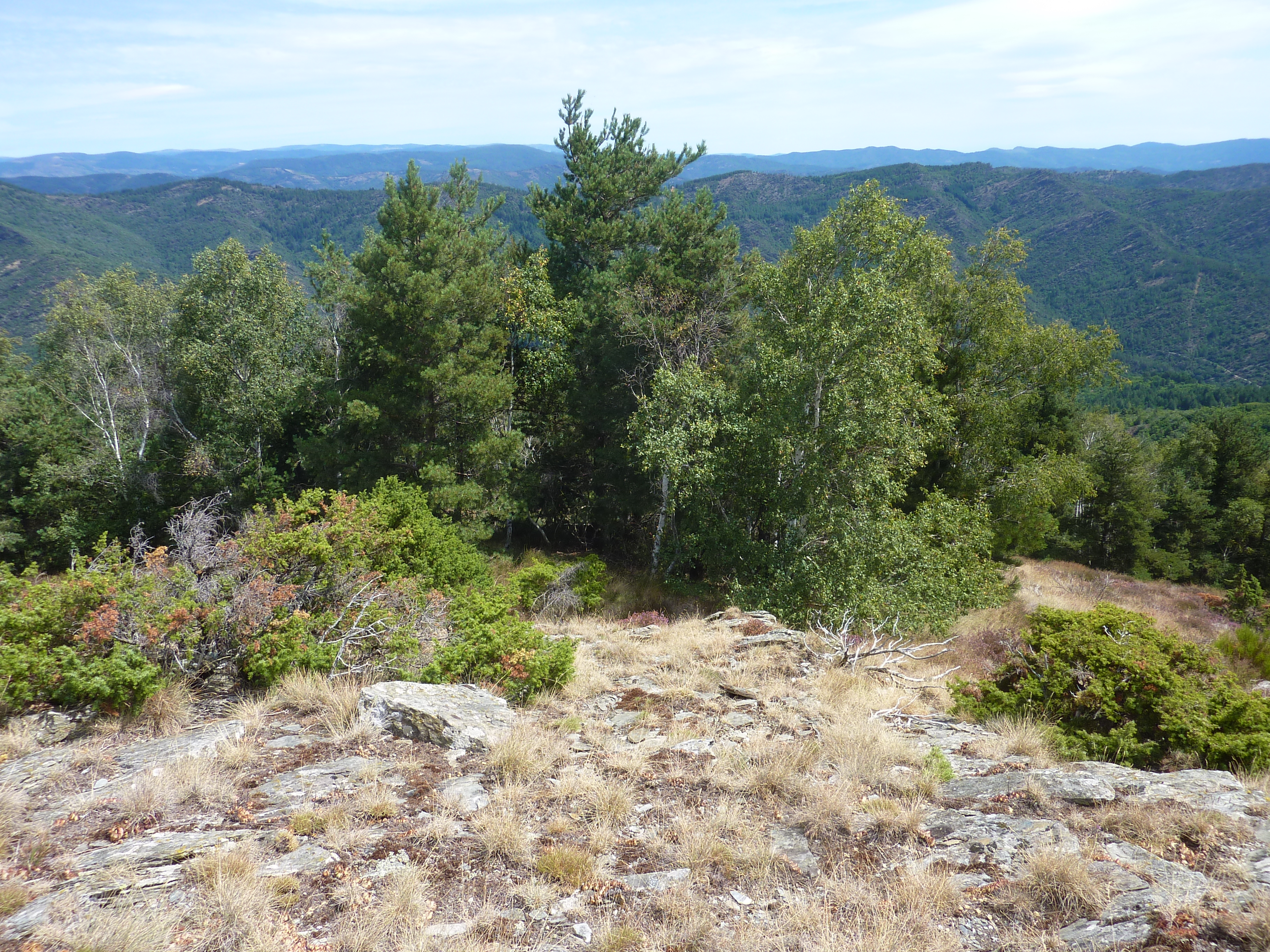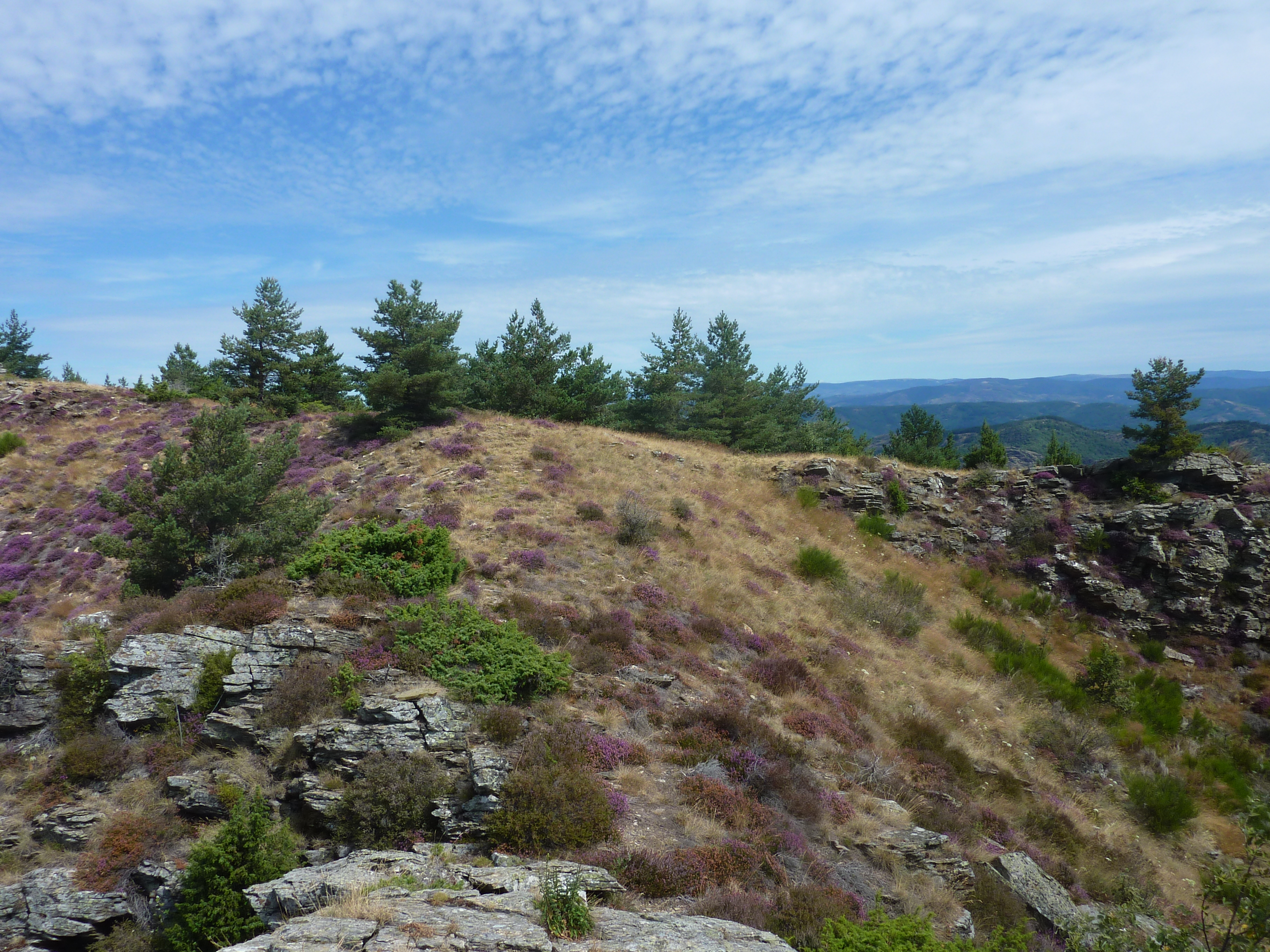 Arrivée au sommet du Serre des Bruges (990 m) : panorama similaire à celui du Serre du Tarnon avec une vue plus étendue sur le Causse Méjan et le Mont Lozère mais plus restreint sur l'Aigoual