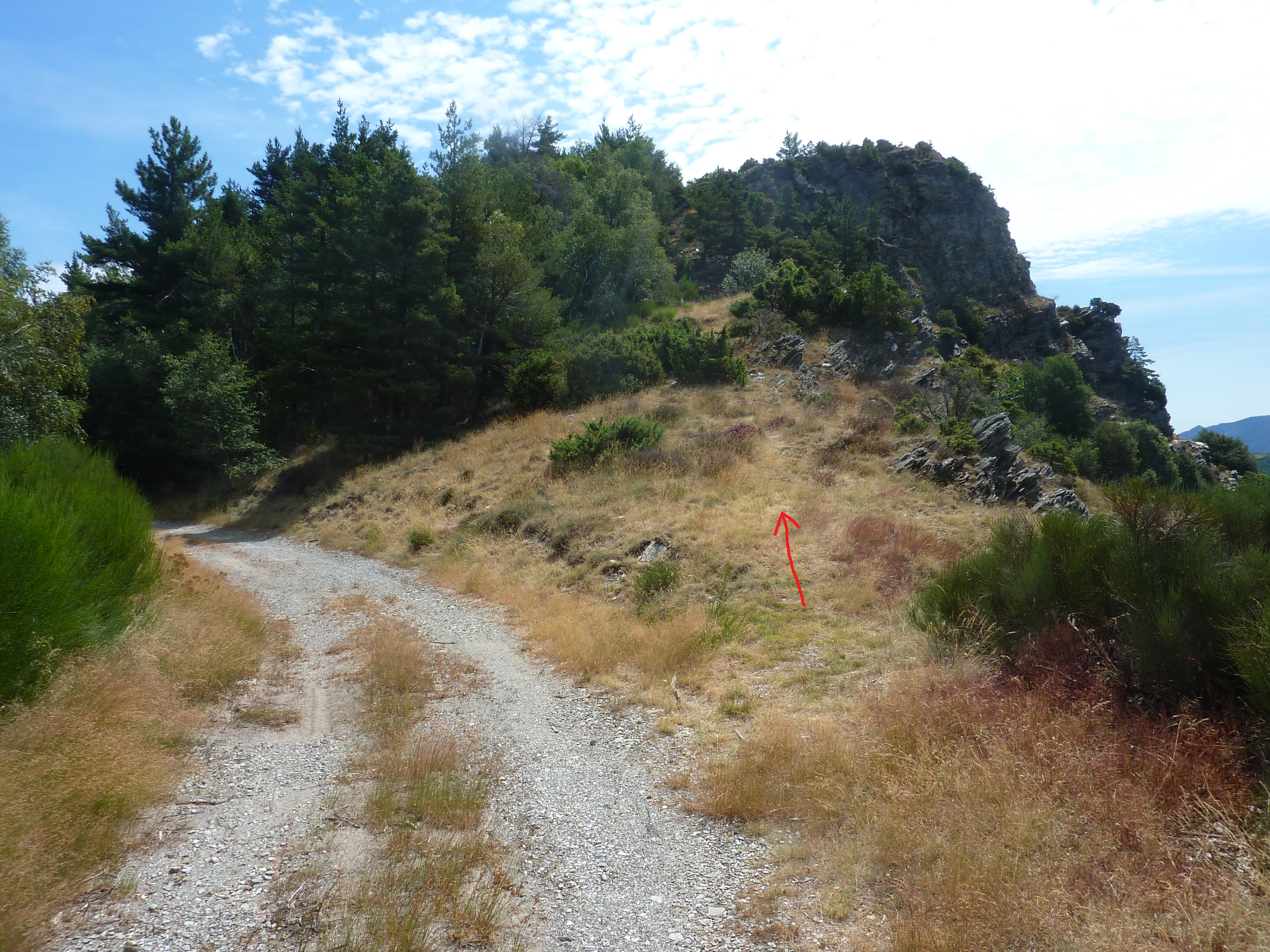 A ce croisement situé au pied du Serre des Bruges (400 mètres après le lieu-dit "Serre des Bruges"), monter à vue et hors sentier sur la droite direction Serre des Bruges, aucun balisage dorénavant (pour ceux qui ne voudraient pas accéder à ce sommet, continuer à suivre la piste descendant légèrement sur la gauche direction Saint-André-de-Valborgne)