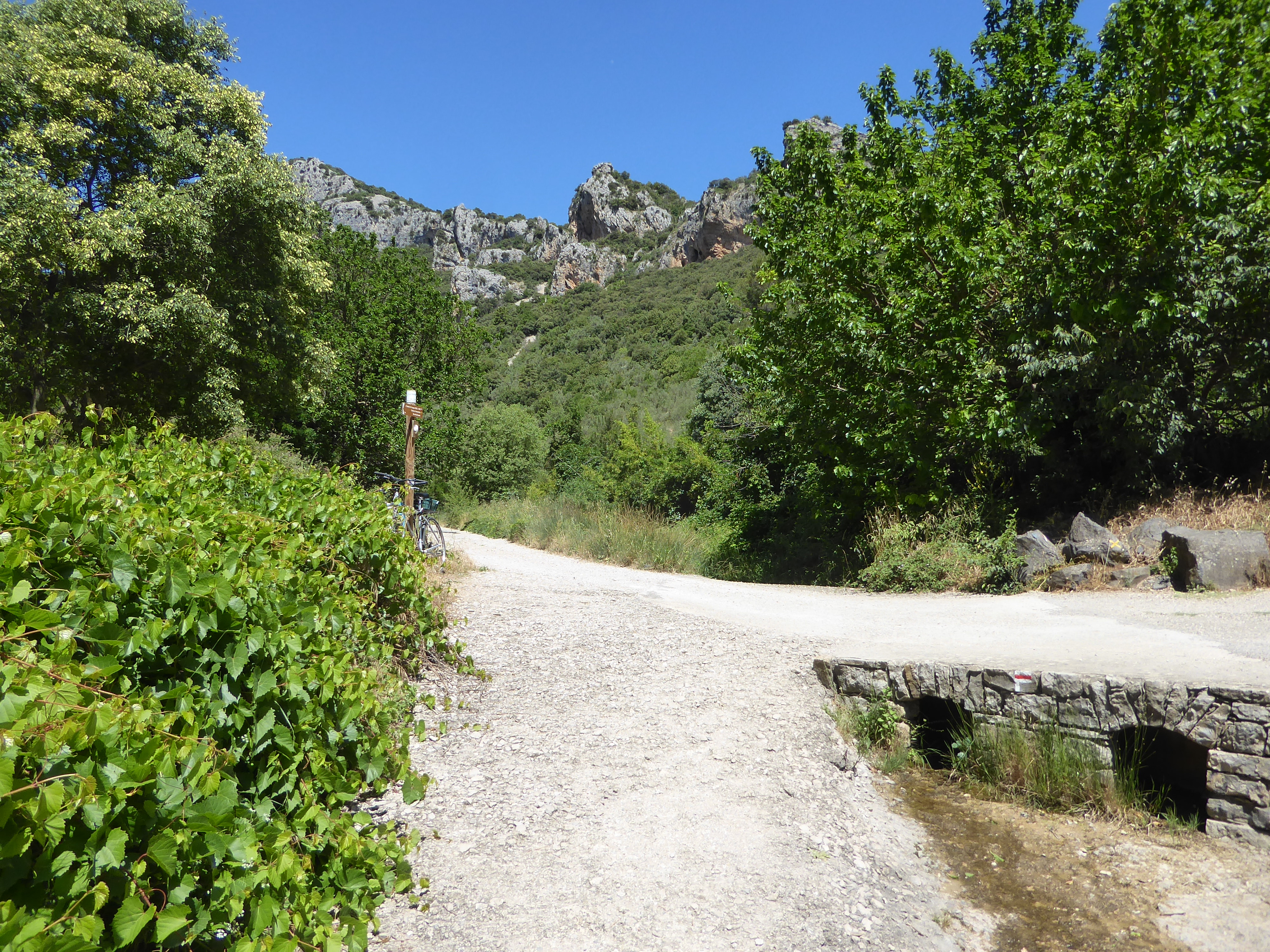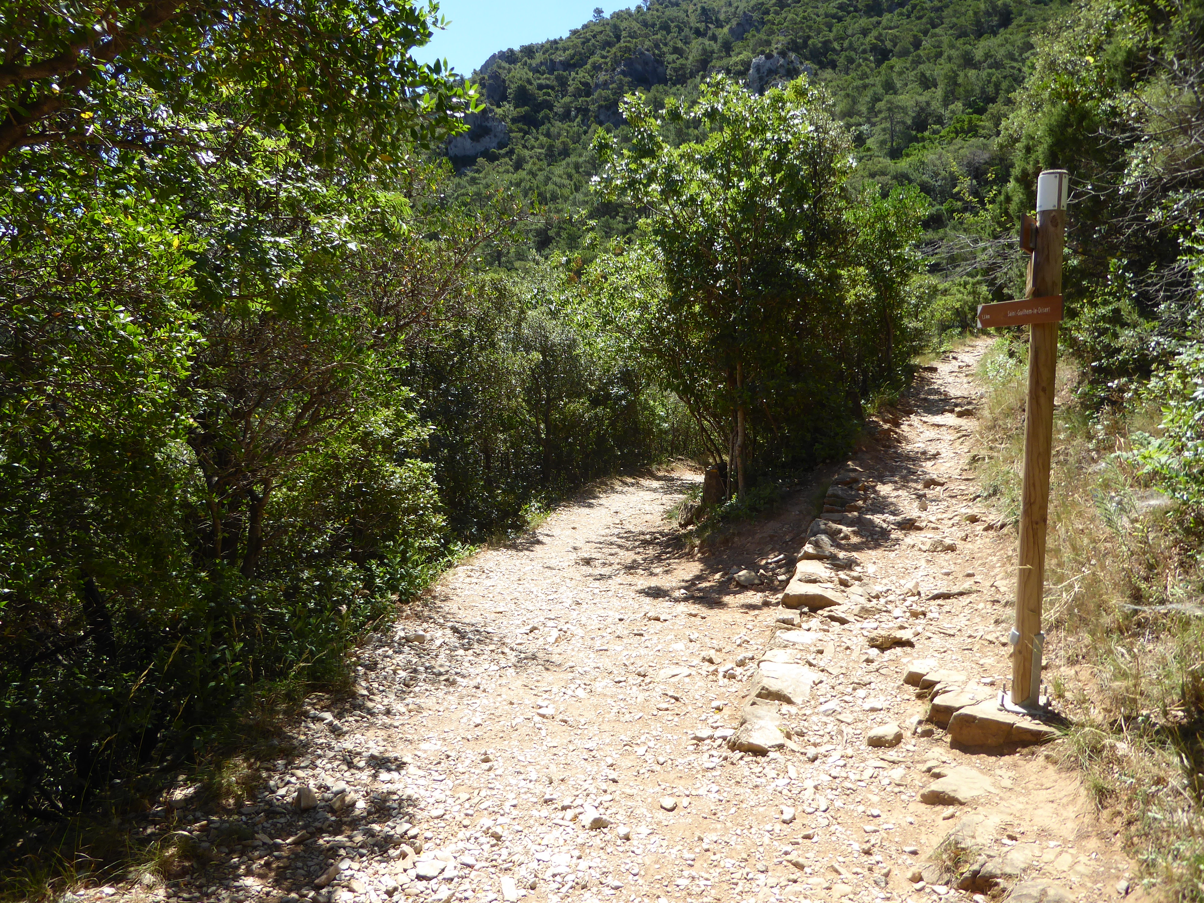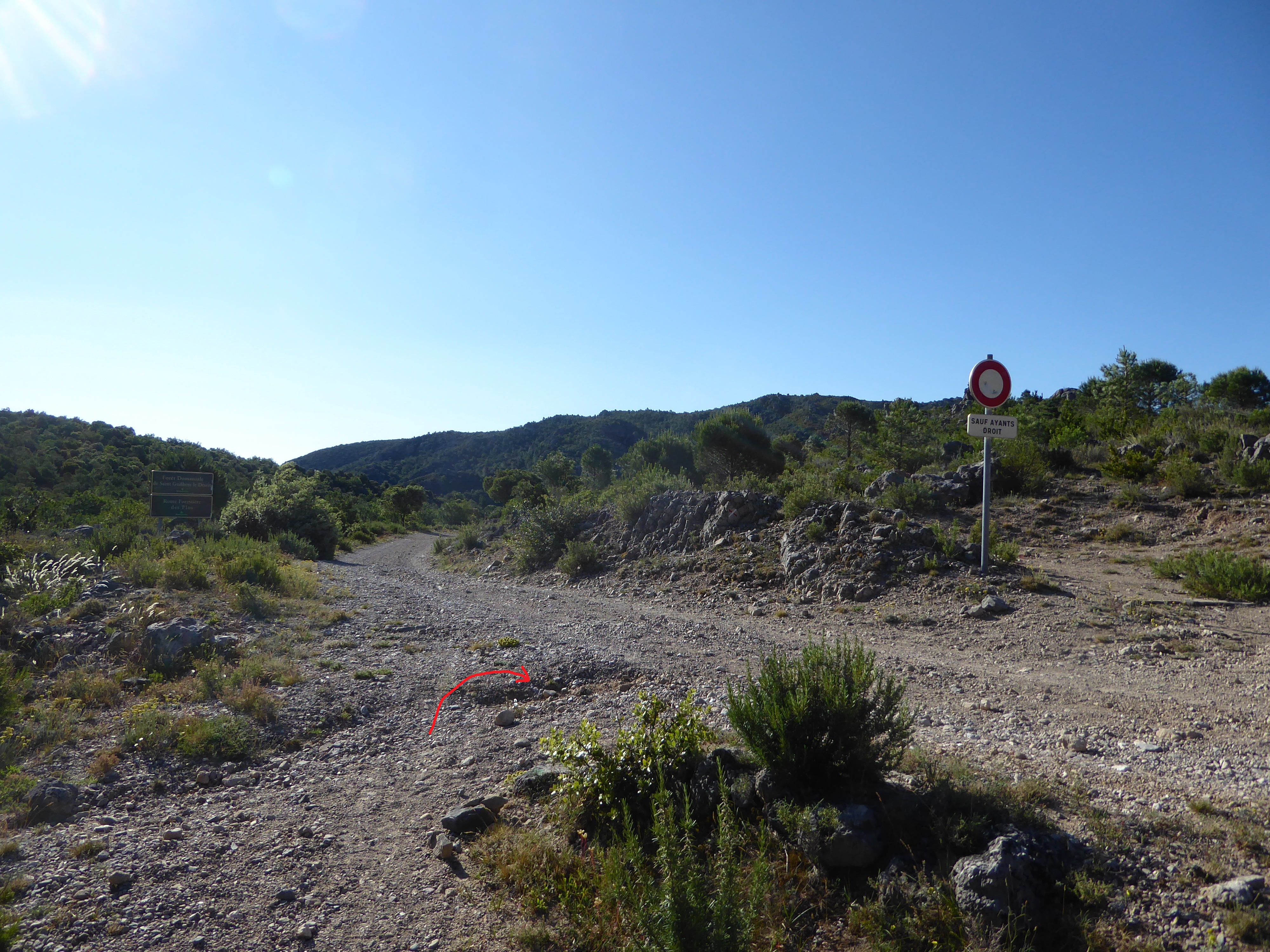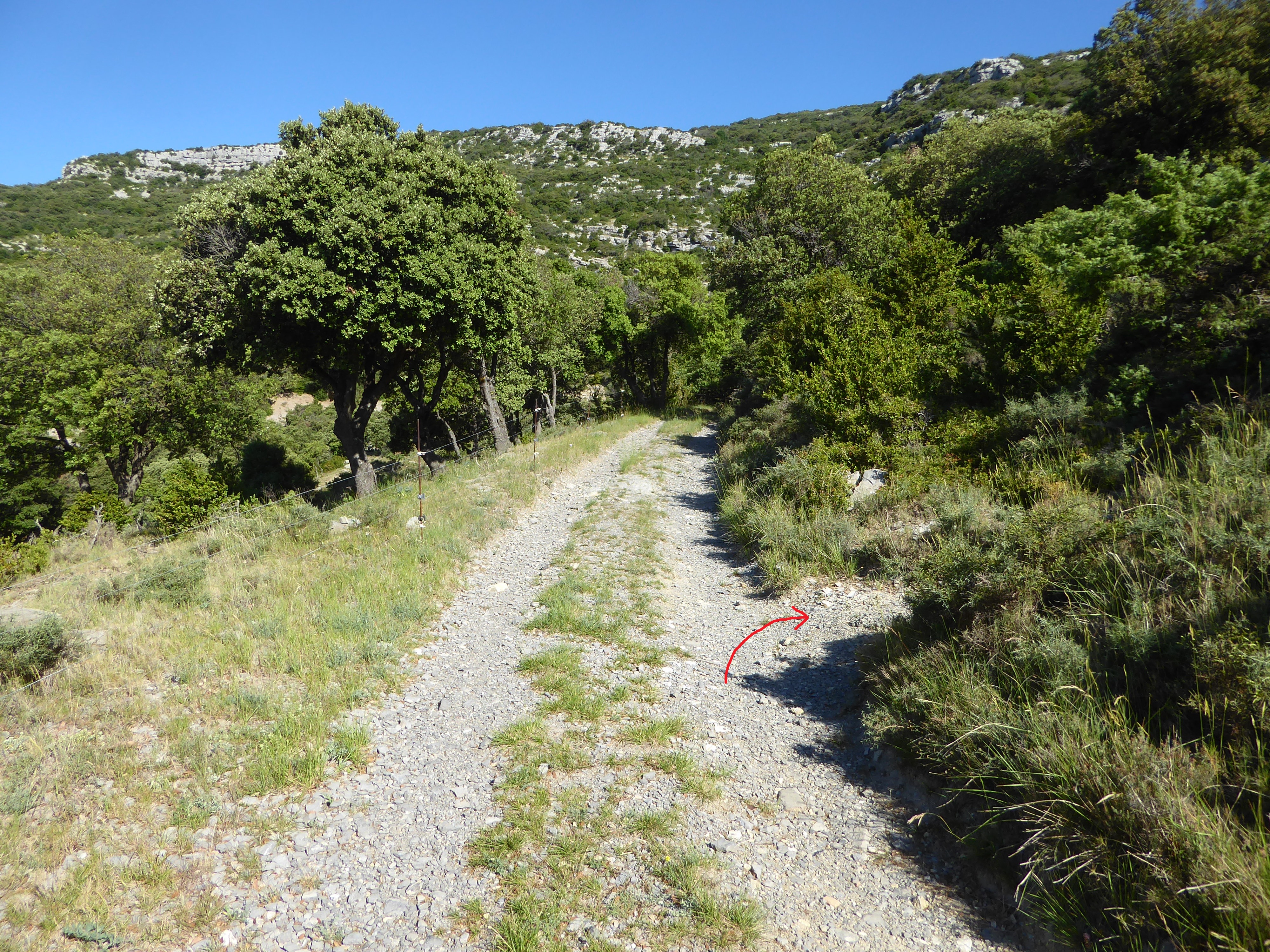 A ce croisement au niveau d'une épingle (600 mètres après le précédent), suivre la piste partant légèrement sur la gauche direction Saint-Guilhem-le-Désert, balisé en rouge et blanc