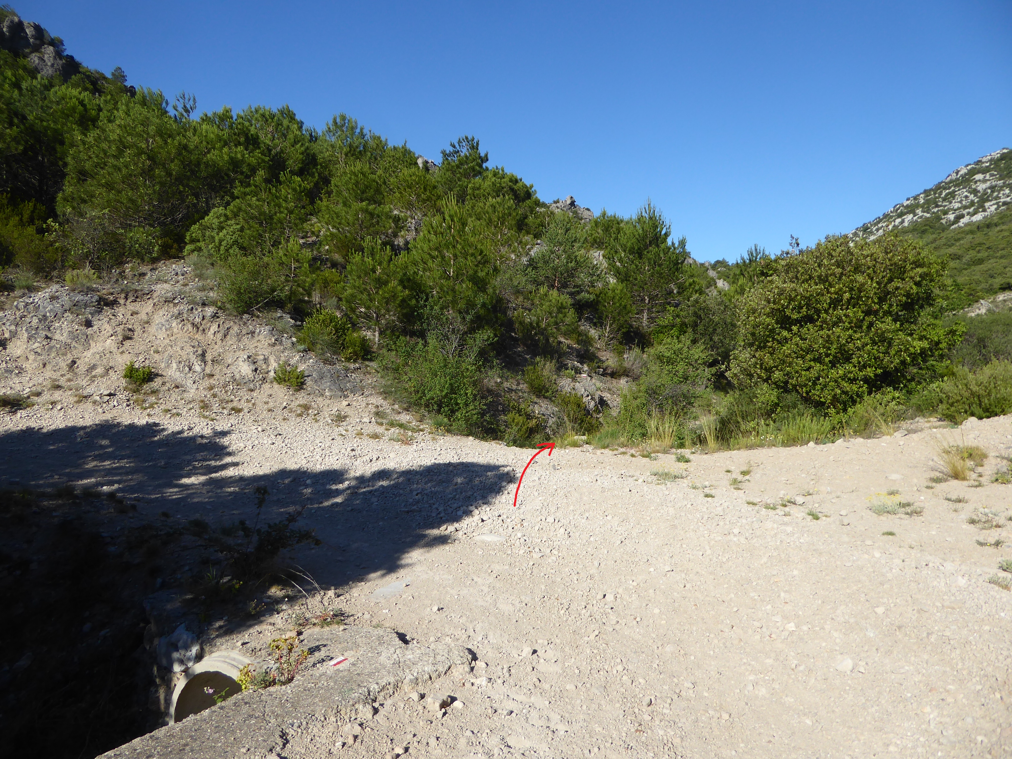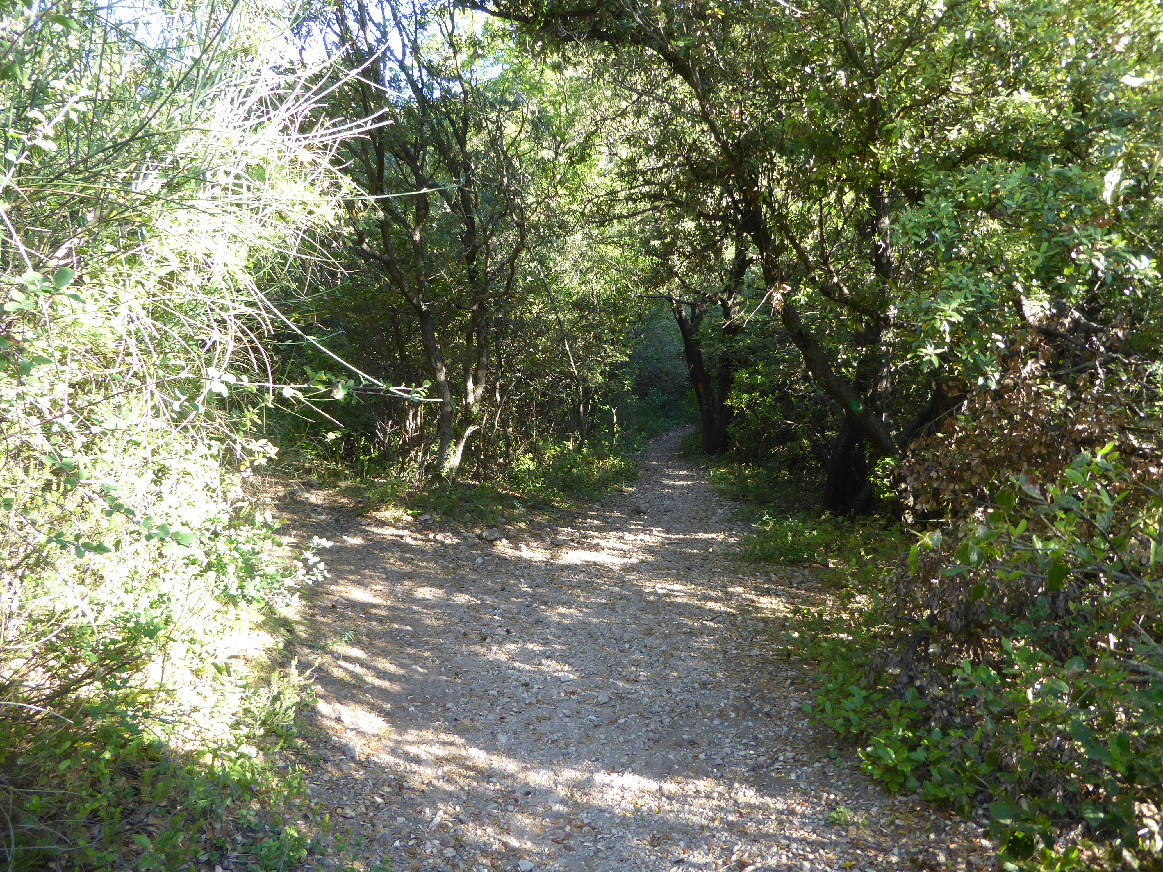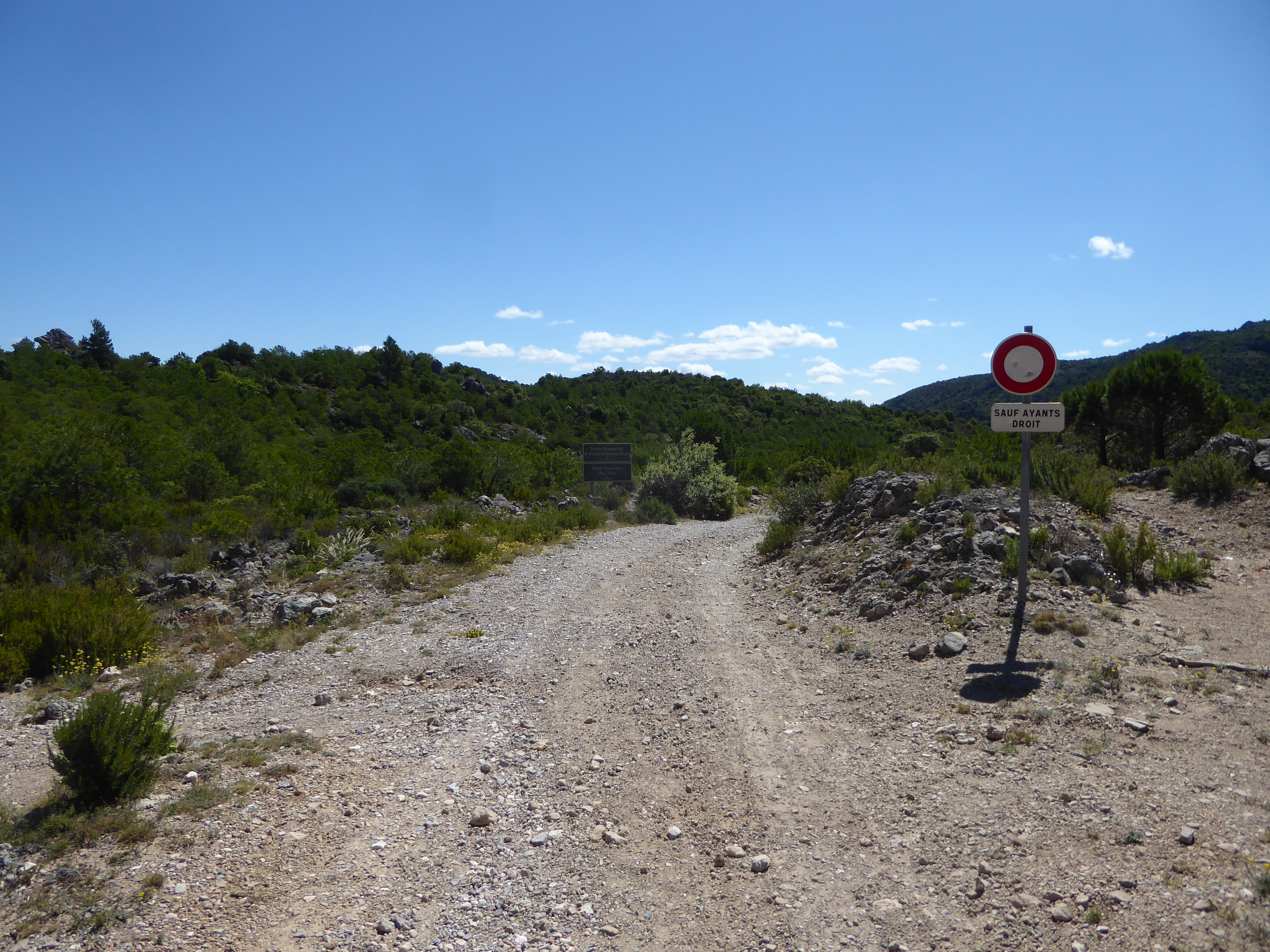 A ce croisement au niveau d'une épingle (600 mètres après le précédent), suivre la piste partant légèrement sur la gauche direction Saint-Guilhem-le-Désert, balisé en rouge et blanc