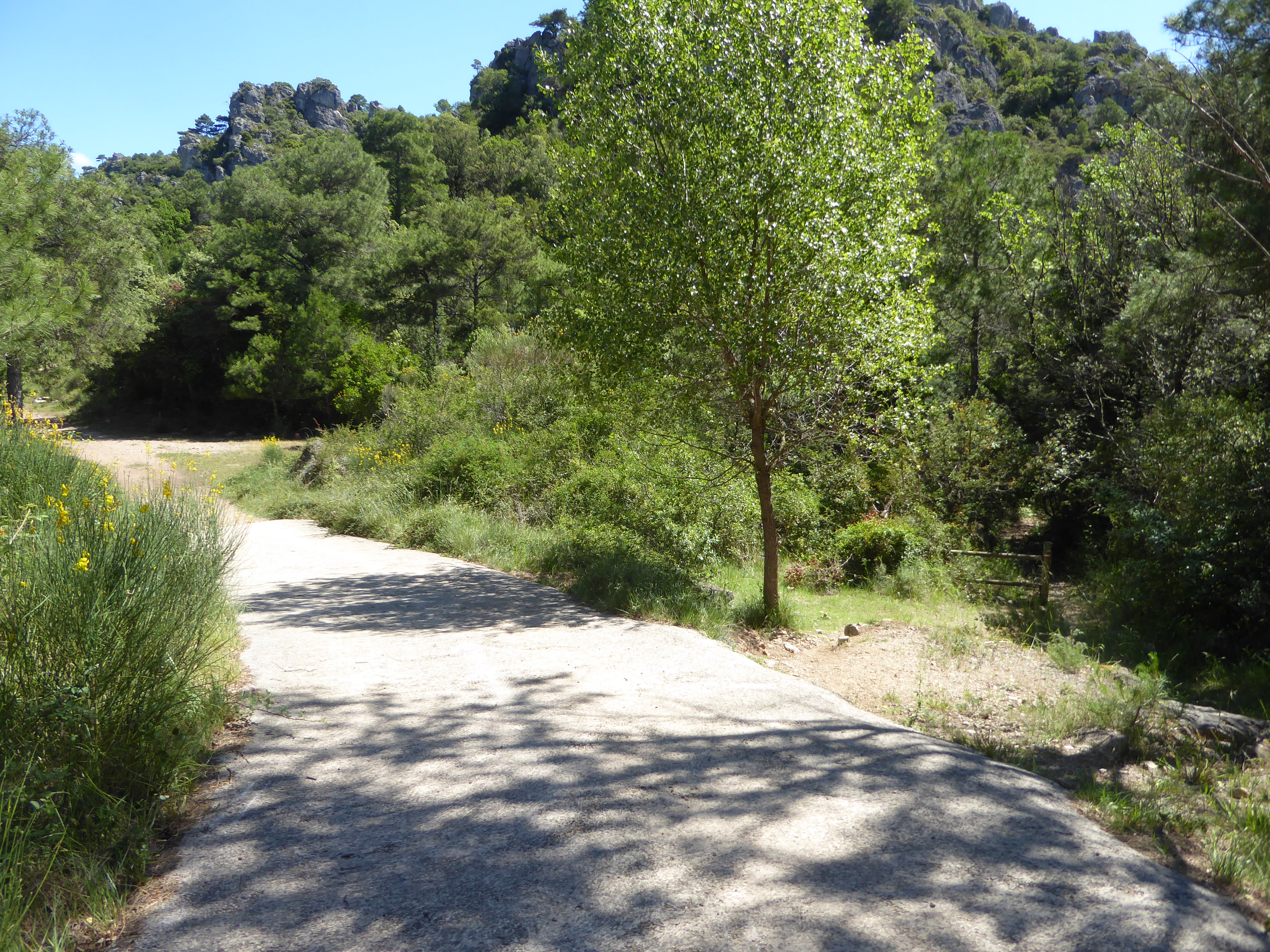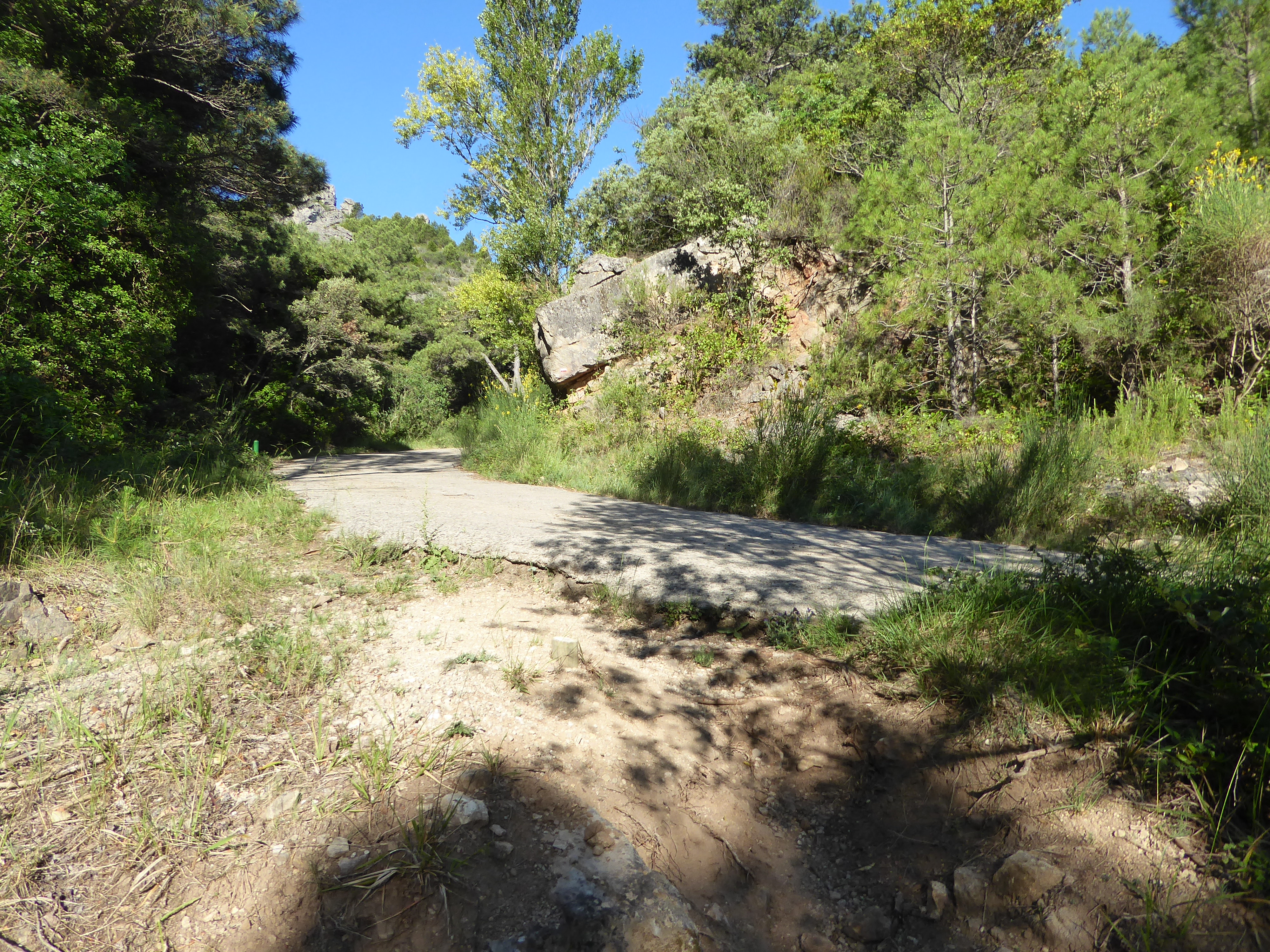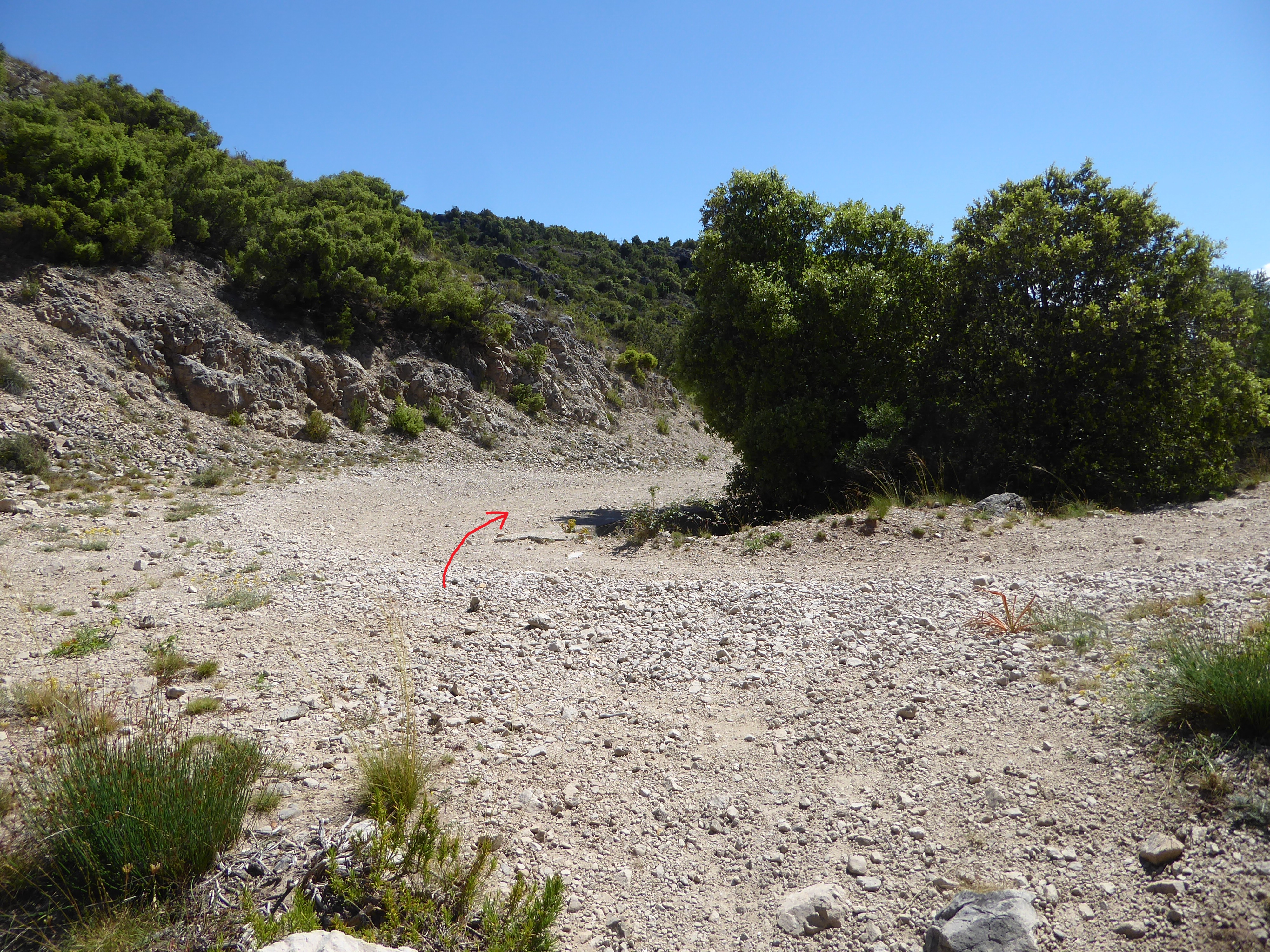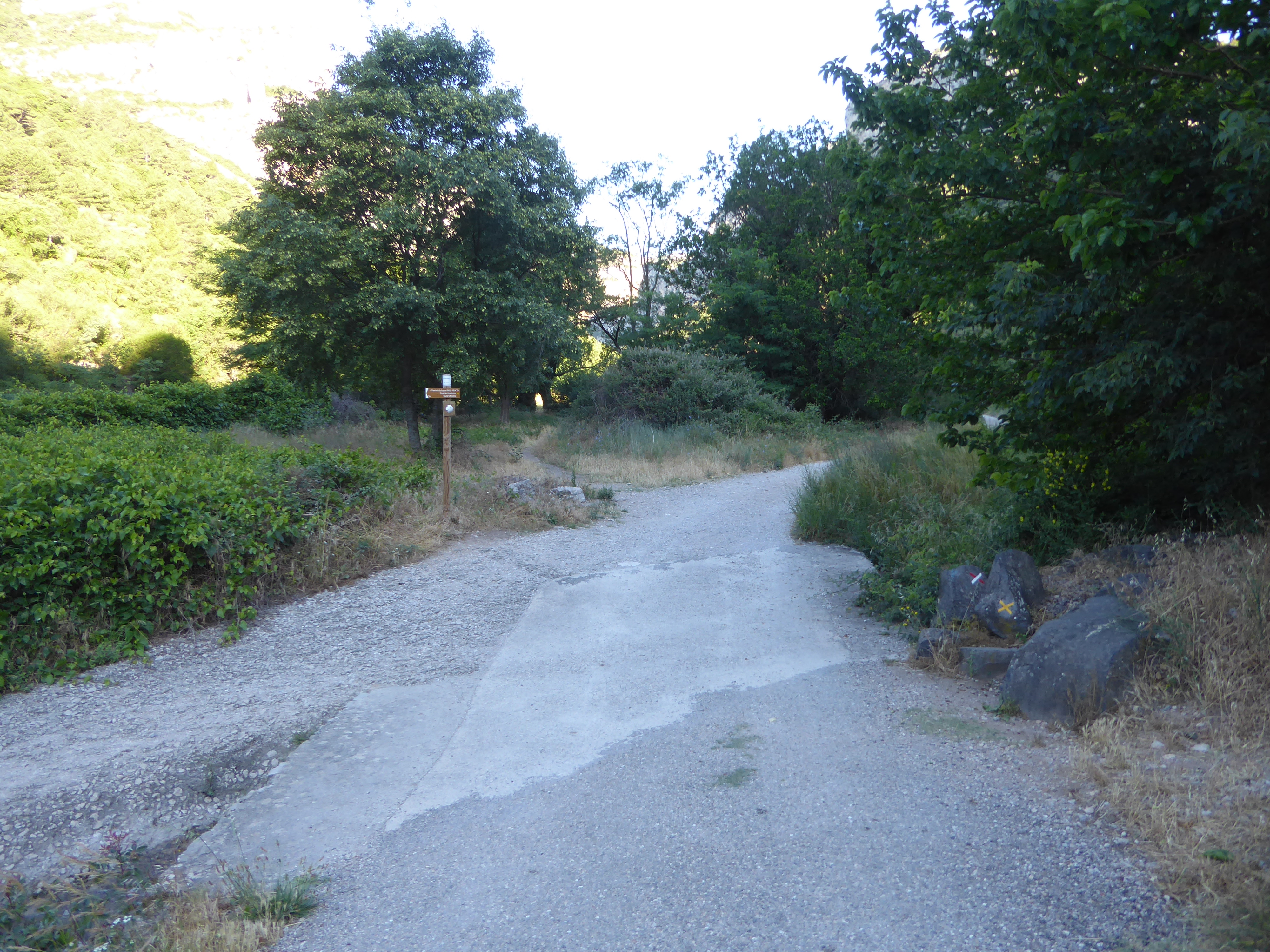 A ce croisement au niveau d'une épingle (600 mètres après le précédent), suivre la piste partant légèrement sur la gauche direction Saint-Guilhem-le-Désert, balisé en rouge et blanc