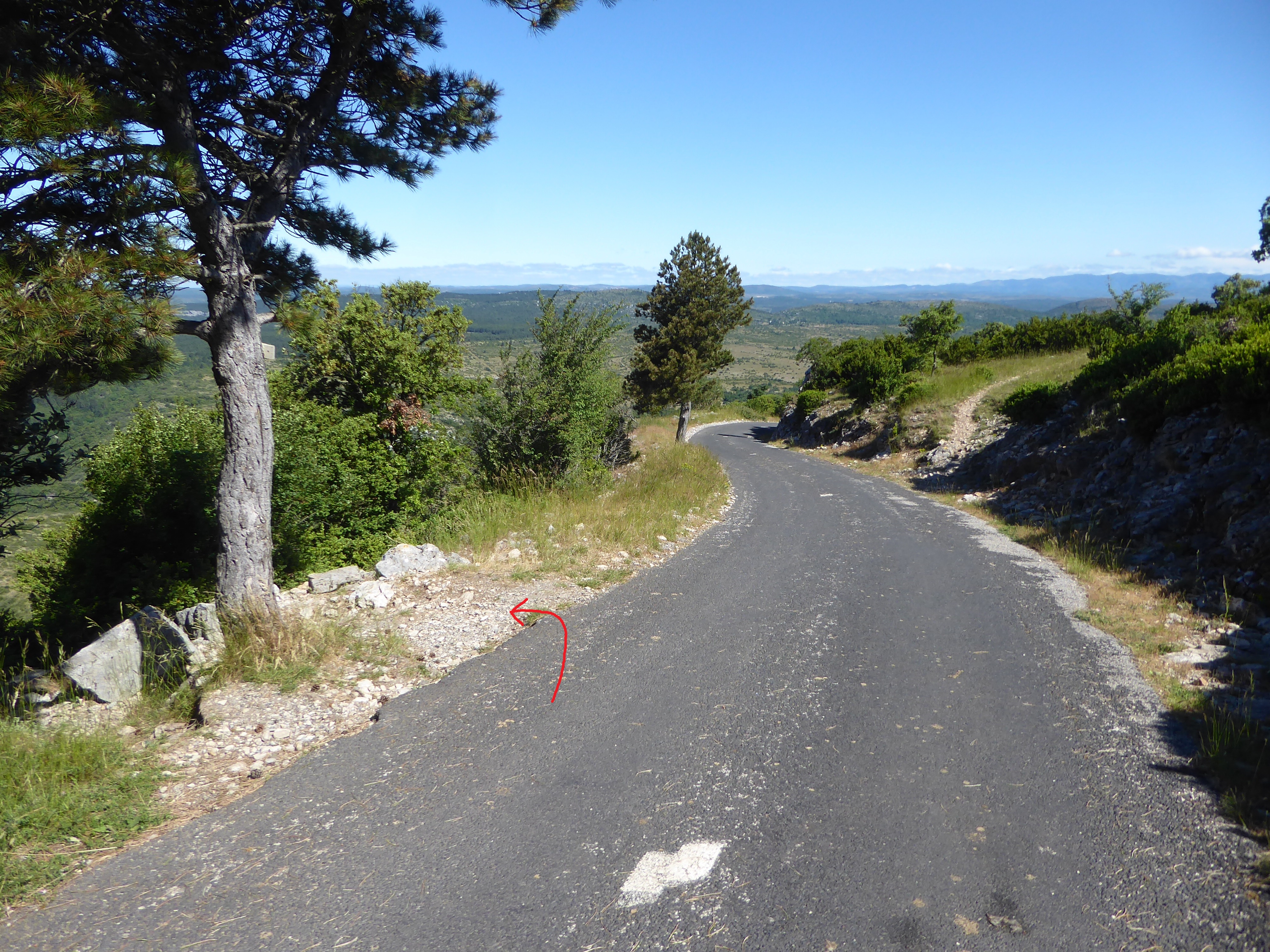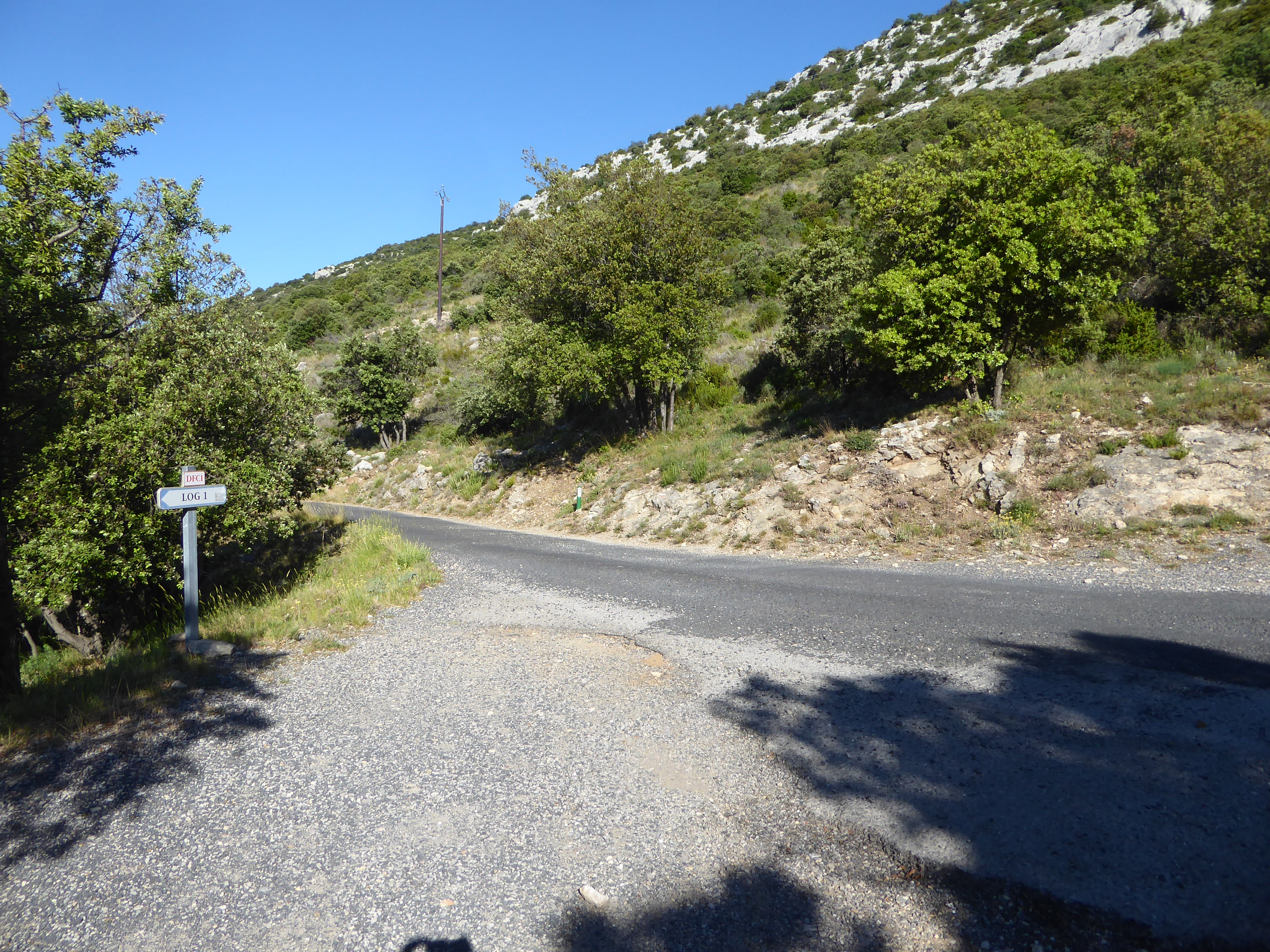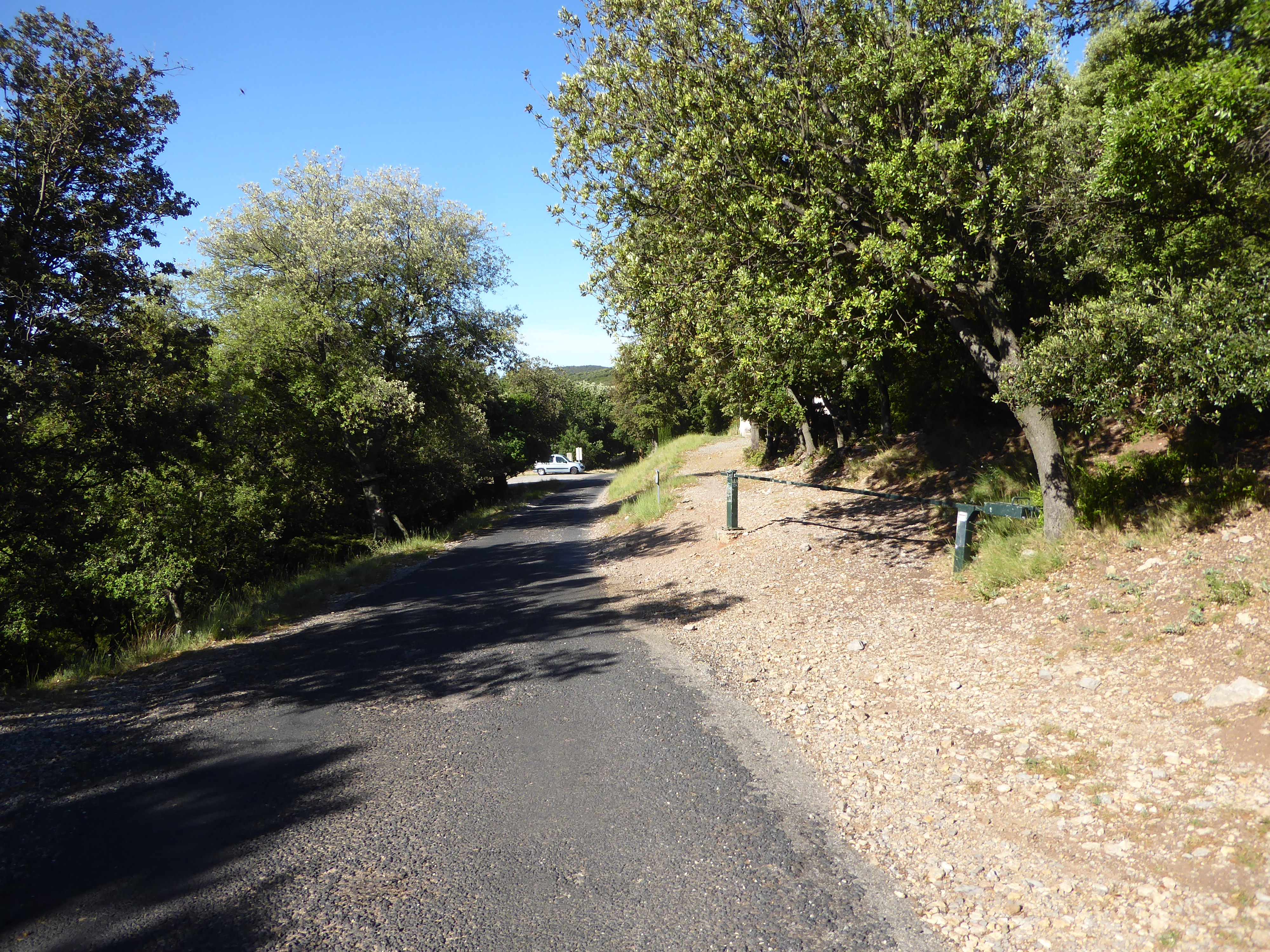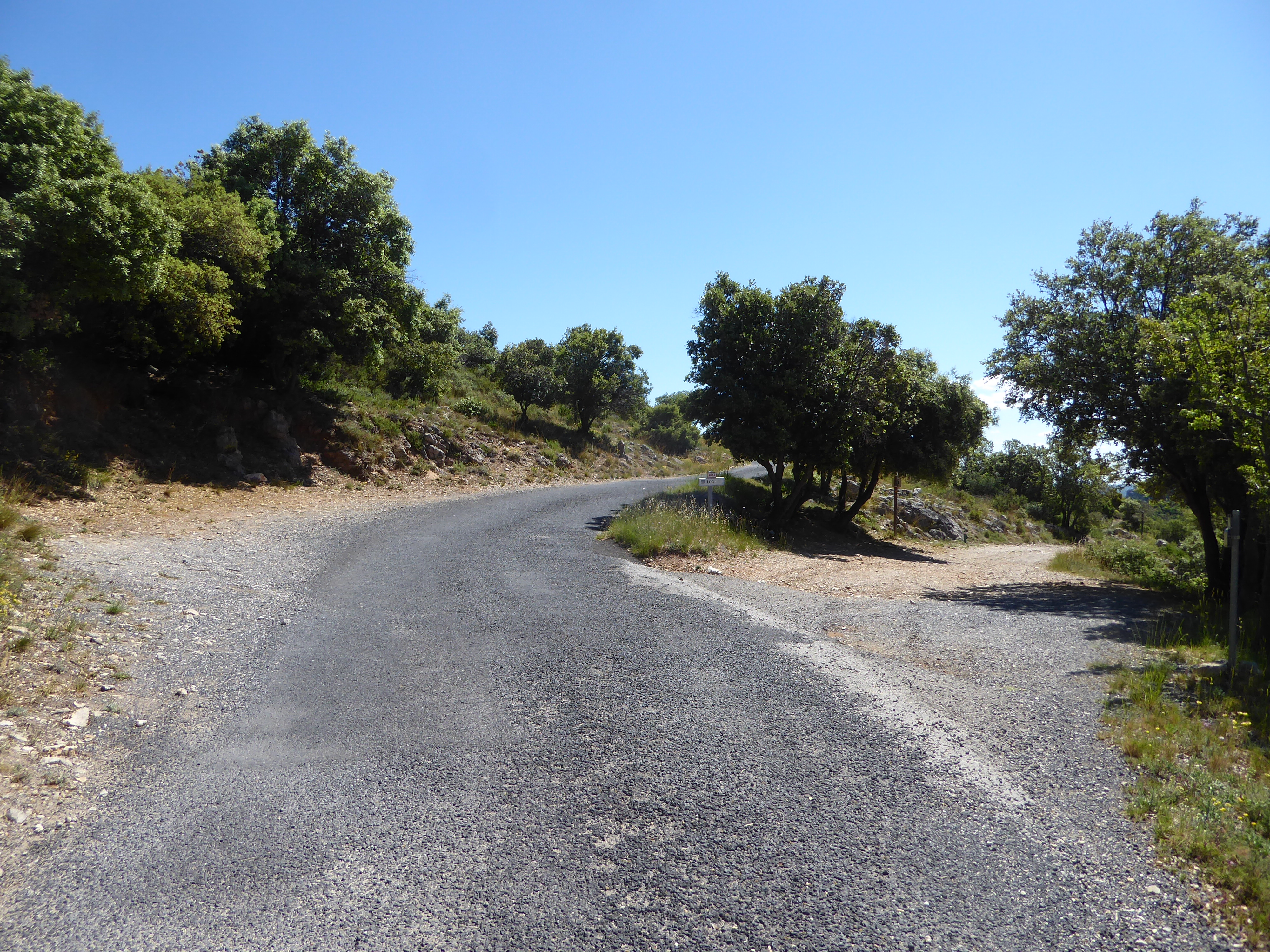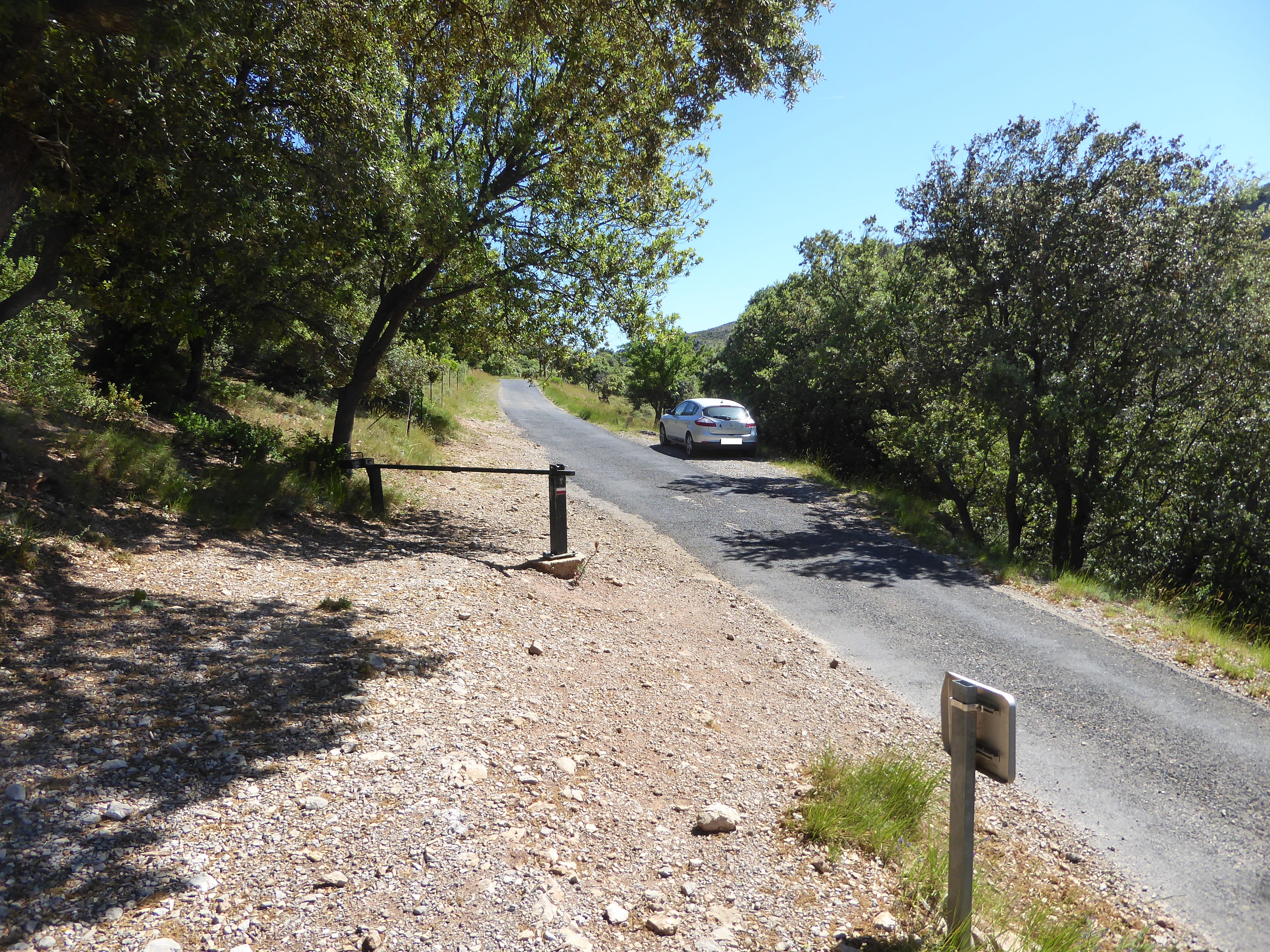 A ce croisement sur la route d'accès au Mont Saint-Baudille (834 m), suivre le chemin qui descend sur la gauche direction Saint-Guilhem-le-Désert, balisé en rouge et blanc dorénavant