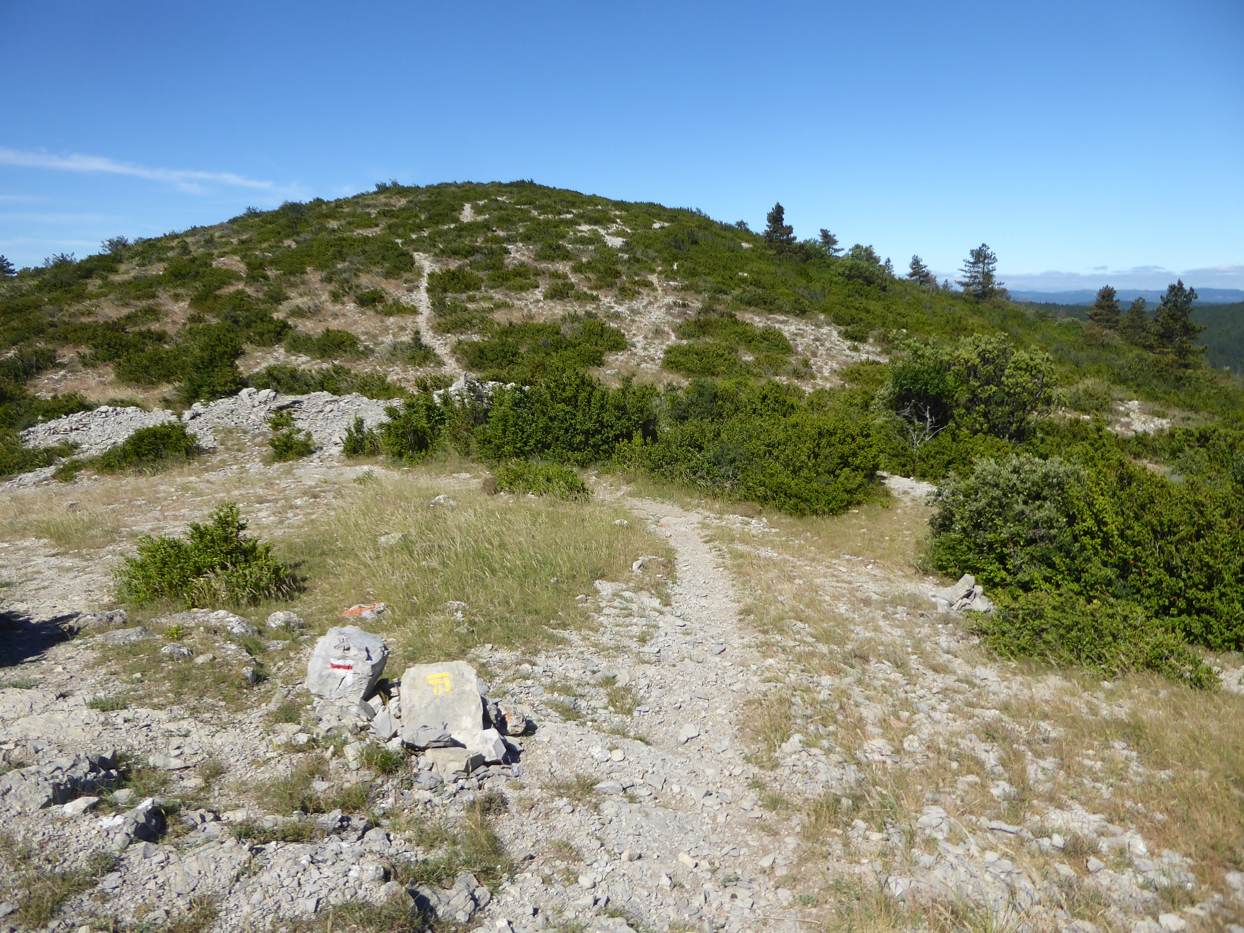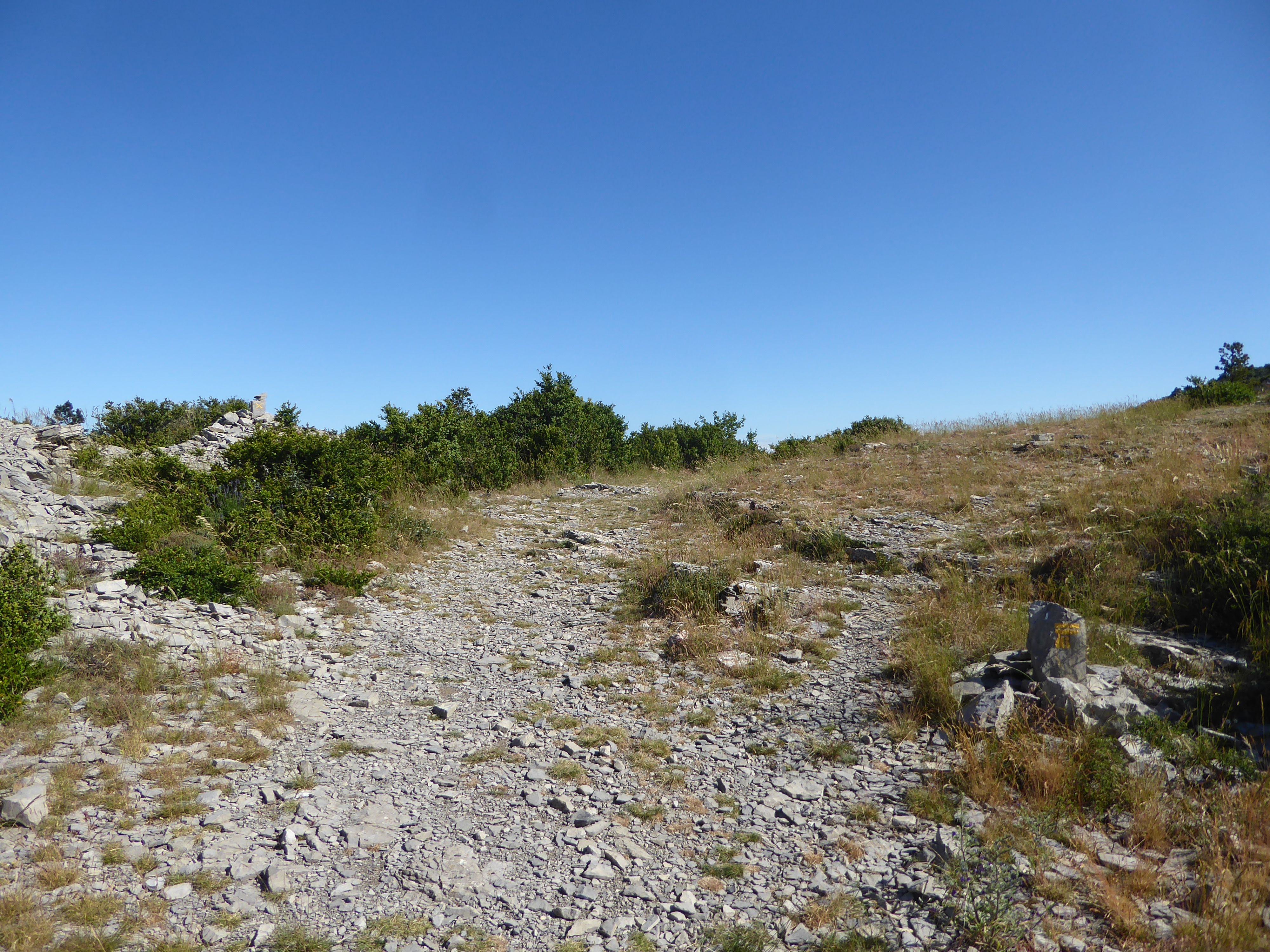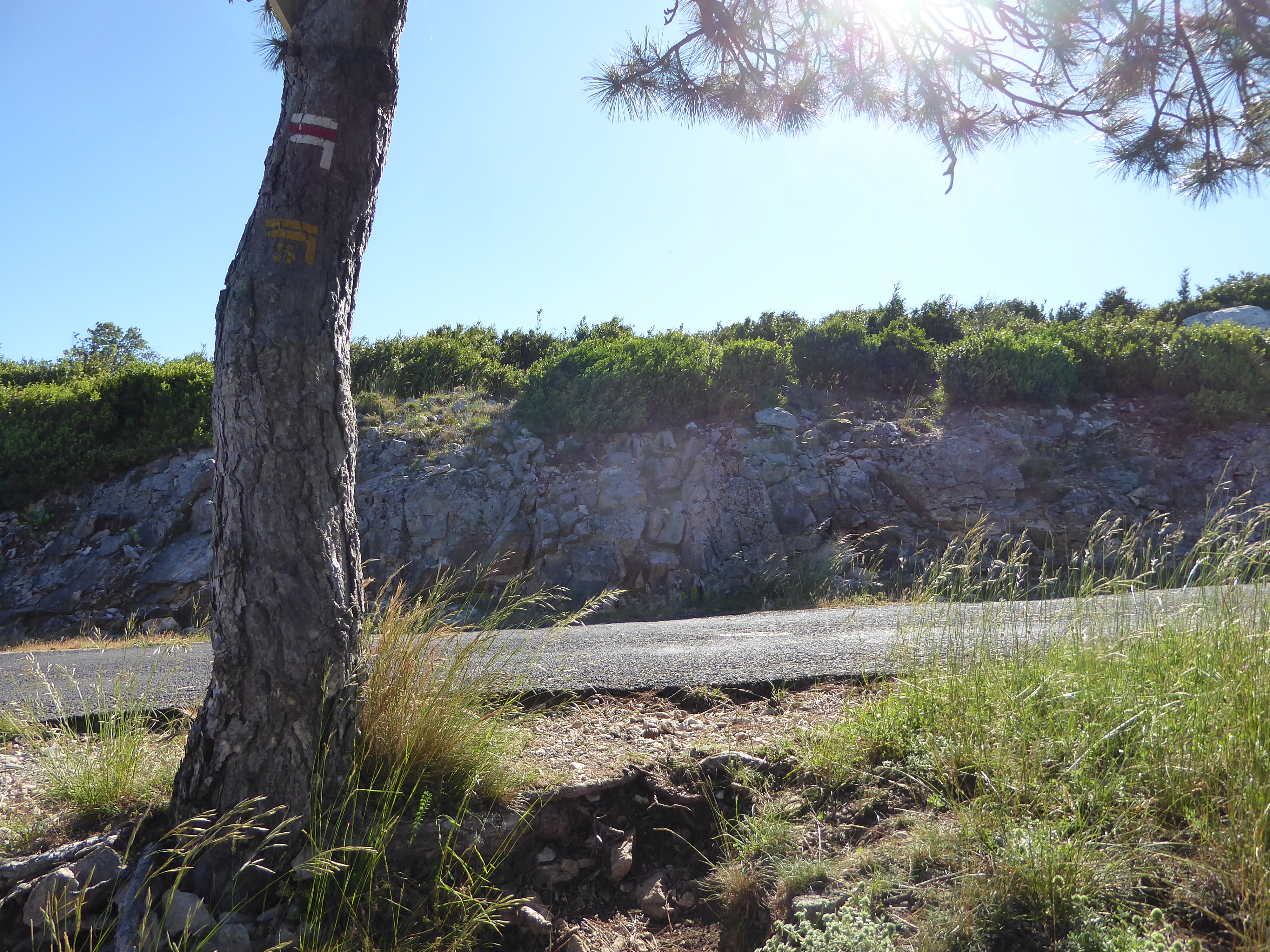 Col (757 m) : suivre le chemin descendant sur la gauche direction Saint-Guilhem-le-Désert, balisé en rouge et blanc