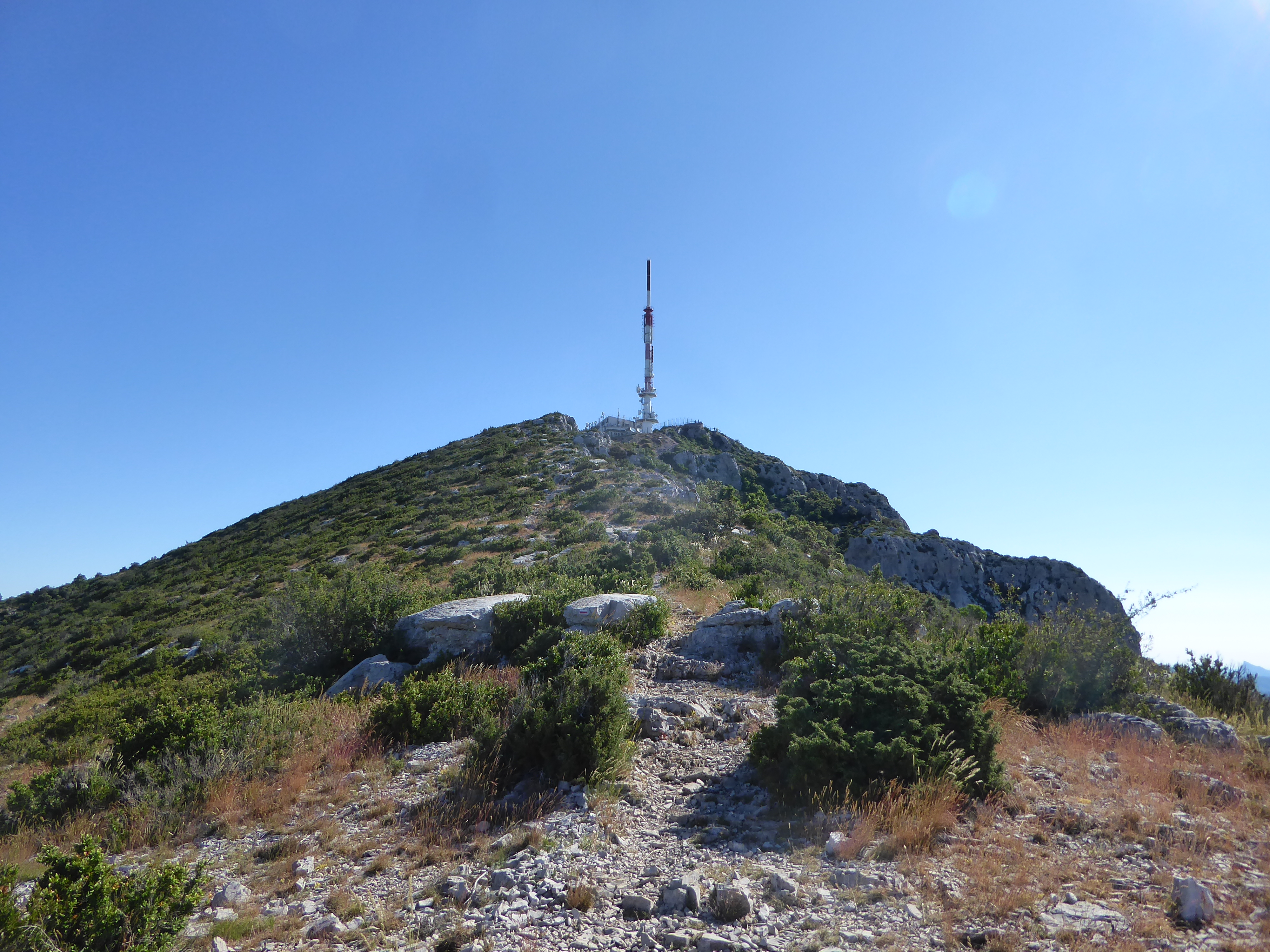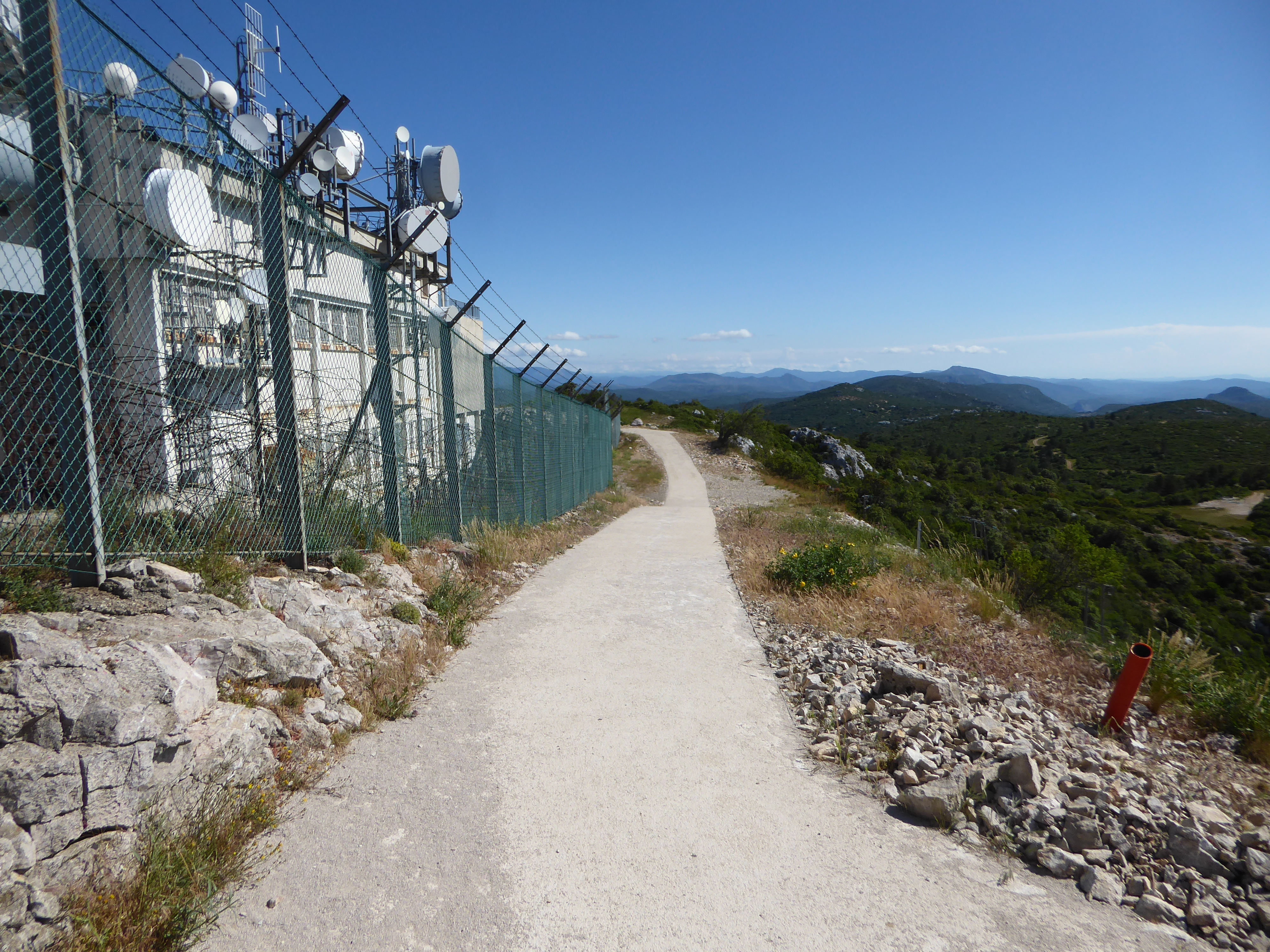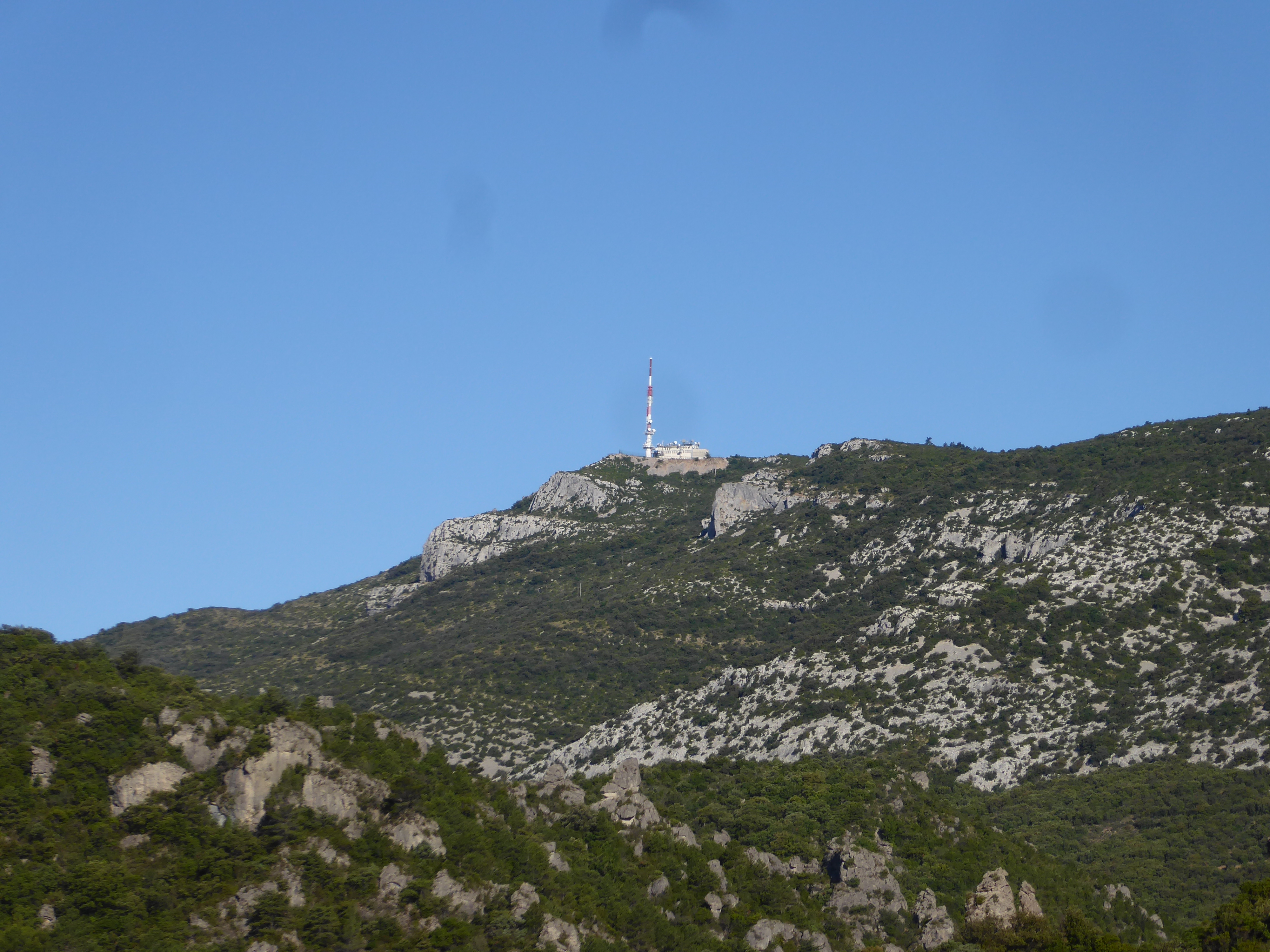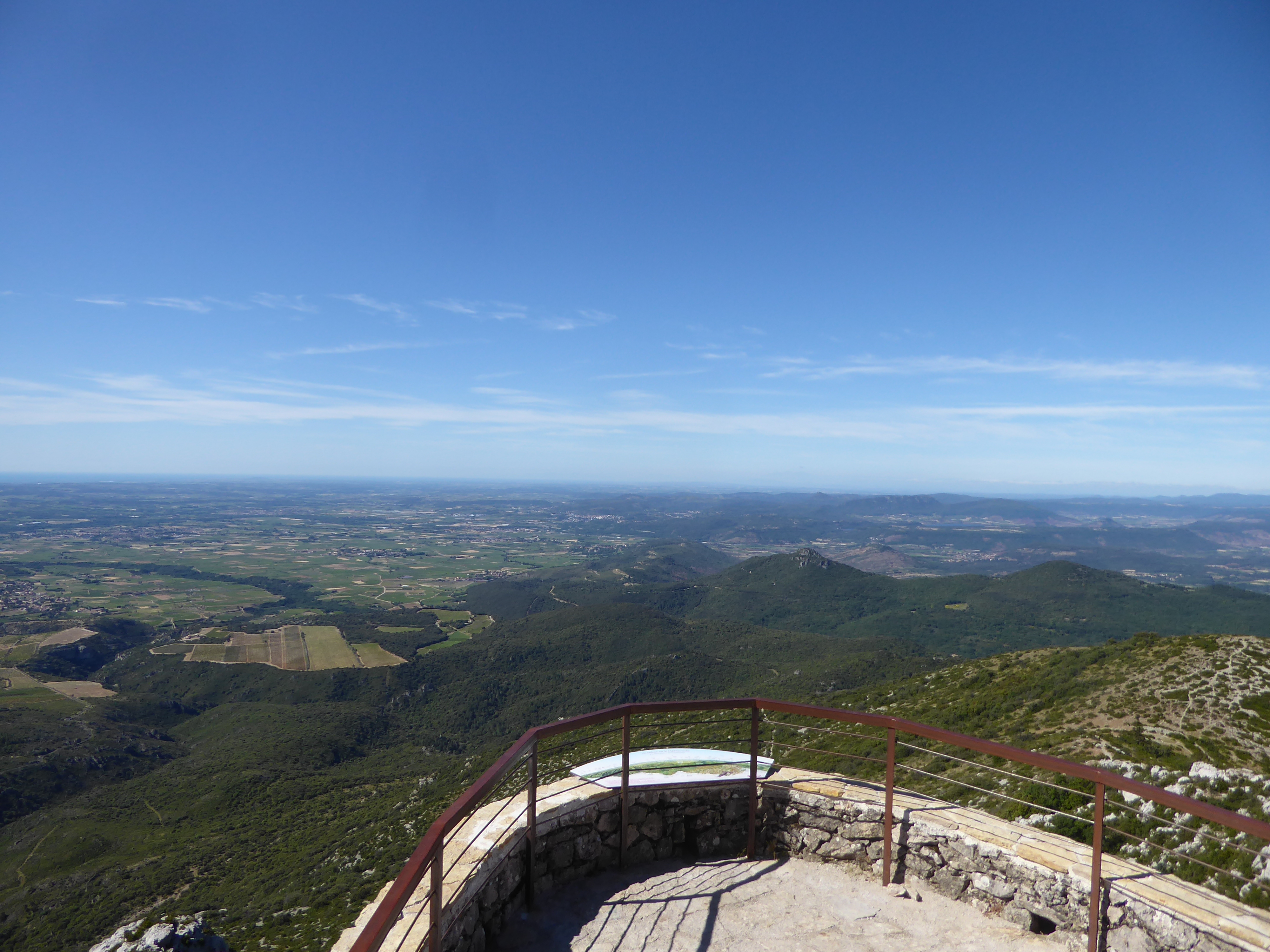 Arrivée au sommet du Mont Saint-Baudille (848 m) : panorama très étendu aujourd'hui des Alpilles jusqu'au massif du Canigou en passant par les Cévennes gardoises et le Causse du Larzac ... belle vue également sur la plaine et notamment le tracé du littoral entre la Camargue et les Pyrénées-Orientales (rassemblement de deux points de vue au niveau de la table d'orientation et derrière l'antenne TV)