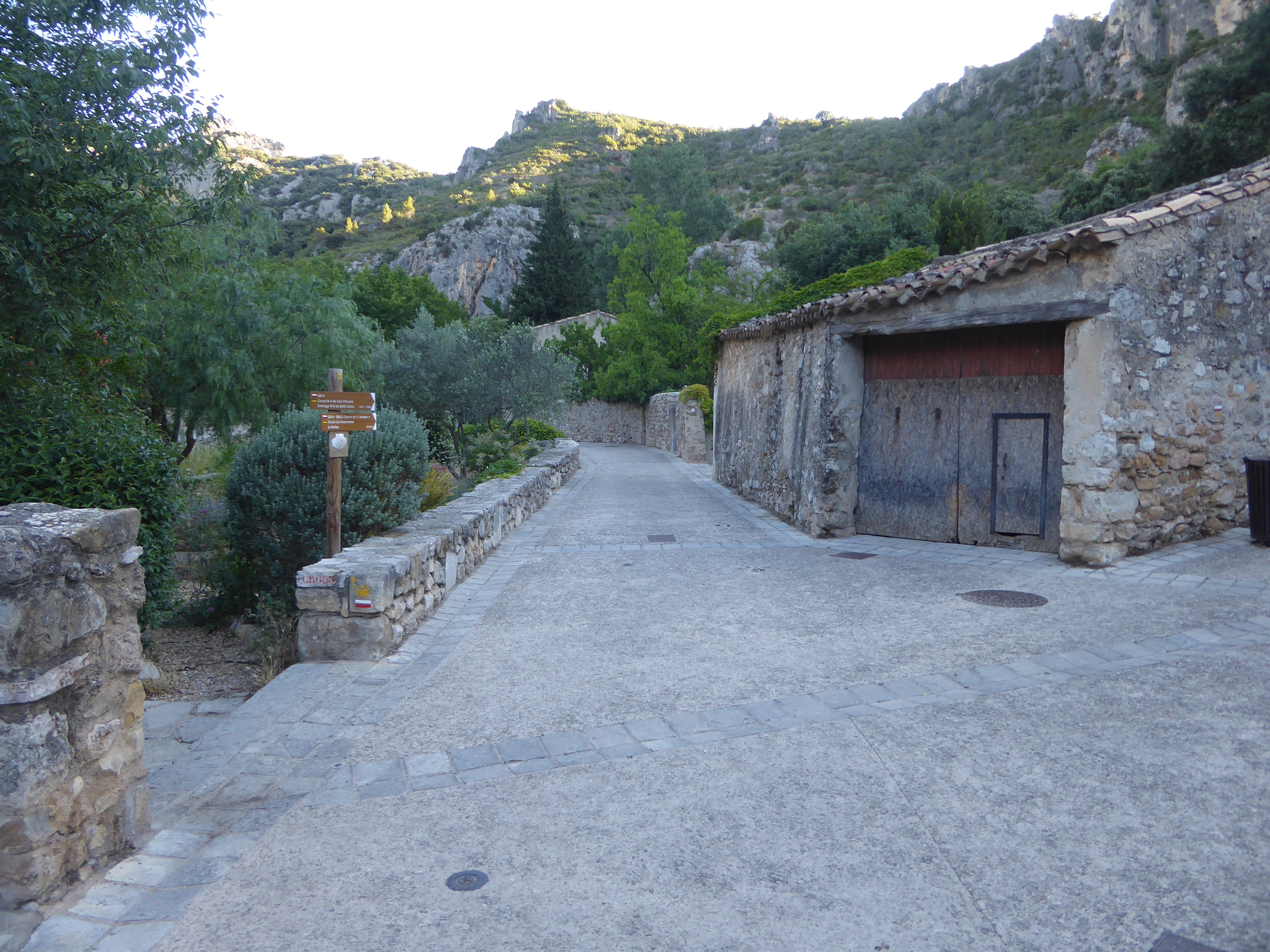 Départ Saint-Guilhem-le-Désert (74 m) : suivre la rue principale du village partant tout droit direction Mont Saint-Baudille, aucun balisage (le but est de passer par le centre du village puis de rejoindre le GR au niveau du parking central du village)